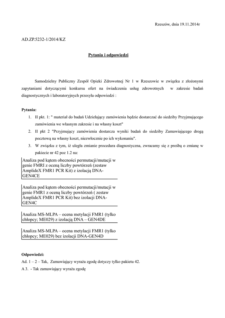 Rzeszów, dnia 19.11.2014r AD.ZP.5232-1/2014/KZ Pytania i odpowiedzi Samodzielny Publiczny Zespół Opieki Zdrowotnej Nr 1 w Rzeszowie w związku z złożonymi zapytaniami dotyczącymi konkursu ofert na świadczenia usług zdrowotnych w zakresie badań diagnostycznych i laboratoryjnych przesyła odpowiedzi : Pytania: 1. II pkt. 1: " materiał do badań Udzielający zamówienia będzie dostarczać do siedziby Przyjmującego zamówienia we własnym zakresie i na własny koszt" 2. II pkt 2 "Przyjmujący zamówienia dostarcza wyniki badań do siedziby Zamawiającego drogą pocztową na własny koszt, niezwłocznie po ich wykonaniu". 3. W związku z tym, iż uległa zmianie procedura diagnostyczna, zwracamy się z prośbą o zmianę w pakiecie nr 42 poz 1.2 na: Analiza pod kątem obecności permutacji/mutacji w genie FMRI z oceną liczby powtórzeń (zestaw AmplideX FMR1 PCR Kit) z izolacją DNAGEN4CE Analiza pod kątem obecności permutacji/mutacji w genie FMR1 z oceną liczby powtórzeń ( zestaw AmplideX FMR1 PCR Kit) bez izolacji DNAGEN4C Analiza MS-MLPA – ocena metylacji FMR1 (tylko chłopcy; ME029) z izolacją DNA – GEN4DE Analiza MS-MLPA – ocena metylacji FMR1 (tylko chłopcy; ME029) bez izolacji DNA-GEN4D Odpowiedzi: Ad. 1 – 2 – Tak, Zamawiający wyraża zgodę dotyczy tylko pakietu 42. A 3. - Tak zamawiający wyraża zgodę Rzeszów, dnia 19.11.2014r AD.ZP.5232-1/2014/KZ Instytut Matki i Dziecka ul. Kasprzaka 17a 01-211 Warszawa Samodzielny Publiczny Zespół Opieki Zdrowotnej Nr 1 w Rzeszowie w związku z złożonymi zapytaniami dotyczącymi konkursu ofert na świadczenia usług zdrowotnych w zakresie badań diagnostycznych i laboratoryjnych przesyła odpowiedzi : Pytania: 1. II pkt. 1: " materiał do badań Udzielający zamówienia będzie dostarczać do siedziby Przyjmującego zamówienia we własnym zakresie i na własny koszt" 2. II pkt 2 "Przyjmujący zamówienia dostarcza wyniki badań do siedziby Zamawiającego drogą pocztową na własny koszt, niezwłocznie po ich wykonaniu". 3. W związku z tym, iż uległa zmianie procedura diagnostyczna, zwracamy się z prośbą o zmianę w pakiecie nr 42 poz 1.2 na: Analiza pod kątem obecności permutacji/mutacji w genie FMRI z oceną liczby powtórzeń (zestaw AmplideX FMR1 PCR Kit) z izolacją DNAGEN4CE Analiza pod kątem obecności permutacji/mutacji w genie FMR1 z oceną liczby powtórzeń ( zestaw AmplideX FMR1 PCR Kit) bez izolacji DNAGEN4C Analiza MS-MLPA – ocena metylacji FMR1 (tylko chłopcy; ME029) z izolacją DNA – GEN4DE Analiza MS-MLPA – ocena metylacji FMR1 (tylko chłopcy; ME029) bez izolacji DNA-GEN4D Odpowiedzi: Ad. 1 – 2 – Tak, Zamawiający wyraża zgodę dotyczy tylko pakietu 42. A 3. - Tak zamawiający wyraża zgodę