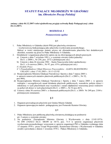 STATUT PAŁACU MŁODZIEŻY W GDAŃSKU im. Obrońców Poczty Polskiej zmiany z dnia 04.12.2007r tekst ujednolicony przyjęty uchwałą Rady Pedagogicznej z dnia 04.12.2007r. ROZDZIAŁ I Postanowienia ogólne §1 Pałac Młodzieży w Gdańsku (skrót PM) jest placówką oświatowo – wychowawczą funkcjonującą jako placówka wychowania pozaszkolnego. Ilekroć w treści niniejszego statutu używa się sformułowania placówka bez dodatkowych określeń, rozumie się przez to Pałac Młodzieży w Gdańsku. 2. Działalność i organizacja placówki opiera się na obowiązujących aktach prawnych: a) Ustawie z dnia 7 września 1991 r. o systemie oświaty (tekst jednolity: Dz.U. z 2004 r., Nr 256, poz. 2572 z późniejszymi zm.) b) Ustawie z dnia 26 stycznia 1982 – Karta Nauczyciela (tekst ujednolicony: Dz.U. z 8 czerwca 2006 r., Nr 97, poz. 674 z późniejszymi zm.) b’) Kodeks Pracy b’’) Ponadzakładowy Układ Zbiorowy Pracowników – KARTA REJESTROWA UKŁADU z dnia 17.03.2003 r. Nr:U-CLVII c) Rozporządzeniu Ministra Edukacji Narodowej i Sportu z dnia 7 marca 2005 r. w sprawie ramowych statutów placówek publicznych (Dz.U. z 2005 r., Nr 52, poz.466), d) Rozporządzeniu Ministra Edukacji Narodowej i Sportu z dnia 7 marca 2005 r. w sprawie rodzajów i szczegółowych zasad działania placówek publicznych, warunków pobytu dzieci i młodzieży w tych placówkach oraz wysokości i zasad odpłatności wnoszonej przez rodziców za pobyt ich dzieci w tych placówkach (Dz.U. z 2005 r., Nr 52 poz.467), e) Ustawa z dnia 30 czerwca 2005 r. o finansach publicznych (Dz.U. z 2005r Nr 249 poz. 2104 z późniejszymi zmianami). 1. §2 1. Organem prowadzącym placówki jest Gmina Miasto Gdańsk. 2. Organem sprawującym nadzór pedagogiczny jest Pomorski Kurator Oświaty. §3 1. Pałac Młodzieży jest publiczną placówką oświatową działającą na podstawie art. 2 ustawy o systemie oświaty. 2. Na podstawie /Zarządzenie Ministra Oświaty i Wychowania z dnia 15.05.1973r. Nr DW 2/4242/2 Dz.U. MOiW nr 10/73, poz. 71/3 w sprawie organizacji placówek wychowania pozaszkolnego/ orzeczenia w sprawie organizacji PM w Gdańsku wydanego dnia 15 sierpnia 1978 r. przez Urząd Wojewódzki, Kuratorium Oświaty i Wychowania w Gdańsku orzekł o powołaniu z dniem 1 września 1978 r. Pałacu Młodzieży w Gdańsku. 1 3. Siedziba Pałacu Młodzieży w Gdańsku mieści się w budynku przy ul. Ogarnej 56. 4. Pałac Młodzieży w Gdańsku prowadzi także działalność w obiekcie przy ulicy Aksamitnej 4 i 4a oraz na przystani żeglarskiej przy ul. Tarcice 17b. 5. W zależności od potrzeb Pałac Młodzieży prowadzi działalność w obiektach udostępnionych przez inne podmioty. 6. Statut niniejszy obowiązuje wszystkich pracowników placówki oraz wychowanków. §4 1. Pałac Młodzieży w Gdańsku posiada własny znak – logo, autorstwa Mirosława Sobolewskiego Kolory: pomarańcz - panton 021 C niebieski - panton 072 C CMYK C O, M 65, Y 100, K 0 CMYK C 100, M 79, Y 0, K 0 2. Pałac Młodzieży w Gdańsku może używać pieczęci o treści zawierającej nazwę placówki, dane identyfikujące ją i dotyczące jej lokalizacji. ROZDZIAŁ II Cele i zadania Pałacu Młodzieży w Gdańsku §5 Celem działalności Pałacu Młodzieży w Gdańsku jest wszechstronne przygotowanie uczestników do życia w demokratycznym i samorządowym społeczeństwie, kształtowanie osobowości uczestników, ujawnianie i rozwijanie ich zainteresowań i uzdolnień, pogłębianie wiedzy i umiejętności, organizowanie czasu wolnego i wypoczynku. §6 Zadania ogólne placówki: 1. Pogłębianie i rozszerzanie wiedzy i umiejętności wykraczających poza programy szkolne. 2. Wspomaganie funkcji opiekuńczo-wychowawczych. 3. Stwarzanie warunków do rozwoju dzieci i młodzieży w sferach artystycznej, naukowej, kulturowej i sportowej. 4. Kształtowanie świadomych i aktywnych odbiorców kultury, promowanie edukacji humanistycznej, rozwój twórczych uzdolnień i talentów. 5. Animowanie i koordynowanie działań kulturalnych w środowisku dzieci i młodzieży. 6. Promowanie działalności dydaktyczno-wychowawczej i organizacyjnej placówki. 7. Poznawanie i kształtowanie szacunku dla środowiska kulturowego. 8. Podnoszenie sprawności fizycznej, rozwijanie i kształtowanie nawyków czynnego wypoczynku i aktywnej rekreacji oraz systematycznego uprawiania wybranej dyscypliny sportowej. 2 Integrowanie dzieci i młodzieży z różnych środowisk, w tym także niepełnosprawnych i zagrożonych patologiami. 10. Prowadzenie zajęć terapeutycznych w różnych formach np. muzykoterapia, arteterapia, gimnastyka korekcyjna, zajęcia z dziećmi dyslektycznymi i inne. 9. §7 Pałac Młodzieży w Gdańsku realizuje swe zadania w szczególności przez: 1. Prowadzenie zajęć wspierających rozwój dzieci i młodzieży, z uwzględnieniem dzieci i młodzieży szczególnie uzdolnionej, mającej na celu: a) rozwijanie zainteresowań, uzdolnień, doskonalenie umiejętności oraz pogłębianie wiedzy, b) kształtowanie umiejętności spędzania czasu wolnego, c) kształtowanie poczucia własnej tożsamości i poszanowania dziedzictwa kulturowego regionu, kraju i innych kultur, d) przygotowanie do aktywnego uczestnictwa w życiu kulturalnym. 2. Organizowanie: a) imprez, w szczególności przeglądów, wystaw, konkursów, festiwali, zawodów, turniejów, pokazów, b) wypoczynku letniego i zimowego dzieci i młodzieży poprzez różne formy wyjazdowe oraz stacjonarne, a także wypoczynku specjalistycznego oraz różnorodnych form rekreacji, c) zajęć i działań alternatywnych wśród dzieci i młodzieży zagrożonych uzależnieniami i niedostosowaniem społecznym. 3. Realizowanie programów edukacyjnych i profilaktyczno – wychowawczych. 4. Organizowanie poradnictwa, konferencji, szkoleń, kursów seminariów, warsztatów, sesji i in. 5. Tworzenie płaszczyzn wymiany i współpracy międzyregionalnej, ogólnopolskiej oraz międzynarodowej dzieci, młodzieży i k