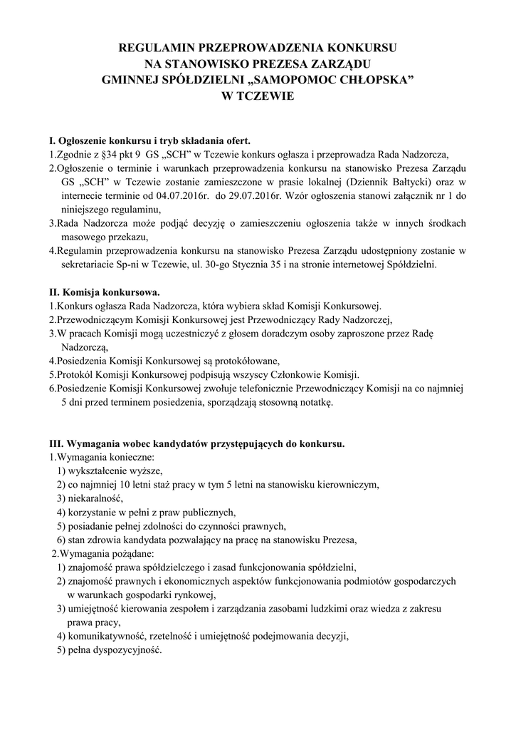 REGULAMIN PRZEPROWADZENIA KONKURSU NA STANOWISKO PREZESA ZARZĄDU GMINNEJ SPÓŁDZIELNI „SAMOPOMOC CHŁOPSKA” W TCZEWIE I. Ogłoszenie konkursu i tryb składania ofert. 1.Zgodnie z §34 pkt 9 GS „SCH” w Tczewie konkurs ogłasza i przeprowadza Rada Nadzorcza, 2.Ogłoszenie o terminie i warunkach przeprowadzenia konkursu na stanowisko Prezesa Zarządu GS „SCH” w Tczewie zostanie zamieszczone w prasie lokalnej (Dziennik Bałtycki) oraz w internecie terminie od 04.07.2016r. do 29.07.2016r. Wzór ogłoszenia stanowi załącznik nr 1 do niniejszego regulaminu, 3.Rada Nadzorcza może podjąć decyzję o zamieszczeniu ogłoszenia także w innych środkach masowego przekazu, 4.Regulamin przeprowadzenia konkursu na stanowisko Prezesa Zarządu udostępniony zostanie w sekretariacie Sp-ni w Tczewie, ul. 30-go Stycznia 35 i na stronie internetowej Spółdzielni. II. Komisja konkursowa. 1.Konkurs ogłasza Rada Nadzorcza, która wybiera skład Komisji Konkursowej. 2.Przewodniczącym Komisji Konkursowej jest Przewodniczący Rady Nadzorczej, 3.W pracach Komisji mogą uczestniczyć z głosem doradczym osoby zaproszone przez Radę Nadzorczą, 4.Posiedzenia Komisji Konkursowej są protokółowane, 5.Protokól Komisji Konkursowej podpisują wszyscy Członkowie Komisji. 6.Posiedzenie Komisji Konkursowej zwołuje telefonicznie Przewodniczący Komisji na co najmniej 5 dni przed terminem posiedzenia, sporządzają stosowną notatkę. III. Wymagania wobec kandydatów przystępujących do konkursu. 1.Wymagania konieczne: 1) wykształcenie wyższe, 2) co najmniej 10 letni staż pracy w tym 5 letni na stanowisku kierowniczym, 3) niekaralność, 4) korzystanie w pełni z praw publicznych, 5) posiadanie pełnej zdolności do czynności prawnych, 6) stan zdrowia kandydata pozwalający na pracę na stanowisku Prezesa, 2.Wymagania pożądane: 1) znajomość prawa spółdzielczego i zasad funkcjonowania spółdzielni, 2) znajomość prawnych i ekonomicznych aspektów funkcjonowania podmiotów gospodarczych w warunkach gospodarki rynkowej, 3) umiejętność kierowania zespołem i zarządzania zasobami ludzkimi oraz wiedza z zakresu prawa pracy, 4) komunikatywność, rzetelność i umiejętność podejmowania decyzji, 5) pełna dyspozycyjność. - 2IV. Zgłoszenie kandydata powinno zawierać: 1. życiorys (CV) wraz ze zdjęciem i list motywacyjny oraz informacje o sposobie kontaktowania się z kandydatem (telefon kontaktowy, adres poczty e-mail), 2. potwierdzone za zgodność z oryginałem kopie dokumentów potwierdzające wykształcenie, 3. kserokopie świadectw pracy, 4. oświadczenie o korzystaniu z pełni praw publicznych, 5. oświadczenie o posiadaniu pełnej zdolności do czynności prawnych, 6. oświadczenie o niekaralności i nie toczeniu się przeciwko kandydatowi postępowania karnego, 7. aktualne zaświadczenie lekarskie stwierdzające bark przeciwwskazań zdrowotnych do pracy na stanowisku Prezesa (wystawione nie wcześniej niż 2 m-ce przed datą upływu terminu składania zgłoszeń), 8. oświadczenie o wyrażeniu zgody na przetwarzanie danych osobowych zawartych w zgłoszeniu dla potrzeb konkursu zgodnie z ustawą z dnia 29.08.1997r. o ochronie danych osobowych, 9. kandydaci mogą składać także inne dokumenty, potwierdzające kwalifikacje lub umiejętności. V. Zgłaszanie kandydatów 1. Warunkiem wzięcia udziału w postępowaniu konkursowym jest złożenie pisemnej oferty, którą należy złożyć w terminie do 29.07.2016r. do godz. 1400. 2. Oferty należy składać osobiście lub przesłać listem poleconym w zamkniętej kopercie z dopiskiem „KONKUS NA PREZESA ZARZĄDU” w sekretariacie Spółdzielni pod adres: Gminna Spółdzielnia „Samopomoc Chłopska” ul. 30-go Stycznia 35 83-110 Tczew w dni robocze w godz. 700 – 1400 od 04.07.2016r. do 29.07.2016r. 3. W przypadku ofert przesyłanych listem poleconym ważna jest data wpływu poczty do Gminnej Spółdzielni „Samopomoc Chłopska” w Tczewie. VI. Procedura konkursowa. 1. Po upływie terminu wyznaczonego do składania ofert Przewodniczący Rady Nadzorczej wyznacza termin posiedzenia Komisji Konkursowej na którym nastąpi otwarcie i wstępna ocena złożonych ofert. 2. Komisja Konkursowa dokona otwarcia i oceny złożonych ofert kandydatów na stanowisko Prezesa Zarządu. 3. Odrzuceniu podlegają oferty które: 1) nie spełniają wymagań określonych w punkcie III, 2) zawierające nie kompletne dokumenty wyszczególnione w punkcie IV, 3) wpłynęły po wyznaczonym terminie składania ofert. VII. Rozstrzygnięcie konkursu. 1. Komisja Konkursowa po otwarciu i ocenie złożonych ofert, może zaprosić wybranych kandydatów na spotkanie w celu odbycia rozmowy rekrutacyjnej, 2. Komisja Konkursowa dokona wyboru Prezesa Zarządu Gminnej Spółdzielni „Samopomoc Chłopska” w Tczewie w drodze tajnego głosowania. 3. Komisja Konkursowa powiadomi drogą elektroniczną kandydatów uczestniczących w postępowaniu konkursowym o jego wynikach oraz dokona zwrotu złożonych dokumentów kandydatom, którzy nie zostali wybrani. -3– 4. W przypadku nie dokonania, w wyniku głosowania tajnego wyboru Prezesa Zarządu wybór może zostać dokonany przez Radę Nadzorczą w postępowaniu rekrutacyjnym bez konieczności powtarzania konkursu. 5. Rada Nadzorcza zastrzega sobie możliwość zakończenia postępowania konkursowego w każdym czasie bez podania przyczyny. VIII. Powołanie Prezesa Zarządu GS „SCH” Tczew 1. Rada Nadzorcza powołuje wybranego kandydata na Prezesa Zarządu i zawiera z Nim umowę o pracę na czas nieokreślony. 2. Powołanie następuje w drodze uchwały. 3. Wynagrodzenie za pracę wybranego Prezesa Zarządu określa uchwała Rady Nadzorczej. IX. Postanowienia końcowe. Niniejszy Regulamin przeprowadzenia Konkursu na stanowisko Prezesa Zarządu Gminnej Spółdzielni „Samopomoc Chłopska” w Tczewie wraz z załącznikiem nr 1 uchwalony został przez Radę Nadzorczą w dniu 22.03.2016r. i stanowi załącznik do Uchwały
