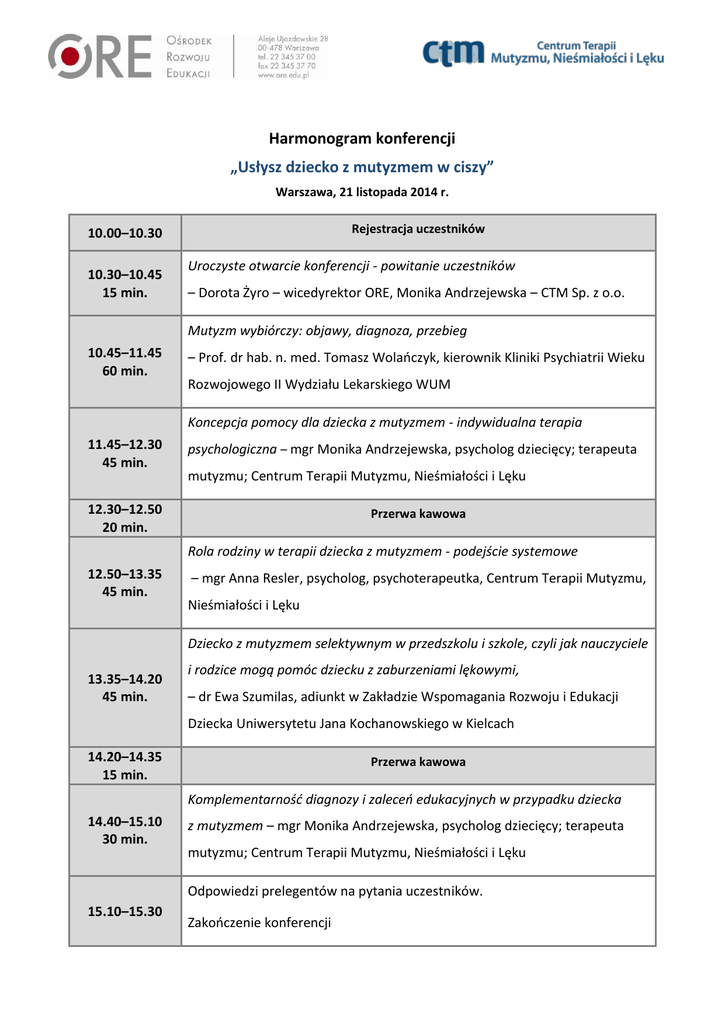Harmonogram konferencji „Usłysz dziecko z mutyzmem w ciszy”