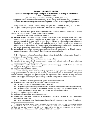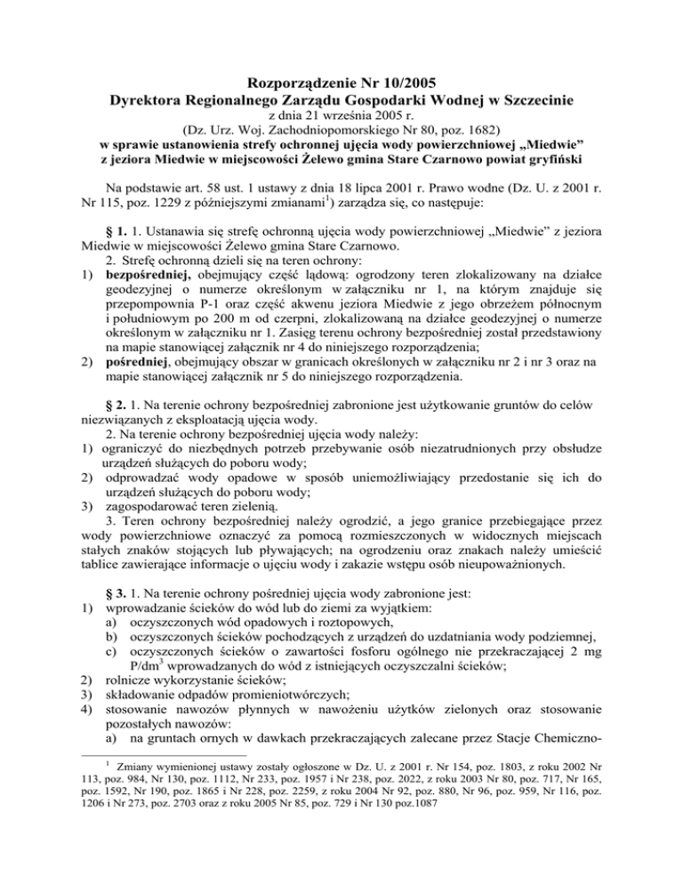 Rozporządzenie Nr 10/2005 Dyrektora Regionalnego Zarządu Gospodarki Wodnej w Szczecinie z dnia 21 września 2005 r. (Dz. Urz. Woj. Zachodniopomorskiego Nr 80, poz. 1682) w sprawie ustanowienia strefy ochronnej ujęcia wody powierzchniowej „Miedwie” z jeziora Miedwie w miejscowości Żelewo gmina Stare Czarnowo powiat gryfiński Na podstawie art. 58 ust. 1 ustawy z dnia 18 lipca 2001 r. Prawo wodne (Dz. U. z 2001 r. Nr 115, poz. 1229 z późniejszymi zmianami1) zarządza się, co następuje: § 1. 1. Ustanawia się strefę ochronną ujęcia wody powierzchniowej „Miedwie” z jeziora Miedwie w miejscowości Żelewo gmina Stare Czarnowo. 2. Strefę ochronną dzieli się na teren ochrony: 1) bezpośredniej, obejmujący część lądową: ogrodzony teren zlokalizowany na działce geodezyjnej o numerze określonym w załączniku nr 1, na którym znajduje się przepompownia P-1 oraz część akwenu jeziora Miedwie z jego obrzeżem północnym i południowym po 200 m od czerpni, zlokalizowaną na działce geodezyjnej o numerze określonym w załączniku nr 1. Zasięg terenu ochrony bezpośredniej został przedstawiony na mapie stanowiącej załącznik nr 4 do niniejszego rozporządzenia; 2) pośredniej, obejmujący obszar w granicach określonych w załączniku nr 2 i nr 3 oraz na mapie stanowiącej załącznik nr 5 do niniejszego rozporządzenia. § 2. 1. Na terenie ochrony bezpośredniej zabronione jest użytkowanie gruntów do celów niezwiązanych z eksploatacją ujęcia wody. 2. Na terenie ochrony bezpośredniej ujęcia wody należy: 1) ograniczyć do niezbędnych potrzeb przebywanie osób niezatrudnionych przy obsłudze urządzeń służących do poboru wody; 2) odprowadzać wody opadowe w sposób uniemożliwiający przedostanie się ich do urządzeń służących do poboru wody; 3) zagospodarować teren zielenią. 3. Teren ochrony bezpośredniej należy ogrodzić, a jego granice przebiegające przez wody powierzchniowe oznaczyć za pomocą rozmieszczonych w widocznych miejscach stałych znaków stojących lub pływających; na ogrodzeniu oraz znakach należy umieścić tablice zawierające informacje o ujęciu wody i zakazie wstępu osób nieupoważnionych. § 3. 1. Na terenie ochrony pośredniej ujęcia wody zabronione jest: 1) wprowadzanie ścieków do wód lub do ziemi za wyjątkiem: a) oczyszczonych wód opadowych i roztopowych, b) oczyszczonych ścieków pochodzących z urządzeń do uzdatniania wody podziemnej, c) oczyszczonych ścieków o zawartości fosforu ogólnego nie przekraczającej 2 mg P/dm3 wprowadzanych do wód z istniejących oczyszczalni ścieków; 2) rolnicze wykorzystanie ścieków; 3) składowanie odpadów promieniotwórczych; 4) stosowanie nawozów płynnych w nawożeniu użytków zielonych oraz stosowanie pozostałych nawozów: a) na gruntach ornych w dawkach przekraczających zalecane przez Stacje Chemiczno1 Zmiany wymienionej ustawy zostały ogłoszone w Dz. U. z 2001 r. Nr 154, poz. 1803, z roku 2002 Nr 113, poz. 984, Nr 130, poz. 1112, Nr 233, poz. 1957 i Nr 238, poz. 2022, z roku 2003 Nr 80, poz. 717, Nr 165, poz. 1592, Nr 190, poz. 1865 i Nr 228, poz. 2259, z roku 2004 Nr 92, poz. 880, Nr 96, poz. 959, Nr 116, poz. 1206 i Nr 273, poz. 2703 oraz z roku 2005 Nr 85, poz. 729 i Nr 130 poz.1087 Rolnicze dawki podstawowe dla danej rośliny uprawnej przy określonej zasobności i rodzaju gleby, b) na użytkach zielonych powyżej 60 kg N/ha w ciągu roku; 5) stosowanie środków ochrony roślin za wyjątkiem środków dopuszczonych do stosowania w strefie ochrony pośredniej źródeł i ujęć wody, wymienionych w rejestrze środków ochrony roślin dopuszczonych do obrotu i stosowania, prowadzonym przez Ministerstwo Rolnictwa i Rozwoju Wsi; 6) lokalizowanie nowych zakładów przemysłowych oraz ferm chowu i hodowli zwierząt opartych o bezściołowy system chowu; 7) urządzanie pastwisk w pasie 50 m od linii brzegowej jezior; 8) pojenie i pławienie zwierząt w jeziorach, ciekach naturalnych i kanałach; 9) lokalizowanie magazynów produktów ropopochodnych, a także rurociągów do ich transportu, za wyjątkiem stacji paliw oraz zbiorników gazu płynnego; 10) lokalizowanie składowisk odpadów komunalnych, niebezpiecznych, innych niż niebezpieczne i obojętne oraz obojętnych; 11) mycie samochodów poza myjniami usługowymi; 12) obsługa i naprawa pojazdów mechanicznych poza terenem zakładów usługowych prowadzących taką działalność na podstawie odrębnych przepisów; 13) lokalizowanie nowych cmentarzy oraz grzebanie zwłok zwierzęcych; 14) używanie sprzętu agrolotniczego do przeprowadzania zabiegów rolniczych; 15) urządzanie pryzm kiszonkowych i składowanie obornika bezpośrednio na gruncie; 16) wydobywanie żwiru, piasku, torfu a także usuwanie roślin z wód lub linii brzegowej jezior Płoń, Miedwie i Będgoszcz; 17) chów lub hodowla ryb łososiowatych (Salmonidae) w stawach hodowlanych za wyjątkiem siei (Coregonus lavaretus) i sielawy (Coregonus albula); 18) lokalizowanie budownictwa mieszkalnego i turystycznego w odległości mniejszej niż 50 m od linii brzegowej jezior: Miedwie, Płoń i Będgoszcz; 19) wykonywanie robót melioracyjnych polegających na obniżaniu poziomu wód gruntowych na obszarach występowania gruntów hydrogenicznych; 20) usuwanie drzew i krzewów w odległości do 50 m od linii brzegowej jezior Miedwie, Płoń i Będgoszcz, za wyjątkiem przypadków zagrożenia bezpieczeństwa ludzi i mienia, zabiegów pielęgnacyjnych i w związku z utrzymaniem urządzeń wodnych; 21) usuwanie roślin wodnych z koryt cieków naturalnych i kanałów w czasie trwania sezonu wegetacyjnego; 22) użytkowanie pojazdów wodnych o napędzie spalinowym, za wyjątkiem pojazdów podmiotów uprawnionych do rybactwa, służb ratowniczych, organów kontrolnych i właściciela wody wykonujących czynności służbowe; 23) lokalizowanie pomostów poza odcinkami linii brzegowej jezior Miedwie, Płoń i Będgoszcz, na których nie występuj