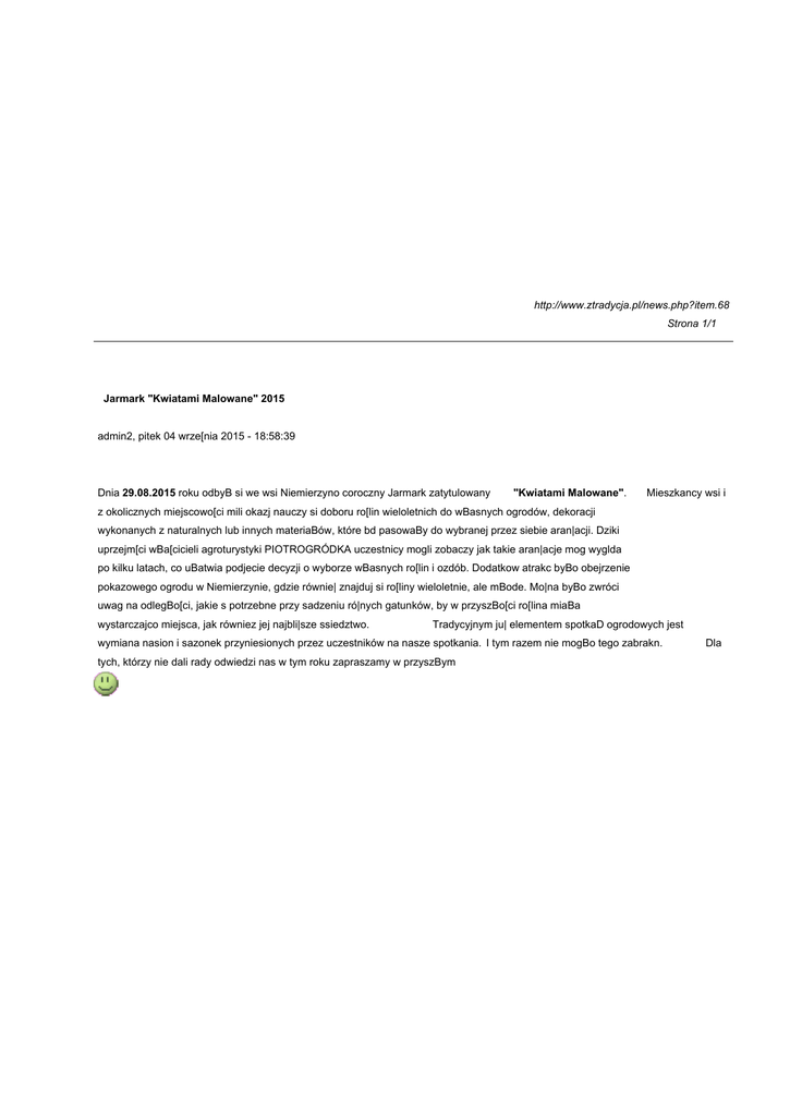 http://www.ztradycja.pl/news.php?item.68 Strona 1/1 Jarmark "Kwiatami Malowane" 2015 admin2, pitek 04 wrze[nia 2015 - 18:58:39 Dnia 29.08.2015 roku odbyB si we wsi Niemierzyno coroczny Jarmark zatytulowany "Kwiatami Malowane". Mieszkancy wsi i z okolicznych miejscowo[ci mili okazj nauczy si doboru ro[lin wieloletnich do wBasnych ogrodów, dekoracji wykonanych z naturalnych lub innych materiaBów, które bd pasowaBy do wybranej przez siebie aran|acji. Dziki uprzejm[ci wBa[cicieli agroturystyki PIOTROGRÓDKA uczestnicy mogli zobaczy jak takie aran|acje mog wyglda po kilku latach, co uBatwia podjecie decyzji o wyborze wBasnych ro[lin i ozdób. Dodatkow atrakc byBo obejrzenie pokazowego ogrodu w Niemierzynie, gdzie równie| znajduj si ro[liny wieloletnie, ale mBode. Mo|na byBo zwróci uwag na odlegBo[ci, jakie s potrzebne przy sadzeniu ró|nych gatunków, by w przyszBo[ci ro[lina miaBa wystarczajco miejsca, jak równiez jej najbli|sze ssiedztwo. Tradycyjnym ju| elementem spotkaD ogrodowych jest wymiana nasion i sazonek przyniesionych przez uczestników na nasze spotkania. I tym razem nie mogBo tego zabrakn. tych, którzy nie dali rady odwiedzi nas w tym roku zapraszamy w przyszBym Dla