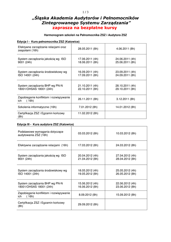 1/3 „Śląska Akademia Audytorów i Pełnomocników Zintegrowanego Systemu Zarządzania” zaprasza na bezpłatne kursy Harmonogram szkoleń na Pełnomocnika ZSZ i Audytora ZSZ Edycja I - Kurs pełnomocnika ZSZ (Katowice) Efektywne zarządzanie relacjami oraz zespołami (16h) 28.05.2011 (8h) 4.06.2011 (8h) System zarządzania jakością wg ISO 9001 (24h) 17.06.2011 (4h) 18.06.2011 (8h) 24.06.2011 (4h) 25.06.2011 (8h) System zarządzania środowiskowy wg ISO 14001 (24h) 16.09.2011 (4h) 17.09.2011 (8h) 23.09.2011 (4h) 24.09.2011 (8h) System zarządzania BHP wg PN-N 18001/OHSAS 18001 (24h) 21.10.2011 (4h) 22.10.2011 (8h) 28.10.2011 (4h) 29.10.2011 (8h) Zapobieganie konfliktom i rozwiązywanie ich ( 16h) 26.11.2011 (8h) 3.12.2011 (8h) Szkolenia informatyczne (16h) 7.01.2012 (8h) 14.01.2012 (8h) Certyfikacja ZSZ i Egzamin końcowy (8h) 11.02.2012 (8h) Edycja III - Kurs audytora ZSZ (Katowice) Podstawowe wymagania dotyczące audytowania ZSZ (16h) 03.03.2012 (8h) 10.03.2012 (8h) Efektywne zarządzanie relacjami (16h) 17.03.2012 (8h) 24.03.2012 (8h) System zarządzania jakością wg ISO 9001 (24h) 20.04.2012 (4h) 21.04.2012 (8h) 27.04.2012 (4h) 28.04.2012 (8h) System zarządzania środowiskowy wg ISO 14001 (24h) 18.05.2012 (4h) 19.05.2012 (8h) 25.05.2012 (4h) 26.05.2012 (8h) System zarządzania BHP wg PN-N 18001/OHSAS 18001 (24h) 15.06.2012 (4h) 16.06.2012 (8h) 22.06.2012 (4h) 23.06.2012 (8h) Zapobieganie konfliktom i rozwiązywanie ich ( 16h) 8.09.2012 (8h) 15.09.2012 (8h) Certyfikacja ZSZ i Egzamin końcowy (8h) 29.09.2012 (8h) 2/3 Edycja II - Kurs pełnomocnika ZSZ (Częstochowa) Efektywne zarządzanie relacjami oraz zespołami (16h) 4.06.2011 (8h) 11.06.2011 (8h) System zarządzania jakością wg ISO 9001 (24h) 2.09.2011 (4h) 3.09.2011 (8h) 9.09.2011 (4h) 10.09.2011 (8h) System zarządzania środowiskowy wg ISO 14001 (24h) 7.10.2011 (4h) 8.10.2011 (8h) 14.10.2011 (4h) 15.10.2011 (8h) System zarządzania BHP wg PN-N 18001/OHSAS 18001 (24h) 4.11.2011 (4h) 5.11.2011 (8h) 18.11.2011 (4h) 19.11.2011 (8h) Zapobieganie konfliktom i rozwiązywanie ich ( 16h) 10.12.2011 (8h) 17.12.2011 (8h) Szkolenia informatyczne (16h) 21.01.2012 (8h) 28.01.2012 (8h) Certyfikacja ZSZ i Egzamin końcowy (8h) 25.02.2012 (8h) Edycja II - Kurs audytora ZSZ (Częstochowa) Podstawowe wymagania dotyczące audytowania ZSZ (16h) 22.10.2011 (8h) 29.10.2011 (8h) Efektywne zarządzanie relacjami (16h) 05.11.2011 (8h) 19.11.2011 (8h) System zarządzania jakością wg ISO 9001 (24h) 2.12.2011 (4h) 3.12.2011 (8h) 9.12.2011 (4h) 10.12.2011 (8h) System zarządzania środowiskowy wg ISO 14001 (24h) 27.01.2012 (4h) 28.01.2012 (8h) 3.02.2012 (4h) 4.02.2012 (8h) System zarządzania BHP wg PN-N 18001/OHSAS 18001 (24h) 2.03.2012 (4h) 3.03.2012 (8h) 9.03.2012 (4h) 10.03.2012 (8h) Zapobieganie konfliktom i rozwiązywanie ich ( 16h) 14.04.2012 (8h) 21.04.2012 (8h) Certyfikacja ZSZ i Egzamin końcowy (8h) 12.05.2012 (8h) 3/3 Edycja III - Kurs pełnomocnika ZSZ (Gliwice) Efektywne zarządzanie relacjami oraz zespołami (16h) 4.02.2012 (8h) 11.02.2012 (8h) System zarządzania jakością wg ISO 9001 (24h) 2.03.2012 (4h) 3.03.2012 (8h) 9.03.2012 (4h) 10.03.2012 (8h) System zarządzania środowiskowy wg ISO 14001 (24h) 30.03.2012 (4h) 31.03.2012 (8h) 13.04.2012 (4h) 14.04.2012 (8h) System zarządzania BHP wg PN-N 18001/OHSAS 18001 (24h) 11.05.2012 (4h) 12.05.2012 (8h) 18.05.2012 (4h) 19.05.2012 (8h) Zapobieganie konfliktom i rozwiązywanie ich ( 16h) 2.06.2012 (8h) 16.06.2012 (8h) Szkolenia informatyczne (16h) 23.06.2012 (8h) 30.06.2012 (8h) Certyfikacja ZSZ i Egzamin końcowy (8h) 7.07.2012 (8h) Edycja I - Kurs audytor ZSZ (Gliwice) Podstawowe wymagania dotyczące audytowania ZSZ (16h) 17.09.2011 (8h) 24.09.2011 (8h) Efektywne zarządzanie relacjami (16h) 8.10.2011 (8h) 15.10.2011 (8h) System zarządzania jakością wg ISO 9001 (24h) 18.11.2011 (4h) 19.11.2011 (8h) 25.11.2011 (4h) 26.11.2011 (8h) System zarządzania środowiskowy wg ISO 14001 (24h) 13.01.2012 (4h) 14.01.2012 (8h) 20.01.2012 (4h) 21.01.2012 (8h) System zarządzania BHP wg PN-N 18001/OHSAS 18001 (24h) 17.02.2012 (4h) 18.02.2012 (8h) 24.02.2012 (4h) 25.02.2012 (8h) Zapobieganie konfliktom i rozwiązywanie ich ( 16h) 24.03.2012 (8h) 31.03.2012 (8h) Certyfikacja ZSZ i Egzamin końcowy (8h) 24.04.2012 (8h)
