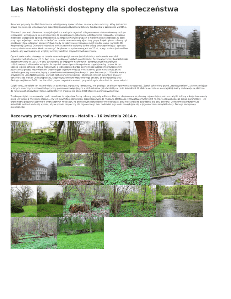 Las Natoliński dostępny dla społeczeństwa 2016-04-01 Rezerwat przyrody Las Natoliński został udostępniony społeczeństwu na mocy planu ochrony, który jest aktem prawa miejscowego ustanowionym przez Regionalnego Dyrektora Ochrony Środowiska w Warszawie w 2015 r. W ramach prac nad planem ochrony jako jedno z ważnych zagrożeń zdiagnozowano niekontrolowany ruch po rezerwacie i wzmagającą się antropopresję. W konsekwencji, jako formę udostępnienia rezerwatu, wskazano możliwość wstępu pod opieką przewodnika, w zorganizowanych grupach o maksymalnej liczebności 30 osób, przy czym w jednym czasie nie może być na terenie rezerwatu więcej niż trzy grupy. Projekt planu ochrony był poddawany tzw. udziałowi społeczeństwa, kiedy to każdy zainteresowany mógł składać uwagi i wnioski. Do Regionalnej Dyrekcji Ochrony Środowiska w Warszawie nie wpłynęły żadne uwagi dotyczące miejsc i sposobu udostępnienia rezerwatu. Warto zaznaczyć, że plan ochrony tworzony jest na 20 lat, a jego zmiana jest możliwa jedynie, gdy wymagają tego względy ochrony wartości przyrodniczych rezerwatu. Ograniczenie ruchu pieszego na terenie rezerwatu podyktowane jest dbałością o zachowanie wartości przyrodniczych i kulturowych (w tym m.in. z myślą o przyszłych pokoleniach). Rezerwat przyrody Las Natoliński został utworzony w 1991 r. w celu zachowania ze względów naukowych i dydaktycznych naturalnych, zróżnicowanych zbiorowisk leśnych z licznymi drzewami pomnikowymi oraz bogatej rzeźby terenu. W ten sposób objęto ochroną jedną z nielicznych, a jednocześnie bardzo cennych pod względem przyrodniczym pozostałości puszcz mazowieckich. Obecnie jest to jedyne miejsce w Warszawie, gdzie na tak dużą skalę zachodzą procesy naturalne, będące przedmiotem obserwacji naukowych i prac badawczych. Wysokie walory przyrodnicze Lasu Natolińskiego, wartość zachowanych tu siedlisk i obecność cennych gatunków znalazły uznanie także w skali Unii Europejskiej, czego wyrazem było włączenie tego obszaru do Europejskiej Sieci Ekologicznej Natura 2000. Las Natoliński, oprócz wysokich wartości przyrodniczych, chroni także cenne zabytki. Dzięki temu, że obiekt ten jest od wielu lat zamknięty, ogrodzony i strzeżony, nie podlega on silnym wpływom antropopresji. Został uchroniony przed „zadeptywaniem”, jakie ma miejsce w innych stołecznych rezerwatach przyrody pomimo obowiązujących w nich zakazów (jak chociażby w Lesie Kabackim). W efekcie w centrum europejskiej stolicy zachowały się zbliżone do naturalnych ekosystemy leśne, wśród których znajduje się około 1000 starych, pomnikowych drzew. Trzeba pamiętać, że rezerwaty i parki narodowe to najwyższe formy ochrony przyrody w Polsce, którymi obejmowane są obszary najcenniejsze, niczym zabytki kultury w kraju i nie należy mylić ich funkcji z miejskimi parkami, czy też innymi terenami zieleni przeznaczonymi do rekreacji. Dostęp do rezerwatów przyrody jest na mocy obowiązującego prawa ograniczony - ich uroki można podziwiać jedynie w wyznaczonych miejscach, na określonych warunkach i tylko wówczas, gdy nie stanowi to zagrożenia dla celu ochrony. Do rezerwatu przyrody Las Natoliński można i warto się wybrać, aby w sposób bezpieczny dla tego cennego lasu podziwiać jego uroki i znajdujące się w jego otoczeniu zabytki kultury. Do tego zachęcamy mieszkańców. Rezerwaty przyrody Mazowsza - Natolin - 16 kwietnia 2014 r.