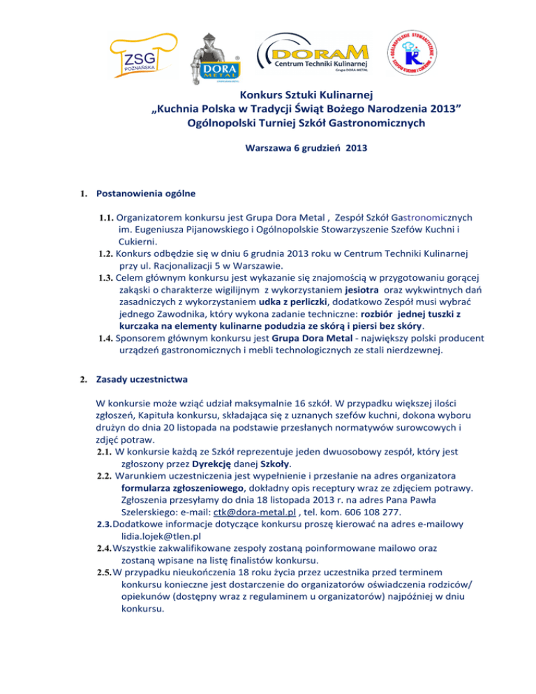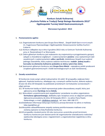 Konkurs Sztuki Kulinarnej „Kuchnia Polska w Tradycji Świąt Bożego Narodzenia 2013” Ogólnopolski Turniej Szkół Gastronomicznych Warszawa 6 grudzień 2013 1. Postanowienia ogólne 1.1. Organizatorem konkursu jest Grupa Dora Metal , Zespół Szkół Gastronomicznych im. Eugeniusza Pijanowskiego i Ogólnopolskie Stowarzyszenie Szefów Kuchni i Cukierni. 1.2. Konkurs odbędzie się w dniu 6 grudnia 2013 roku w Centrum Techniki Kulinarnej przy ul. Racjonalizacji 5 w Warszawie. 1.3. Celem głównym konkursu jest wykazanie się znajomością w przygotowaniu gorącej zakąski o charakterze wigilijnym z wykorzystaniem jesiotra oraz wykwintnych dań zasadniczych z wykorzystaniem udka z perliczki, dodatkowo Zespół musi wybrać jednego Zawodnika, który wykona zadanie techniczne: rozbiór jednej tuszki z kurczaka na elementy kulinarne podudzia ze skórą i piersi bez skóry. 1.4. Sponsorem głównym konkursu jest Grupa Dora Metal - największy polski producent urządzeń gastronomicznych i mebli technologicznych ze stali nierdzewnej. 2. Zasady uczestnictwa W konkursie może wziąć udział maksymalnie 16 szkół. W przypadku większej ilości zgłoszeń, Kapituła konkursu, składająca się z uznanych szefów kuchni, dokona wyboru drużyn do dnia 20 listopada na podstawie przesłanych normatywów surowcowych i zdjęć potraw. 2.1. W konkursie każdą ze Szkół reprezentuje jeden dwuosobowy zespół, który jest zgłoszony przez Dyrekcję danej Szkoły. 2.2. Warunkiem uczestniczenia jest wypełnienie i przesłanie na adres organizatora formularza zgłoszeniowego, dokładny opis receptury wraz ze zdjęciem potrawy. Zgłoszenia przesyłamy do dnia 18 listopada 2013 r. na adres Pana Pawła Szelerskiego: e-mail: [email protected] , tel. kom. 606 108 277. 2.3.Dodatkowe informacje dotyczące konkursu proszę kierować na adres e-mailowy [email protected] 2.4. Wszystkie zakwalifikowane zespoły zostaną poinformowane mailowo oraz zostaną wpisane na listę finalistów konkursu. 2.5. W przypadku nieukończenia 18 roku życia przez uczestnika przed terminem konkursu konieczne jest dostarczenie do organizatorów oświadczenia rodziców/ opiekunów (dostępny wraz z regulaminem u organizatorów) najpóźniej w dniu konkursu. 2.6. Udział w konkursie oznacza jednocześnie wyrażenie zgody na przetwarzanie danych osobowych na potrzeby organizatora konkursu (imię, nazwisko, nazwa szkoły) i publikację w różnej formie, bez odrębnego wynagrodzenia, zgłoszonych do konkursu przepisów oraz zdjęć potraw konkursowych. 2.7. Informacje o osobach nagrodzonych oraz ich potrawach zostaną opublikowane na stronach internetowych. 2.8. Organizatorzy nie zwracają kosztów podróży. 2.9. Poprzez przystąpienie do konkursu uczestnicy wyrażają zgodę na warunki zawarte w regulaminie. 2.10. Prawa autorskie do prac konkursowych (receptura gastronomiczna, zdjęcia) nabywa Organizator Konkursu z chwilą ich nadesłania. Prawa te obejmują wykorzystanie całości lub części pracy oraz są nieograniczone czasowo, ilościowo i terytorialnie. 3. Warunki organizacyjne 3.1. Uczestniczy konkursu rejestrują się w CTK w godzinach od 9.00 do 9.30 i losują kolejność startu. 3.2. Każdy uczeń powinien mieć prawidłowe ubranie kucharskie. 3.3. Każdy uczestnik konkursu będzie miał do dyspozycji w pełni wyposażone stanowisko pracy w Centrum Techniki Kulinarnej. Sprzęt specjalistyczny uczestnicy zabezpieczają we własnym zakresie. 3.4. Uczestnicy konkursu zobowiązani są do sporządzenia: gorącej zakąski z wykorzystaniem JESIOTRA (JEDEN FILET – 0,5kg)GRZYBÓW LEŚNYCH (BOROWIK MROŻONY), BOBU 4 porcji wykwintnego dania zasadniczego z wykorzystaniem UDKA PERLICZKI, SYROPU KLONOWEGO, ORZECHÓW WŁOSKICH, KASZY 4 porcji JAGLANEJ Zadanie techniczne: rozbiór jednej tuszki z kurczaka na elementy kulinarne podudzia ze skórą i piersi bez skóry Organizator zapewnia dostarczenie do przygotowania zakąski: fileta z jesiotra borowika ( mrożonego) bobu oraz do wykwintnego dania zasadniczego: udka perliczki (4sztuki) orzechów włoskich suszonych kaszy jaglanej do zadania technicznego jedną tuszkę kurczaka Resztę surowców uczestnicy zapewniają sobie we własnym zakresie. Nie wolno stosować przygotowanych wcześniej uformowanych półproduktów oraz przygotowanych wcześniej dekoracji. 3.5. Konkurs składa się z trzech etapów: I etap - konkurencja techniczna – rozbiór na elementy kulinarne kurczaka. II etap - sporządzanie zakąski o charakterze wigilijnym. III etap - sporządzenie dania zasadniczego z wykorzystaniem udka z perliczki. 3.7. Porcelanę – talerze okrągłe o średnicy 31 cm do ekspozycji potraw zabezpiecza organizator. 3.8. Jury przyzna trzy pierwsze miejsca na podstawie łącznej sumy punktów uzyskanych przez uczestnika w dwóch etapach konkursu. 3.9. Jury – przewodniczący – szef kuchni członek jury – szef kuchni członek jury – szef kuchni członek jury – szef kuchni członek jury – szef kuchni !!!Sponsorzy gwarantują atrakcyjne nagrody!!! W trakcie trwania turnieju w Sali wystawowej będą odbywały się tematyczne pokazy i szkolenia. 4. Zasady Konkursu 4.1. Uczestnicy konkursu rozpoczną swoje prace konkursowe w dwóch turach po osiem drużyn. Etap I – rozbiór na elementy kulinarne kurczaka (20 minut). Etap II – przygotowanie potraw (1 godzina i 30 minut) Szczegółowy program konkursu 10:00 - 10.10 przygotowanie uczestników z zespołów 1 - 8 na stanowiskach 10.10 - 10.30 zadanie techniczne 10.30 - 12.00 przygotowanie dań konkursowych 12.00 - 12.10 przygotowanie uczestników z zespołów 9 - 16 na stanowiskach 12.10 - 12.30 zadanie techniczne 12.30 - 14.00 przygotowanie dań konkursowych !!!Po upływie czasu konkursu potrawy zostaną ocenione w zastanej postaci!!! 4.2. Każdy uczestnik przygotowuje 4 porcje zakąski z użyciem jesiotra, grzybów leśnych (borowików mrożonych), bobu oraz dań zasadniczych sporządzonych z wykorzystaniem udka perliczki, syropu k
