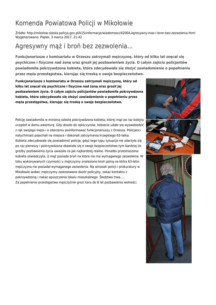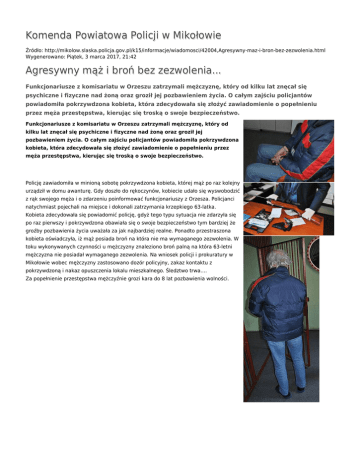 Komenda Powiatowa Policji w Mikołowie Źródło: http://mikolow.slaska.policja.gov.pl/k15/informacje/wiadomosci/42004,Agresywny-maz-i-bron-bez-zezwolenia.html Wygenerowano: Piątek, 3 marca 2017, 21:42 Agresywny mąż i broń bez zezwolenia... Funkcjonariusze z komisariatu w Orzeszu zatrzymali mężczyznę, który od kilku lat znęcał się psychiczne i fizyczne nad żoną oraz groził jej pozbawieniem życia. O całym zajściu policjantów powiadomiła pokrzywdzona kobieta, która zdecydowała się złożyć zawiadomienie o popełnieniu przez męża przestępstwa, kierując się troską o swoje bezpieczeństwo. Funkcjonariusze z komisariatu w Orzeszu zatrzymali mężczyznę, który od kilku lat znęcał się psychiczne i fizyczne nad żoną oraz groził jej pozbawieniem życia. O całym zajściu policjantów powiadomiła pokrzywdzona kobieta, która zdecydowała się złożyć zawiadomienie o popełnieniu przez męża przestępstwa, kierując się troską o swoje bezpieczeństwo. Policję zawiadomiła w minioną sobotę pokrzywdzona kobieta, której mąż po raz kolejny urządził w domu awanturę. Gdy doszło do rękoczynów, kobiecie udało się wyswobodzić z rąk swojego męża i o zdarzeniu poinformować funkcjonariuszy z Orzesza. Policjanci natychmiast pojechali na miejsce i dokonali zatrzymania krzepkiego 63-latka. Kobieta zdecydowała się powiadomić policję, gdyż tego typu sytuacja nie zdarzyła się po raz pierwszy i pokrzywdzona obawiała się o swoje bezpieczeństwo tym bardziej że groźby pozbawienia życia uważała za jak najbardziej realne. Ponadto przestraszona kobieta oświadczyła, iż mąż posiada broń na która nie ma wymaganego zezwolenia. W toku wykonywanych czynności u mężczyzny znaleziono broń palną na która 63-letni mężczyzna nie posiadał wymaganego zezwolenia. Na wniosek policji i prokuratury w Mikołowie wobec mężczyzny zastosowano dozór policyjny, zakaz kontaktu z pokrzywdzoną i nakaz opuszczenia lokalu mieszkalnego. Śledztwo trwa…. Za popełnienie przestępstwa mężczyźnie grozi kara do 8 lat pozbawienia wolności. Ocena: 0/5 (0) Tweetnij