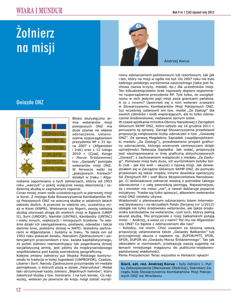Rok V nr 1 (24) styczeń-luty 2012 Żołnierz na misji Andrzej Korus Gwiazda ONZ Blisko stutysięczna armia weteranów misji pokojowych ONZ ma duże szanse na własne odznaczenie. Ustanowienie rozporządzeniem prezydenta RP z 31 lipca 2007 r. (Afganistan i Irak) oraz z 12 lutego 2010 r. (Czad, Kongo i Morze Śródziemne) tzw. „Gwiazdy” pomijało weteranów misji ONZ. W ferworze walki na „pokojowych frontach” działań w Iraku i Afganistanie zapomniano o tych żołnierzach, którzy od 1953 roku „walczyli” o pokój wyłącznie swoją obecnością i codzienną służbą w zagrożonym regionie. Coraz mniej znam osób uczestniczących w pierwszej misji w Korei. Z mojego Koła Stowarzyszenia Kombatantów Misji Pokojowych ONZ na wieczną służbę w ostatnich latach odeszło dwóch. A przecież to właśnie oni, uczestnicy misji w Korei (KNPN), Wietnamie czy Nigerii, swoją rzetelną służbą utorowali drogę do wielkich misji w Egipcie (UNEF II), Syrii (UNDOF), Namibii (UNTAG), Kambodży (UNTAC) i wielu innych, większych i mniejszych liczebnie. To właśnie dzięki ich zaangażowaniu, postawie, odwadze i także daninie krwi, jesteśmy dzisiaj w NATO. Jesteśmy partnerami w Afganistanie i byliśmy w Iraku. To także oni od 1953 roku pokazali światu, Narodom Zjednoczonym i potencjalnym przeciwnikom z tzw. świata kapitalistycznego, że polski żołnierz reprezentujący tak pogardzaną dzisiaj socjalistyczną armię, jest zdolny do międzynarodowego współdziałania pod każdą szerokością geograficzną. Kolejne zmiany żołnierzy już Wojska Polskiego kontynuowały te tradycje w byłej Jugosławii (UNPROFOR), Czadzie, Libanie i Syrii. Narody Zjednoczone przyznawały im medale pamiątkowe, o których piszę w dziale „Falerystyka”. Medal taki otrzymywał każdy żołnierz „Błękitnych hełmów”, który zakończył służbę z tzw. honorami. I na tym koniec. Co najwyżej, weteran po powrocie do kraju mógł zostać wyróż- 12 niony odznaczeniem państwowym lub resortowym, tak jak i ten, który na misji w ogóle nie był. Do 2007 roku nie było żadnego polskiego wyróżnienia zaszczytnego (taka jest fachowa nazwa krzyży, medali, itp.) dla uczestników misji. Ten kilkudziesięcioletni brak naprawiły dopiero wspomniane rozporządzenia prezydenta RP. Tyle tylko, że uwzględniono w nich jedynie pięć misji poza granicami państwa. A co z innymi? Upomnieli się o nich weterani zrzeszeni w Stowarzyszeniu Kombatantów Misji Pokojowych ONZ. Już wcześniej ustanowili oni tzw. medal „Za Zasługi” dla swoich członków i osób wspierających, ale to tylko odznaczenie środowiskowe, nadawane samym sobie. W czasie spotkania ministra Obrony Narodowej z Zarządem Głównym SKMP ONZ, które odbyło się 16 grudnia 2011 r. poruszono tę sprawę. Zarząd Stowarzyszenia przedstawił propozycję zwiększenia liczby odznaczeń o tzw. „Gwiazdę ONZ”. Za sprawą Magdaleny Sąsiadek (współprojektantki medalu „Za Zasługi”), przedstawiono projekt graficzny odznaczenia, którego wizerunek zamieszczam dzięki uprzejmości Tadeusza Sąsiadka. Jak widać, propozycja jest wkomponowana w linię graficzną dotychczasowych „Gwiazd”, z zachowaniem wstążeczki z medalu „Za Zasługi”. Ponieważ misji było dużo, ich wyróżnikiem byłyby belki (lub - jak kto woli – okucie) z nazwą misji. Jak dowiedziałem się w Zarządzie Głównym SKMP ONZ, do pomysłu przekonani są także między innymi dowódca operacyjny Sił Zbrojnych RP i szef Biura Bezpieczeństwa Narodowego. Ci doświadczeni żołnierze wiedzą o potrzebie takiego odznaczenia i z całą pewnością pomogą. Najważniejsze, że i minister nie mówi „nie”, a nawet deklaruje poparcie inicjatywy. Trzeba się tylko spieszyć, albowiem weteranów misji ONZ niestety ubywa. Wiadomość o planowanym odznaczeniu lotem internetowej błyskawicy i na skrzydłach Polski Zbrojnej (nr 1/2012) obiegła nie tylko środowisko weteranów, ale także środowisko kandydatów na weteranów, czyli tych, którzy pełnią akurat służbę. Moi przyjaciele z misji bałkańskich pytają mnie: – Andrzej, a wiesz co z nami? Toć my nie Afganistan czy ONZ! Co będzie z odznaczeniem dla nas? – Koledzy, nie wiem. Choć uważam za słuszną waszą propozycję ustanowienia także „Gwiazdy Bałkanów” lub przynajmniej okucia z napisem np. EUFOR/MTT, IFOR, SFOR, EUFOR do „Gwiazdy Morza Śródziemnego”. Tak jak obiecałem w rozmowach, przekazuję waszą sugestię na łamach niniejszego magazynu do publiczno-wojskowopaństwowej wiadomości. Panie Prezydencie! Teraz wszystko w Pańskich rękach! Sierż. szt. rez. Andrzej Andrzej Korus Korus –– były były żołnierz żołnierz 1. 1 Pułku Zabezpieczenia (Warszawa–Oleśnica), Sekretarz Zarządu Koła Stowarzyszenia Kombatantów Misji Pokojowych ONZ we Wrocławiu