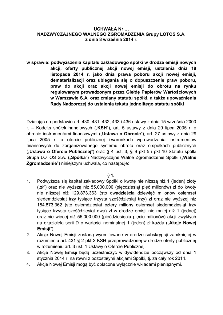 UCHWAŁA Nr … NADZWYCZAJNEGO WALNEGO ZGROMADZENIA Grupy LOTOS S.A. z dnia 8 września 2014 r. w sprawie: podwyższenia kapitału zakładowego spółki w drodze emisji nowych akcji, oferty publicznej akcji nowej emisji, ustalenia dnia 18 listopada 2014 r. jako dnia prawa poboru akcji nowej emisji, dematerializacji oraz ubiegania się o dopuszczenie praw poboru, praw do akcji oraz akcji nowej emisji do obrotu na rynku regulowanym prowadzonym przez Giełdę Papierów Wartościowych w Warszawie S.A. oraz zmiany statutu spółki, a także upoważnienia Rady Nadzorczej do ustalenia tekstu jednolitego statutu spółki Działając na podstawie art. 430, 431, 432, 433 i 436 ustawy z dnia 15 września 2000 r. – Kodeks spółek handlowych („KSH”), art. 5 ustawy z dnia 29 lipca 2005 r. o obrocie instrumentami finansowymi („Ustawa o Obrocie”), art. 27 ustawy z dnia 29 lipca 2005 r. o ofercie publicznej i warunkach wprowadzania instrumentów finansowych do zorganizowanego systemu obrotu oraz o spółkach publicznych („Ustawa o Ofercie Publicznej”) oraz § 4 ust. 3, § 9 pkt 5 i pkt 10 Statutu spółki Grupa LOTOS S.A. („Spółka”) Nadzwyczajne Walne Zgromadzenie Spółki („Walne Zgromadzenie”) niniejszym uchwala, co następuje: § 1. 1. 2. 3. 4. Podwyższa się kapitał zakładowy Spółki o kwotę nie niższą niż 1 (jeden) złoty („zł”) oraz nie wyższą niż 55.000.000 (pięćdziesiąt pięć milionów) zł do kwoty nie niższej niż 129.873.363 (sto dwadzieścia dziewięć milionów osiemset siedemdziesiąt trzy tysiące trzysta sześćdziesiąt trzy) zł oraz nie wyższej niż 184.873.362 (sto osiemdziesiąt cztery miliony osiemset siedemdziesiąt trzy tysiące trzysta sześćdziesiąt dwa) zł w drodze emisji nie mniej niż 1 (jednej) oraz nie więcej niż 55.000.000 (pięćdziesięciu pięciu milionów) akcji zwykłych na okaziciela serii D o wartości nominalnej 1 (jeden) zł każda („Akcje Nowej Emisji”). Akcje Nowej Emisji zostaną wyemitowane w drodze subskrypcji zamkniętej w rozumieniu art. 431 § 2 pkt 2 KSH przeprowadzonej w drodze oferty publicznej w rozumieniu art. 3 ust. 1 Ustawy o Ofercie Publicznej. Akcje Nowej Emisji będą uczestniczyć w dywidendzie począwszy od dnia 1 stycznia 2014 r. na równi z pozostałymi akcjami Spółki, tj. za cały rok 2014. Akcje Nowej Emisji mogą być opłacone wyłącznie wkładami pieniężnymi. § 2. 1. 2. 3. 4. Ustala się dzień 18 listopada 2014 r. jako dzień prawa poboru Akcji Nowej Emisji w rozumieniu art. 432 § 2 KSH („Dzień Prawa Poboru”). Akcjonariuszom Spółki posiadającym akcje Spółki na koniec Dnia Prawa Poboru będzie przysługiwało prawo poboru Akcji Nowej Emisji, przy czym za każdą 1 (jedną) akcję Spółki posiadaną na koniec Dnia Prawa Poboru akcjonariuszowi Spółki będzie przysługiwało 1 (jedno) prawo poboru („Prawo Poboru”). Liczbę Akcji Nowej Emisji, do objęcia których będzie uprawniać 1 (jedno) Prawo Poboru, ustala się poprzez podzielenie liczby Akcji Nowej Emisji, określonej przez Zarząd Spółki zgodnie z § 3 ust. 1 lit. (b) niniejszej Uchwały, przez łączną liczbę Praw Poboru. Ostateczną liczbę Akcji Nowej Emisji przydzielonych osobie, która złożyła zapis na Akcje Nowej Emisji w wykonaniu Prawa Poboru ustala się poprzez pomnożenie liczby Praw Poboru, objętych wszystkimi ważnymi zapisami złożonymi przez tę osobę, przez liczbę Akcji Nowej Emisji, do objęcia których uprawniać będzie 1 (jedno) Prawo Poboru, a następnie zaokrąglenie otrzymanego w ten sposób iloczynu w dół do najbliższej liczby całkowitej. Termin, w którym będzie możliwe wykonanie Prawa Poboru, zostanie określony w prospekcie emisyjnym Akcji Nowej Emisji sporządzonym na potrzeby oferty publicznej Akcji Nowej Emisji, o której mowa w § 1 ust. 2 niniejszej Uchwały, oraz ubiegania się o dopuszczenie i wprowadzenie Praw Poboru, praw do Akcji Nowej Emisji („Prawa do Akcji”) oraz Akcji Nowej Emisji do obrotu na rynku regulowanym prowadzonym przez Giełdę Papierów Wartościowych w Warszawie S.A. („GPW”) („Prospekt”). § 3. 1. 2. Walne Zgromadzenie niniejszym upoważnia Zarząd Spółki do: (a) określenia ostatecznej sumy, o jaką ma być podwyższony kapitał zakładowy Spółki, przy czym tak określona suma nie może być niższa niż kwota minimalna ani wyższa niż kwota maksymalna określone w § 1 ust. 1 niniejszej Uchwały; (b) określenia ostatecznej liczby oferowanych Akcji Nowej Emisji, stosownie do art. 54 Ustawy o Ofercie Publicznej; (c) ustalenia ceny emisyjnej Akcji Nowej Emisji; (d) ustalenia liczby Praw Poboru uprawniających do objęcia jednej Akcji Nowej Emisji. Walne Zgromadzenie niniejszym upoważnia Zarząd Spółki do podjęcia wszelkich czynności związanych z podwyższeniem kapitału zakładowego Spółki na podstawie niniejszej Uchwały, emisją i ofertą Akcji Nowej Emisji oraz ubieganiem się o dopuszczenie i wprowadzenie Praw Poboru, Praw do Akcji oraz Akcji Nowej Emisji do obrotu na rynku regulowanym prowadzonym przez GPW, w szczególności do: zaoferowania Akcji Nowej Emisji w ofercie publicznej; określenia szczegółowych warunków subskrypcji i przydziału Akcji Nowej Emisji, w tym określenia terminu otwarcia i zamknięcia subskrypcji Akcji Nowej Emisji, ustalenia zasad subskrypcji i przydziału Akcji Nowej Emisji (w tym zasad dokonywania zaokrągleń liczby Akcji Nowej Emisji przydzielonych na rzecz osoby, która złożyła zapis w wykonaniu Prawa Poboru) oraz zasad przydziału i subskrypcji Akcji Nowej Emisji, które nie zostaną objęte w wykonaniu Prawa Poboru ani w ramach zapisów dodatkowych, o których mowa w art. 436 § 2 KSH; (c) wystąpienia do Komisji Nadzoru Finansowego z wnioskiem o zatwierdzenie Prospektu; (d) zawarcia umów w celu zabezpieczenia powodzenia emisji oraz oferty Akcji Nowej Emisji, zarówno na zasadzie odpłatnej, jak i nieodpłatnej, w tym umowy lub umów o subemisję usługową lub inwest