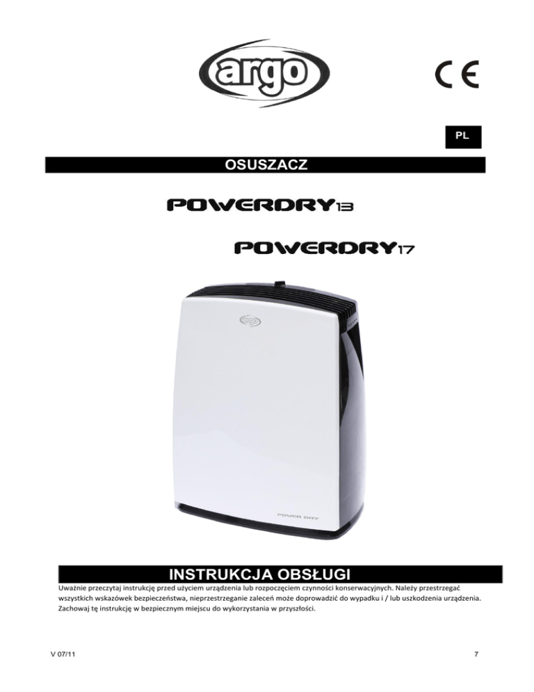 PL OSUSZACZ INSTRUKCJA OBSŁUGI Uważnie przeczytaj instrukcję przed użyciem urządzenia lub rozpoczęciem czynności konserwacyjnych. Należy przestrzegać wszystkich wskazówek bezpieczeństwa, nieprzestrzeganie zaleceń może doprowadzić do wypadku i / lub uszkodzenia urządzenia. Zachowaj tę instrukcję w bezpiecznym miejscu do wykorzystania w przyszłości. V 07/11 7 OGÓLNA INSTRUKCJA OBSŁUGI I BEZPIECZEŃSTWA Urządzenie to jest bardzo wydajnym osuszaczem, przeznaczonym wyłącznie do użytku domowego! • Użyj tego osuszacza tylko jak opisano w niniejszej instrukcji. Każde inne zastosowanie nie zalecane przez producenta może spowodować pożar, porażenie prądem elektrycznym lub uszkodzenie urządzenia. • Upewnij się, że wymagane napięcie i częstotliwość (220-2420V-/50Hz) odpowiadają temu w źródle zasilania. • Upewnij się, że wtyczka jest włożona do końca. Nie używać przejściówek. Nie dotykaj wtyczki mokrymi rękami. Upewnij się, że wtyczka jest czysta. • Produkt nie jest zabawką. Dzieci powinny być odpowiednio nadzorowane, aby nie bawiły się urządzeniem. • To urządzenie nie jest przeznaczone do użytku przez osoby (w tym dzieci) o ograniczonej sprawności fizycznej, czuciowej lub psychicznej, lub osoby bez odpowiedniego doświadczenia i wiedzy, chyba że zostały one odpowiednio nadzorowane i przeszkolone przez osobę odpowiedzialną za ich bezpieczeństwo. • Odłączyć zasilanie sieciowe, gdy urządzenie nie jest używane lub podczas czyszczenia. Tego rodzaju czynności wykonywane pod napięciem mogą spowodować porażenie prądem elektrycznym. • Aby odłączyć urządzenie, należy ustawić przełącznik w pozycji OFF i wyjąć wtyczkę z gniazdka. Tylko za wtyczkę. Nie ciągnąć za przewód. • Nie zginaj, nie skręcać przewodu ani stosuj siły, aby wyciągnąć wtyczkę. Nie należy używać urządzenia, jeśli przewód lub wtyczka są uszkodzone: może to spowodować ryzyko pożaru lub porażenia prądem. Jeśli przewód zasilający jest uszkodzony, musi zostać wymieniony przez producenta, dystrybutora lub wykwalifikowaną osobę w celu uniknięcia zagrożenia bezpieczeństwa. • Nie należy umieszczać ciężkich przedmiotów na urządzeniu. • Aby zapobiec wyciekom wody, opróżnić zbiornik wody przed przeniesieniem urządzenia. • Nie przechylać osuszacza, nie włączaj go do góry nogami, woda, która wycieknie może uszkodzić urządzenie. • Nie używać urządzenia na powierzchniach niestabilnych lub opadający: wycieki wody mogą spowodować nieprawidłowe działanie lub nietypowe wibracje, powodując głośny operacji. • osuszacz musi znajdować się co najmniej 50 cm od ścian i innych przeszkód, aby ciepło rozpraszało się poprawnie. • Zamknij wszystkie otwarte okna, aby zmaksymalizować wydajność osuszania. • Nie wolno wkładać przedmiotów ani ostrych narzędzi do kratki wylotu powietrza. • Nie należy zakrywać wlotu i wylotu w jakikolwiek sposób. UWAGA! W razie nieprawidłowości, należy wyłączyć urządzenie i odłączyć je od sieci. Nie rozbierać, naprawiać lub modyfikować urządzenia swobodnie. W przypadku awarii, skontaktuj się ze sprzedawcą lub centrum serwisowym. • Nie należy zanurzać przewodu zasilającego, wtyczki lub innej części urządzenia w wodzie lub innych cieczach. • Nie wystawiać osuszacza na bezpośrednie działanie promieni słonecznych. • Trzymaj urządzenie z dala od źródeł ciepła, które mogłyby spowodować deformację elementów plastikowych urządzenia. • Nie należy rozpylać środków owadobójczych, przetrzymywać olejów lub farb w pobliżu urządzenia, może to spowodować uszkodzenie plastiku lub pożar. • Utrzymuj łatwopalne gazy i oleje z dala od urządzenia! • Nie należy przenosić urządzenia podczas pracy, może to spowodować wycieki wody lub nie właściwą pracę. OPIS CZĘŚCI V 07/11 1) PANEL KONTROL. 2) WYLOT OSUSZONEGO POWIETRZA 3) UCHWYTY TRANSPORTOWE 4) PANEL PRZED. 8 5) KRATKA WLOTU POWIETRZA Z DEMONTOWALNYM (ZMYWALNYM) FILTREM PRZECIW GRZYBICZNYM 6) OTWÓR DO CIĄGŁEGO ODPROWADZANIA KONDENSATU 7) ŁATWO WYJMOWALNY ZBIORNIK NA WODĘ PANEL KONTROLNY A B C D A. LAMPKA KONTROLNA B. LAMPKA PEŁNEGO ZBIORNIKA C. LAMPKA AUTOMATYCZNEGO ODSZRANIANIA D. POKRĘTŁO REGULACJI WILGOTNOŚCI: ustaw żądaną wartość procentową wilgotności w pomieszczeniu. OFF = urządzenie wyłączone CONT. = urządzenie w pracy ciągłej POZYCJA POKRĘTŁA D V 07/11 Poziom wilgotności 2 80﹪ 4 60﹪ 6 40﹪ 7 30﹪ 8 20﹪ 9 URUCHOMIENIE URZĄDZENIA Umieść produkt na płaskiej i stabilnej powierzchni żaroodpornej, co najmniej 1 metr od łatwopalnych lub wrażliwych na ciepło materiałów i 50 cm od ścian lub innych przeszkód. Ustaw pokrętło regulacji wilgotności OFF. Upewnij się, że zbiornik wody jest w prawidłowym położeniu. Podłącz przewód zasilający do odpowiedniego gniazdka elektrycznego (220-2420V-/50Hz). Ustaw pokrętło regulacji wilgotności do pozycji odpowiadającej żądanemu procentowi wilgotności (patrz tabela powyżej), obracając go w prawo: proponujemy ustawienie na 4 (60% wilgotności). Światło OPERATION zapali się i będzie świecić, co wskazuje operację osuszania. PRZEPISY UŻYTKOWANIA Urządzenie będzie działać TYLKO, gdy poziom wilgotności w pomieszczeniu jest wyższy wartości zadanej. Osuszacz będzie działał do momentu osiągnięcia żądanej wilgotności, z wyjątkiem przerw spowodowanych pełnym zbiornikiem. W tym przypadku, opróżnić zbiornik i ponownie umieścić go poprawnie: osuszacz rozpocznie pracę ponownie. OSTRZEŻENIE: Po każdej przerwie w pracy, muszą upłynąć co najmniej 3 minuty, osuszacz zaczynie działać ponownie: Opóźnienie to (start-up) chroni sprężarkę przed uszkodzeniem. Jeśli ustawiony procent wilgotności jest wyższy niż obecnie znajduje się w pomieszczeniu, osuszacz nie zostanie uruchomiony. Jeżeli po uruchomieniu urządzenia w/d instrukcj