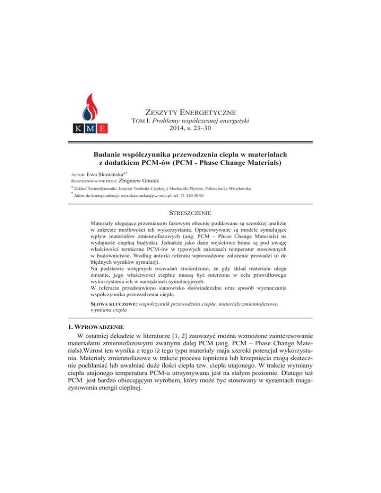 ZESZYTY ENERGETYCZNE TOM I. Problemy współczesnej energetyki 2014, s. 23–30 Badanie współczynnika przewodzenia ciepła w materiałach z dodatkiem PCM-ów (PCM - Phase Change Materials) a,• AUTOR: Ewa Skawińska REKOMENDOWANE PRZEZ: Zbigniew a • Gnutek Zakład Termodynamiki, Instytut Techniki Cieplnej i Mechaniki Płynów, Politechnika Wrocławska Adres do korespondencji: [email protected], tel. 71 320 30 91 STRESZCZENIE Materiały ulegające przemianom fazowym obecnie poddawane są szerokiej analizie w zakresie możliwości ich wykorzystania. Opracowywane są modele symulujące wpływ materiałów zmiennofazowych (ang. PCM – Phase Change Materials) na wydajność cieplną budynku. Jednakże jako dane wejściowe brane są pod uwagę właściwości termiczne PCM-ów w typowych zakresach temperatur stosowanych w budownictwie. Według autorki referatu wprowadzone założenie prowadzi to do błędnych wyników symulacji. Na podstawie wstępnych rozważań stwierdzono, że gdy skład materiału ulega zmianie, jego właściwości cieplne muszą być mierzone w celu prawidłowego wykorzystania ich w narzędziach symulacyjnych. W referacie przedstawiono stanowisko doświadczalne oraz sposób wyznaczania współczynnika przewodzenia ciepła. SŁOWA KLUCZOWE: wspołczynnik przewodznia ciepła, materiały zmiennofazowe, wymiana ciepła 1. WPROWADZENIE W ostatniej dekadzie w literaturze [1, 2] zauważyć można wzmożone zainteresowanie materiałami zmiennofazowymi zwanymi dalej PCM (ang. PCM – Phase Change Materials).Wzrost ten wynika z tego iż tego typu materiały maja szeroki potencjał wykorzystania. Materiały zmiennofazowe w trakcie procesu topnienia lub krzepnięcia mogą skutecznie pochłaniać lub uwalniać duże ilości ciepła tzw. ciepła utajonego. W trakcie wymiany ciepła utajonego temperatura PCM-u utrzymywana jest na stałym poziomie. Dlatego też PCM jest bardzo obiecującym wyrobem, który może być stosowany w systemach magazynowania energii cieplnej. 24 E. Skawińska Jednym z sektorów przemysłu w którym trwają intensywne prace nad możliwością wykorzystania PCM-ów jest budownictwo. Idea zastosowania tego typu materiałów w ścianach budynków pojawiła się już w latach 80. obecny wzrost zainteresowania spowodowany jest potrzebą zmniejszenia zużycia energii oraz kosztów na potrzeby ogrzewania, wentylacji i klimatyzacji. Obecnie wznoszone są budynki o lekkiej konstrukcji nośnej, w których funkcje izolacyjne pełnią materiały o bardzo niskim cieple właściwym i gęstości, co prowadzi do konieczności dogrzewania pomieszczeń w okresie zimowym i chłodzenia w okresie letnim. Alternatywnym rozwiązaniem jest użycie PCM-ów. Łącząc PCM z materiałami ściennymi można sterować temperaturą w pomieszczaniu poprzez absorpcję i uwalnianie ciepła utajonego na zewnątrz. Badania nad wpływem materiału zmiennofazowego zastosowanego w okładzinie ściennej (tj. zaprawach tynkarskich) na temperaturę w pomieszczaniu wykonano w Niemczech w pobliżu Weimaru. Przeprowadzono doświadczenie w dwóch jednakowych testowych pomieszczeniach, w jednym z nich ściany pokryto tynkiem z dodatkiem materiału zmiennofazowego. Natomiast w drugim zastosowano zwykły tynk bez żadnych domieszek. W doświadczeniu dokonano pomiaru temperatur w ciągu doby. Otrzymane wyniki pozwoliły na potwierdzanie założenia, że PCM ma wpływ na zmianę temperatury w pomieszczeniu. W ciągu dnia otrzymano obniżenie temperatury o 3 K w stosunku do pokoju bez PCM–u [3]. Oprócz wymienionego doświadczania prowadzone są badania nad możliwością zastosowania materiałów zmiennofazowych w systemach ogrzewania podłogowego czy też sufitowych systemach aktywnego chłodzenie [4]. Powszechnie wiadomo, że właściwości termofizyczne materiałów budowlanych będą miały silny wpływ na zużycie energii w budynku. W związku z tym konieczne jest zbadanie nie tylko możliwości wykorzystania PCM jako materiału zwiększającego pojemność cieplną ale i jego wpływu na właściwości cieple takie jak przewodność cieplna [5]. Celem tej pracy jest przedstawienie stanowiska oraz sposobu pomiaru współczynnika przewodzenia ciepła nowego materiału kompozytowego na bazie gipsu budowlanego zawierającego 10 % udział materiału zmiennofazowego wytwarzane przez firmę Rubitherm. Praca ta jest częścią większej aktywności naukowej na temat wykorzystania materiałów zmiennofazowych w konstrukcjach budowlanych oraz ich wpływu na właściwości badanego materiału, a w szczególności na współczynnik przewodzenia ciepła. 2. STANOWISKO POMIAROWE Zaprojektowano stanowisko badawcze umożliwiające zbadanie wpływu materiału zmiennofazowego na współczynnik przewodzenia ciepła. W związku z tym że materiałem nośnym dla PCM-u jest materiał budowlany, projekt stanowiska oparto na aparacie płytowym opisanym w normie ISO 8302. Układ pomiarowy został tak zaprojektowany, aby współczynnik przewodzenia ciepła mógł być wyznaczany dla różnych materiałów w zwartej formie. Schemat ideowy stanowiska przedstawiono na rys. 1. Badanie współczynnika przewodzenia ciepła w materiałach z dodatkiem PCM-ów 25 Rys. 1. Schemat ideowy stanowiska pomiarowego: 1 – izolacja z wełny mineralnej, 2 – grzałka płaska, 3 – termoelementy, 4 – materiał kompozytowy, 5 – wymiennik ciepła, 6 – izolacja styropianowa, 7 – autotransformator, 8 – rejestrator temperatury Zaprojektowany aparat przeznaczony jest do wytwarzania wewnątrz próbki w kształcie walca i średnicy 150 mm o płaskich, równoległych powierzchniach, jednokierunkowego strumienia ciepła o stałej gęstości w warunkach stanu ustalonego. Kształt walca zastosowano w celu uniknięcia mostków termicznych. Wymiana ciepła wymuszona jest poprzez organicznie próbki dwiema płaskimi izotermicznymi powierzchniami nazywanymi dalej zespołem grzejnym i chłodzącym. Zespół grzejny (rys. 2) stanowi płaska grzałka 