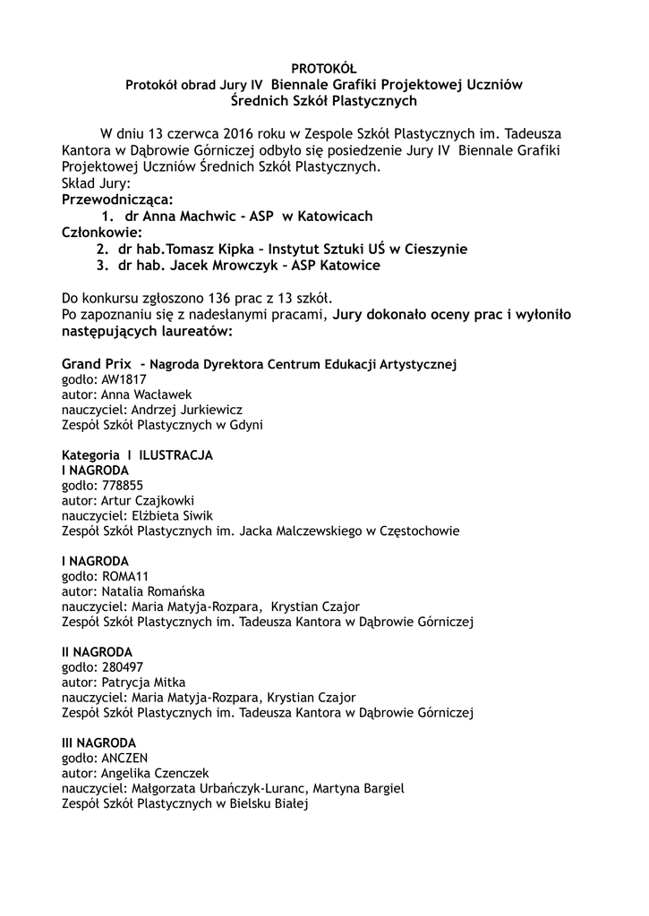 PROTOKÓŁ Protokół obrad Jury IV Biennale Grafiki Projektowej Uczniów Średnich Szkół Plastycznych W dniu 13 czerwca 2016 roku w Zespole Szkół Plastycznych im. Tadeusza Kantora w Dąbrowie Górniczej odbyło się posiedzenie Jury IV Biennale Grafiki Projektowej Uczniów Średnich Szkół Plastycznych. Skład Jury: Przewodnicząca: 1. dr Anna Machwic - ASP w Katowicach Członkowie: 2. dr hab.Tomasz Kipka – Instytut Sztuki UŚ w Cieszynie 3. dr hab. Jacek Mrowczyk – ASP Katowice Do konkursu zgłoszono 136 prac z 13 szkół. Po zapoznaniu się z nadesłanymi pracami, Jury dokonało oceny prac i wyłoniło następujących laureatów: Grand Prix - Nagroda Dyrektora Centrum Edukacji Artystycznej godło: AW1817 autor: Anna Wacławek nauczyciel: Andrzej Jurkiewicz Zespół Szkół Plastycznych w Gdyni Kategoria I ILUSTRACJA I NAGRODA godło: 778855 autor: Artur Czajkowki nauczyciel: Elżbieta Siwik Zespół Szkół Plastycznych im. Jacka Malczewskiego w Częstochowie I NAGRODA godło: ROMA11 autor: Natalia Romańska nauczyciel: Maria Matyja-Rozpara, Krystian Czajor Zespół Szkół Plastycznych im. Tadeusza Kantora w Dąbrowie Górniczej II NAGRODA godło: 280497 autor: Patrycja Mitka nauczyciel: Maria Matyja-Rozpara, Krystian Czajor Zespół Szkół Plastycznych im. Tadeusza Kantora w Dąbrowie Górniczej III NAGRODA godło: ANCZEN autor: Angelika Czenczek nauczyciel: Małgorzata Urbańczyk-Luranc, Martyna Bargiel Zespół Szkół Plastycznych w Bielsku Białej WYRÓŻNIENIA: godło: 2432L8 autor: Mikołaj Bzowski nauczyciel: Robert Kańtoch, Wojciech Jurkiewicz Zespół Szkół Plastycznych im. Tadeusza Kantora w Dąbrowie Górniczej godło: 248BCD autor: Marta Mach nauczyciel: Beata Będkowska, Wojciech Jurkiewicz Zespół Szkół Plastycznych im. Tadeusza Kantora w Dąbrowie Górniczej godło: 645807 autor: Katarzyna Czerwińska nauczyciel: Beata Będkowska, Wojciech Jurkiewicz Zespół Szkół Plastycznych im. Tadeusza Kantora w Dąbrowie Górniczej Kategoria II IDENTYFIKACJA WIZUALNA II NAGRODA godło: PM1997 autor: Patrycja Mitka nauczyciel: Maria Matyja-Rozpara , Krystian Czajor Zespół Szkół Plastycznych im. Tadeusza Kantora w Dąbrowie Górniczej III NAGRODA godło: 193245 autor: Iga Matyjaszczyk nauczyciel: Anna Świerbutowicz-Kawalec Zespół Szkół Plastycznych im. Cypriana Kamila Norwida w Lublinie WYRÓŻNIENIA: godło: BBPCC16 autor: Patrycja Cebula nauczyciel: Beata Będkowska, Wojciech Jurkiewicz Zespół Szkół Plastycznych im. Tadeusza Kantora w Dąbrowie Górniczej godło: ONG240 autor: Zuzanna Lewińska nauczyciel: Teresa Burzycka Zespół Szkół Plastycznych w Gdyni SZKOŁY BIORĄCE UDZIAŁW BIENNALE 1. Zespół Szkół Plastycznych w Bielsku-Białej 2. Zespół Szkół Plastycznych im. Jacka Malczewskiego w Częstochowie 3. Zespół Szkół Plastycznych im. T. Kantora w Dąbrowie Górniczej 4. Zespół Szkół Plastycznych w Gdyni 5. Zespół Szkół Plastycznych im. Stanisława Wyspiańskiego w Jarosławiu 6. Zespół Szkół Plastycznych im. Władysława Hasiora w Koszalinie 7. Zespół Szkół Plastycznych im. Cypriana Kamila Norwida w Lublinie 8. Zespół Szkół Plastycznych im. Tadeusza Makowskiego w Łodzi 9. Liceum Plastyczne im. Józefa Chełmońskiego w Nałęczowie 10. Zespół Szkół Plastycznych w Nysie 11. I Prywatne Liceum Plastyczne w Płocku 12. Liceum Plastyczne im. Constantina Brancusi w Szczecinie 13. Zespół Szkół Plastycznych w Tarnowie PRACE ZAKWALIFIKOWANE DO WYSTAWY KATEGORIA ILUSTRACJA l. p. GODŁO AUTOR SZKOŁA NAUCZYCIEL Magdalena SikorskaPiekarska 1 396435 Marcin Kłos I Prywatne Liceum Plastyczne w Płocku 2 ŻDŹBŁO Ewa Marusiak Liceum Plastyczne Jolanta Podwalska, im.Constantina Brancusi Remigiusz Kostera w Szczecinie 3 ING543 Inga Pronobis Zespół Szkół Plastycznych Maria Matyja-Rozpara, im. Tadeusza Kantora Krystian Czajor w Dąbrowie Górniczej 4 SMUTEK Michalina Kowelewska Zespół Szkół Plastycznych w Gdyni Teresa Burzycka 5 SZD56A Albert Piotrowski- Zespół Szkół Pawlikowski Plastycznych w Gdyni Teresa Burzycka 6 111111 Karolina Wojdyła 7 SAN123 Sandra Stojańska Zespół Szkół Plastycznych Małgorzata Urbańczykw Bielsku -Białej Luranc, Martyna Bargiel 8 179863 Aleksandra Zdulska Zespół Szkół Plastycznych Piotr Wasilewski im. Władysława Hasiora w Koszalinie 9 SAB113 Sabina Kipa Zespół Szkół Plastycznych Piotr Burzyński w Tarnowie 10 123ANN Anna Padula Zespół Szkół Plastycznych Elżbieta Siwik im. Jacka Malczewskiego w Częstochowie 11 AZ1916 Agnieszka Żurek Zespół Szkół Plastycznych w Gdyni 12 EIPOXC Domiknka Szmurło Zespół Szkół Plastycznych Beata Będkowska, im. Tadeusza Kantora Wojciech Jurkiewicz w Dąbrowie Górniczej 13 NZO116 Natalia Zaczyńska Zespół Szkół Plastycznych Robert Kańtoch, im. Tadeusza Kantora Wojciech Jurkiewicz w Dąbrowie Górniczej PRACE ZAKWALIFIKOWANE DO WYSTAWY KATEGORIA IDENTYFIKACJA WIZUALNA L. p. GODŁO AUTOR Zespół Szkół Plastycznych Elżbieta Siwik im. Jacka Malczewskiego w Częstochowie SZKOŁA Andrzej Jurkiewicz NAUCZYCIEL 1 TFO248 Nicole Milewczyk Zespół Szkół Plastycznych w Gdyni Teresa Burzycka 2 240598 Weronika Sikora Zespół Szkół Plastycznych im. Cypriana Kamila Norwida w Lublinie Anna ŚwierbutowiczKawalec 3 180877 Tomasz Walencik Zespół Szkół Plastycznych im. Cypriana Kamila Norwida w Lublinie Anna ŚwierbutowiczKawalec 4 345245 Latita Alkubati Zespół Szkół Plastycznych im. Cypriana Kamila Norwida w Lublinie Anna ŚwierbutowiczKawalec 5 280798 Dorota Tyszko Zespół Szkół Plastycznych im. Cypriana Kamila Norwida w Lublinie Anna ŚwierbutowiczKawalec 6 010891 Jan Derdziak Zespół Szkół Plastycznych im. Cypriana Kamila Norwida w Lublinie Anna ŚwierbutowiczKawalec 7 YZ18XO Aleksandra Góra Zespół Szkół Plastycznych im. Władysława Hasiora w Koszalinie Inga Marciszuk-Mazur 8 ZOF195 Zofia Siwy Zespół Szkół Plastycznych w Bielsku Białej Małgorzata UrbańczykLuranc, Martyna Bargiel 9 970913 Katarzyna