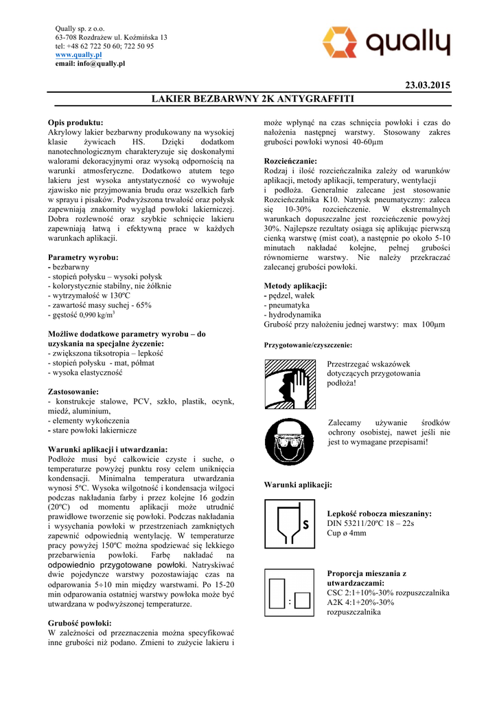 Qually sp. z o.o. 63-708 Rozdrażew ul. Koźmińska 13 tel: +48 62 722 50 60; 722 50 95 www.qually.pl email: [email protected] 23.03.2015 LAKIER BEZBARWNY 2K ANTYGRAFFITI Opis produktu: Akrylowy lakier bezbarwny produkowany na wysokiej klasie żywicach HS. Dzięki dodatkom nanotechnologicznym charakteryzuje się doskonałymi walorami dekoracyjnymi oraz wysoką odpornością na warunki atmosferyczne. Dodatkowo atutem tego lakieru jest wysoka antystatyczność co wywołuje zjawisko nie przyjmowania brudu oraz wszelkich farb w sprayu i pisaków. Podwyższona trwałość oraz połysk zapewniają znakomity wygląd powłoki lakierniczej. Dobra rozlewność oraz szybkie schnięcie lakieru zapewniają łatwą i efektywną prace w każdych warunkach aplikacji. Parametry wyrobu: - bezbarwny - stopień połysku – wysoki połysk - kolorystycznie stabilny, nie żółknie - wytrzymałość w 130ºC - zawartość masy suchej - 65% - gęstość 0,990 kg/m3 Możliwe dodatkowe parametry wyrobu – do uzyskania na specjalne życzenie: - zwiększona tiksotropia – lepkość - stopień połysku - mat, półmat - wysoka elastyczność Zastosowanie: - konstrukcje stalowe, PCV, szkło, plastik, ocynk, miedź, aluminium, - elementy wykończenia - stare powłoki lakiernicze Warunki aplikacji i utwardzania: Podłoże musi być całkowicie czyste i suche, o temperaturze powyżej punktu rosy celem uniknięcia kondensacji. Minimalna temperatura utwardzania wynosi 5ºC. Wysoka wilgotność i kondensacja wilgoci podczas nakładania farby i przez kolejne 16 godzin (20ºC) od momentu aplikacji może utrudnić prawidłowe tworzenie się powłoki. Podczas nakładania i wysychania powłoki w przestrzeniach zamkniętych zapewnić odpowiednią wentylację. W temperaturze pracy powyżej 150ºC można spodziewać się lekkiego przebarwienia powłoki. Farbę nakładać na odpowiednio przygotowane powłoki. Natryskiwać dwie pojedyncze warstwy pozostawiając czas na odparowania 5÷10 min między warstwami. Po 15-20 min odparowania ostatniej warstwy powłoka może być utwardzana w podwyższonej temperaturze. Grubość powłoki: W zależności od przeznaczenia można specyfikować inne grubości niż podano. Zmieni to zużycie lakieru i może wpłynąć na czas schnięcia powłoki i czas do nałożenia następnej warstwy. Stosowany zakres grubości powłoki wynosi 40-60µm Rozcieńczanie: Rodzaj i ilość rozcieńczalnika zależy od warunków aplikacji, metody aplikacji, temperatury, wentylacji i podłoża. Generalnie zalecane jest stosowanie Rozcieńczalnika K10. Natrysk pneumatyczny: zaleca się 10-30% rozcieńczenie. W ekstremalnych warunkach dopuszczalne jest rozcieńczenie powyżej 30%. Najlepsze rezultaty osiąga się aplikując pierwszą cienką warstwę (mist coat), a następnie po około 5-10 minutach nakładać kolejne, pełnej grubości równomierne warstwy. Nie należy przekraczać zalecanej grubości powłoki. Metody aplikacji: - pędzel, wałek - pneumatyka - hydrodynamika Grubość przy nałożeniu jednej warstwy: max 100µm Przygotowanie/czyszczenie: Przestrzegać wskazówek dotyczących przygotowania podłoża! Zalecamy używanie środków ochrony osobistej, nawet jeśli nie jest to wymagane przepisami! Warunki aplikacji: Lepkość robocza mieszaniny: DIN 53211/20ºC 18 – 22s Cup ø 4mm Proporcja mieszania z utwardzaczami: CSC 2:1+10%-30% rozpuszczalnika A2K 4:1+20%-30% rozpuszczalnika Qually sp. z o.o. 63-708 Rozdrażew ul. Koźmińska 13 tel: +48 62 722 50 60; 722 50 95 www.qually.pl email: [email protected] 12.01.2015 LAKIER BEZBARWNY 2K ANTYGARFFITI Natrysk pneumatyczny: Dysza natryskowa: 1,2 – 1,5 mm Ciśnienie 2 – 4 bar Wydajność przy 50µm – 16m2/l Natrysk hydrodynamiczny: W zależności od parametrów wyrobu Dysza natryskowa: 0,009 – 0,015 cal Ciśnienie 100 – 220 bar Wydajność przy 50µm – 16m2/l Odparowanie: Pyłosuchość 20ºC 10 minut Pyłosuchość 60ºC 5 minut Schnięcie: - dla 20º C Utrata przylepności: 30 min Twardość użytkowa: 12 godz - dla 60ºC Utrata przylepności: 15 min Twardość użytkowa: 45 min Uwagi: Utwardzacz CSC i A2K są wrażliwe na wilgoć. Do czasu użycia powinny być przechowywane w dokładnie zamkniętych puszkach w suchym miejscu. Puszkę z utwardzaczem otwierać ostrożnie, ponieważ może panować w niej nadciśnienie. Nawet śladowe ilości wody w mieszaninie składników powoduje skrócenie czasu przydatności do stosowania oraz defekty w powłoce. Wyroby uzupełniające: Utwardzacz CSC 2:1 Utwardzacz A2K 4:1 Rozcieńczalnik K10 Magazynowanie: W oryginalnie zamkniętych opakowaniach 24 miesiące przy temperaturze magazynowania i transportu nie przekraczającej 25ºC i nie niższej niż 5ºC. Dla utwardzacza czas przydatności wynosi 6 miesięcy. Wielkość opakowań – 1/5/10 litr i inne na życzenie klienta VOC-OK. – wyrób zgodny z przepisami dotyczącymi Lotnych Związków Organicznych Lakier zgodny z dyrektywą nr 2004/42/EC oraz Rozporządzeniem Ministra Gospodarki Dz.U. nr.11, poz.72 z dnia 16.01.2007 w sprawie szczególnych wymagań dotyczących ograniczenia emisji lotnych związków organicznych powstających w wyniku wykorzystywania rozpuszczalników organicznych w niektórych farbach i lakierach oraz w preparatach do odnawiania pojazdów o ile są stosowane zgodnie z przeznaczeniem. Informacje dotyczące VOC/LZO: LZO | g/1 | ISO 11890–2 | 2002 | Norma dopuszczalna dla: Wykończenia specjalne | Wszystkie typy | 840 | Zawartość LZO w wyrobie: w zależności od proporcji z utw. 2:1 – 511 Wyrób tylko do użytku profesjonalnego!