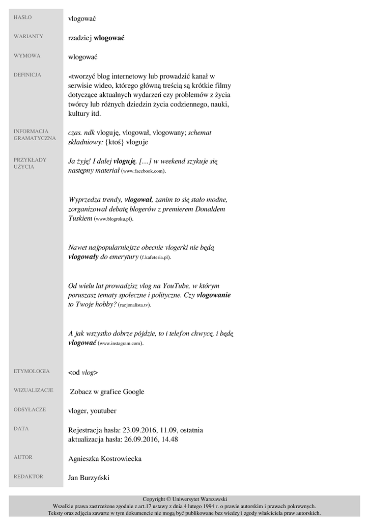 vlogować rzadziej wlogować wlogować «tworzyć blog internetowy