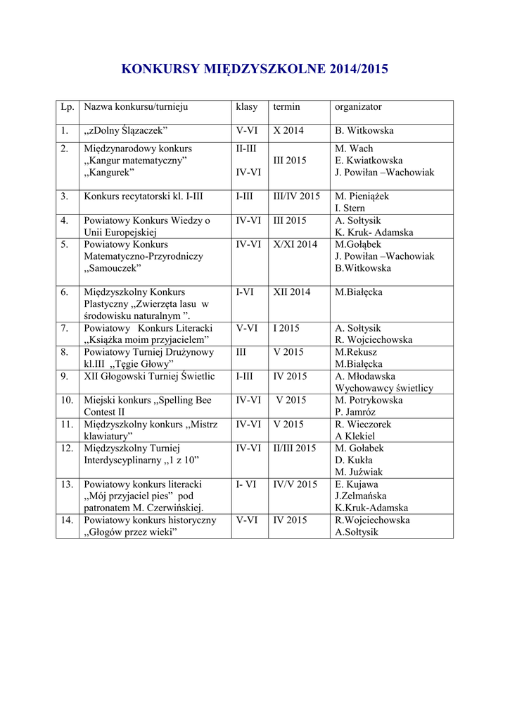KONKURSY MIĘDZYSZKOLNE 2014/2015 Lp. Nazwa konkursu/turnieju klasy termin organizator 1. ,,zDolny Ślązaczek” V-VI X 2014 B. Witkowska 2. Międzynarodowy konkurs ,,Kangur matematyczny” ,,Kangurek” II-III III 2015 M. Wach E. Kwiatkowska J. Powiłan –Wachowiak 3. Konkurs recytatorski kl. I-III I-III III/IV 2015 4. Powiatowy Konkurs Wiedzy o Unii Europejskiej Powiatowy Konkurs Matematyczno-Przyrodniczy ,,Samouczek” IV-VI III 2015 IV-VI X/XI 2014 Międzyszkolny Konkurs Plastyczny ,,Zwierzęta lasu w środowisku naturalnym ”. Powiatowy Konkurs Literacki ,,Książka moim przyjacielem” Powiatowy Turniej Drużynowy kl.III ,,Tęgie Głowy” XII Głogowski Turniej Świetlic I-VI XII 2014 M.Białęcka V-VI I 2015 III V 2015 I-III IV 2015 Miejski konkurs ,,Spelling Bee Contest II Międzyszkolny konkurs ,,Mistrz klawiatury” Międzyszkolny Turniej Interdyscyplinarny ,,1 z 10” IV-VI V 2015 IV-VI V 2015 IV-VI II/III 2015 Powiatowy konkurs literacki ,,Mój przyjaciel pies” pod patronatem M. Czerwińskiej. Powiatowy konkurs historyczny ,,Głogów przez wieki” I- VI IV/V 2015 V-VI IV 2015 A. Sołtysik R. Wojciechowska M.Rekusz M.Białęcka A. Młodawska Wychowawcy świetlicy M. Potrykowska P. Jamróz R. Wieczorek A Klekiel M. Gołabek D. Kukła M. Juźwiak E. Kujawa J.Zelmańska K.Kruk-Adamska R.Wojciechowska A.Sołtysik 5. 6. 7. 8. 9. 10. 11. 12. 13. 14. IV-VI M. Pieniążek I. Stern A. Sołtysik K. Kruk- Adamska M.Gołąbek J. Powiłan –Wachowiak B.Witkowska