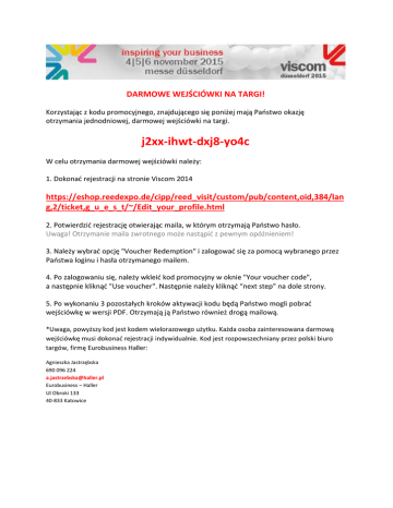 DARMOWE WEJŚCIÓWKI NA TARGI! Korzystając z kodu promocyjnego, znajdującego się poniżej mają Państwo okazję otrzymania jednodniowej, darmowej wejściówki na targi. j2xx-ihwt-dxj8-yo4c W celu otrzymania darmowej wejściówki należy: 1. Dokonać rejestracji na stronie Viscom 2014 https://eshop.reedexpo.de/cipp/reed_visit/custom/pub/content,oid,384/lan g,2/ticket,g_u_e_s_t/~/Edit_your_profile.html 2. Potwierdzić rejestrację otwierając maila, w którym otrzymają Państwo hasło. Uwaga! Otrzymanie maila zwrotnego może nastąpić z pewnym opóźnieniem! 3. Należy wybrać opcję "Voucher Redemption" i zalogować się za pomocą wybranego przez Państwa loginu i hasła otrzymanego mailem. 4. Po zalogowaniu się, należy wkleić kod promocyjny w oknie "Your voucher code", a następnie kliknąć "Use voucher". Następnie należy kliknąć “next step” na dole strony. 5. Po wykonaniu 3 pozostałych kroków aktywacji kodu będą Państwo mogli pobrać wejściówkę w wersji PDF. Otrzymają ją Państwo również drogą mailową. *Uwaga, powyższy kod jest kodem wielorazowego użytku. Każda osoba zainteresowana darmową wejściówkę musi dokonać rejestracji indywidualnie. Kod jest rozpowszechniany przez polski biuro targów, firmę Eurobusiness Haller: Agnieszka Jastrzębska 690 096 224 [email protected] Eurobusiness – Haller Ul Obroki 133 40-833 Katowice