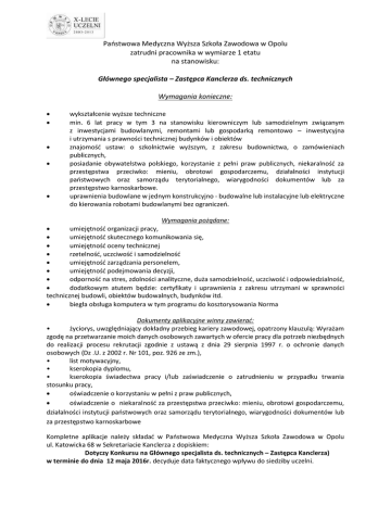 Państwowa Medyczna Wyższa Szkoła Zawodowa w Opolu zatrudni pracownika w wymiarze 1 etatu na stanowisku: Głównego specjalista – Zastępca Kanclerza ds. technicznych Wymagania konieczne: wykształcenie wyższe techniczne min. 6 lat pracy w tym 3 na stanowisku kierowniczym lub samodzielnym związanym z inwestycjami budowlanymi, remontami lub gospodarką remontowo – inwestycyjna i utrzymania s prawności technicznej budynków i obiektów znajomość ustaw: o szkolnictwie wyższym, z zakresu budownictwa, o zamówieniach publicznych, posiadanie obywatelstwa polskiego, korzystanie z pełni praw publicznych, niekaralność za przestępstwa przeciwko: mieniu, obrotowi gospodarczemu, działalności instytucji państwowych oraz samorządu terytorialnego, wiarygodności dokumentów lub za przestępstwo karnoskarbowe. uprawnienia budowlane w jednym konstrukcyjno - budowalne lub instalacyjne lub elektryczne do kierowania robotami budowlanymi bez ograniczeń. Wymagania pożądane: umiejętność organizacji pracy, umiejętność skutecznego komunikowania się, umiejętność oceny technicznej rzetelność, uczciwość i samodzielność umiejętność zarządzania personelem, umiejętność podejmowania decyzji, odporność na stres, zdolności analityczne, duża samodzielność, uczciwość i odpowiedzialność, dodatkowym atutem będzie: certyfikaty i uprawnienia z zakresu utrzymani w sprawności technicznej budowli, obiektów budowalnych, budynków itd. biegła obsługa komputera w tym programu do kosztorysowania Norma Dokumenty aplikacyjne winny zawierać: • życiorys, uwzględniający dokładny przebieg kariery zawodowej, opatrzony klauzulą: Wyrażam zgodę na przetwarzanie moich danych osobowych zawartych w ofercie pracy dla potrzeb niezbędnych do realizacji procesu rekrutacji zgodnie z ustawą z dnia 29 sierpnia 1997 r. o ochronie danych osobowych (Dz .U. z 2002 r. Nr 101, poz. 926 ze zm.), • list motywacyjny, • kserokopia dyplomu, • kserokopia świadectwa pracy i/lub zaświadczenie o zatrudnieniu w przypadku trwania stosunku pracy, oświadczenie o korzystaniu w pełni z praw publicznych, oświadczenie o niekaralność za przestępstwa przeciwko: mieniu, obrotowi gospodarczemu, działalności instytucji państwowych oraz samorządu terytorialnego, wiarygodności dokumentów lub za przestępstwo karnoskarbowe Kompletne aplikacje należy składać w Państwowa Medyczna Wyższa Szkoła Zawodowa w Opolu ul. Katowicka 68 w Sekretariacie Kanclerza z dopiskiem: Dotyczy Konkursu na Głównego specjalista ds. technicznych – Zastępca Kanclerza) w terminie do dnia 12 maja 2016r. decyduje data faktycznego wpływu do siedziby uczelni.