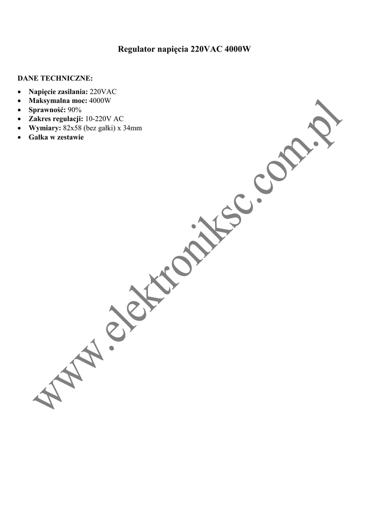 Regulator napięcia 220VAC 4000W DANE TECHNICZNE: • • • • • • Napięcie zasilania: 220VAC Maksymalna moc: 4000W Sprawność: 90% Zakres regulacji: 10-220V AC Wymiary: 82x58 (bez gałki) x 34mm Gałka w zestawie