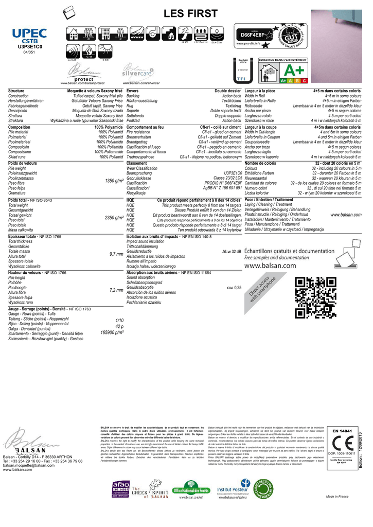 LES FIRST D66F4E8F <2 kV < 0.17m ²C°/W ÄLw 32dB U3P3E1C0 04/051 áù 0,25 5-6/8 Z 156 601 591 www.balsan.com/balsanprotect www.balsan.com/silvercar Moquette à velours Saxony frisé Tufted carpet, Saxony frisé pile Getufteter Velours Saxony Frise BGetuft tapijt, Saxony frise Moqueta de fibra Saxony rizada Moquette velluto Saxony frisé Wykladzina o runie typu welur Saksonski frise 100% Polyamide 100% Polyamid 100% Polyamid 100% Polyamide 100% Poliamida 100% Poliammide 100% Poliamid Poids total - NF ISO 8543 Total weight Gesamtgewicht Totaal gewicht Peso total Peso totale Masa calkowita Epaisseur totale - NF ISO 1765 Total thickness Gesamtdicke Totale massa Altura total Spessore totale Wysokosc calkowita Hauteur du velours - NF ISO 1766 Pile height Polhöhe Poolhoogte Altura fibra Spessore felpa Wysokosc runa Jauge - Serrage (points) - Densité - NF ISO 1763 Gauge - Rows (points) - Tufts Teilung - Stiche (points) - Noppenzahl Rijen - Deling (points) - Noppenaantal Galga - Densidad (puntos) Scartamento - Serraggio (punti) - Densità felpa Zaciesnienie - Rozstaw igiel (punkty) - Gestosc Balsan - Corbilly D14 - F 36330 ARTHON Tel : +33 254 29 16 00 - Fax : +33 254 36 79 08 [email protected] www.balsan.com Envers Backing Rückenausstattung Rug Soporte Sottofondo Podklad Comportement au feu Fire resistance Brennverhalten Brandgedrag Clasificación al fuego Comportamento al fuoco Trudnozapalnosc Classement Wear Classification Beanspruchung Gebruiksklasse 1350 g/m² Clasificación Classificazioni Klasyfikacja Double dossier Action back Textilrücken Textielrug Doble soporte textil Doppio supporto Action back Cfl-s1 - collé sur ciment Cfl-s1 - glued on cement Cfl-s1 - geklebt auf Zement Cfl-s1 - verlijmd op cement Cfl-s1 - pegado en cemento Cfl-s1 - incollato su cemento Cfl-s1 - klejone na podlozu betonowym U3P3E1C0 Classe 23/32 LC5 PRODIS N° D66F4E8F AgBB N° Z 156 601 591 HQE Ce produit répond parfaitement à 8 des 14 cibles HQE This product meets perfectly 8 from the 14 targets HQE Dieses Produkt erfüllt 8 von den 14 Zielen HQE Dit product beantwoordt aan 8 van de 14 doelstellingen. 2350 g/m² HQE Este producto responde perfectamente a 8 de los 14 objetivos HQE Questo prodotto risponde perfettamente a 8 di 14 target HQE Ten produkt odpowiada 8 z 14 kryteriow Isolation aux bruits d’ impacts - NF EN ISO 140-8 Impact sound insulation Trittschalldämmung Geluidsreductie ÄLw 32 dB 9,7 mm Aislamiento a los ruidos de impactos Rumore all'impatto Izolacja halasu uderzeniowego Absorption aux bruits aériens - NF EN ISO 11654 Sound absorption Schallabsorptionsgrad Geluidsabsorptie áù 0,25 7,2 mm Absorción de los ruidos aéreos Isolazione acustica Pochlanianie dzwieku Largeur à la pièce 4+5 m dans certains coloris Width in Roll 4+5 m in some colours Lieferbreite in Rolle 4+5 m in einigen Farben Rolbreedte Leverbaar in 4 en 5 meter in dezelfde kleur Ancho por pieza 4+5 m segun colores Larghezza rotolo 4-5 m per certi colori Szerokosc w rolce 4 m i w niektorych kolorach 5 m Largeur à la coupe 4+5m dans certains coloris Width in Cut-length 4 and 5m in some colours Lieferbreite in Coupon 4 und 5m in einigen Farben Couponbreedte Leverbaar in 4 en 5 meter in dezelfde kleur Ancho por trozo 4+5 m segun colores Larghezza taglio 4-5 m per certi colori Szerokosc w kuponie 4 m i w niektorych kolorach 5 m Nombre de coloris 32 - dont 20 coloris en 5 m Colours 32 - including 20 colours in 5 m Erhältliche Farben 32 - darunter 20 Farben in 5 m Kleurenaantal 32 - waarvan 20 kleuren in 5 m Cantidad de colores 32 - de los cuales 20 colores en formato 5 m Numero colori 32 , di cui 20 tinte nel formato 5 m Liczba kolorów 32 - w tym 20 kolorów w szerokosci 5 m Pose / Entretien / Traitement Laying / Cleaning / Treatment Verlegehinweis / Reinigung / Behandlung Plaatsinstructie / Reiniging / Onderhoud www.balsan.com Instalación / Mantenimiento / Tratamiento Posa / Manutenzione / Trattamenti Ukladanie / Utrzymanie w czystosci / Impregnacja 1/10 42 p 165900 p/m² BALSAN se réserve le droit de modifier les caractéristiques de ce produit tout en conservant les mêmes qualités techniques. Dans le cadre d’une utilisation professionnelle, il est fortement conseillé d’utiliser des coloris moyens et foncés pour les pièces à grand trafic. De légères variations de coloris peuvent être observées entre les différents bains de teinture. BALSAN reserves the right to modify the characteristics of this product while keeping the same technical properties. In the context of business use, we strongly recommend the use of darker colours for heavy traffic areas. Slight differences in colour may occur between different dye baths. BALSAN behält sich das Recht vor, die Beschaffenheit dieses Artikels zu verändern, dabei jedoch die gleichen technischen Eigenschaften beizubehalten. In gewerblich stark beanspruchten Räumen empfehlen wir mittlere bis dunkle Farben. Zwischen den verschiedenen Farbbädern kann es zu leichten Farbabweichungen kommen. Balsan behoudt zich het recht voor de kenmerken van het product te wijzigen, weliswaar met behoud van de technische eigenschappen. Bij project toepassingen, adviseren we sterk het gebruik van donkere kleuren voor zwaar belopen omgevingen. Er kan een lichte variatie in kleur optreden tussen de verschillende kleurbaden. Balsan se reserva el derecho a modificar las especificaciones arriba referenciadas. En el contexto de uso industrial o comercial, recomendamos los colores oscuros para las zonas de trafico intenso. Se pueden observar ligeras variaciones de color entre los distintos baños de tinte. Balsan si riserva il diritto di modificare le caratteristiche del prodotto in qualsiasi momento mantenendo la stessa qualità tecnica. Per l’uso di tipo contract si consigliano colori melangiati per le zone ad altro traffico. Tra i diversi bagni di tintura si possono osservare leggere variazioni di tinta. Firma BALSAN zastrzega sobie prawo do modyfikacji parametrow produktu przy zacho