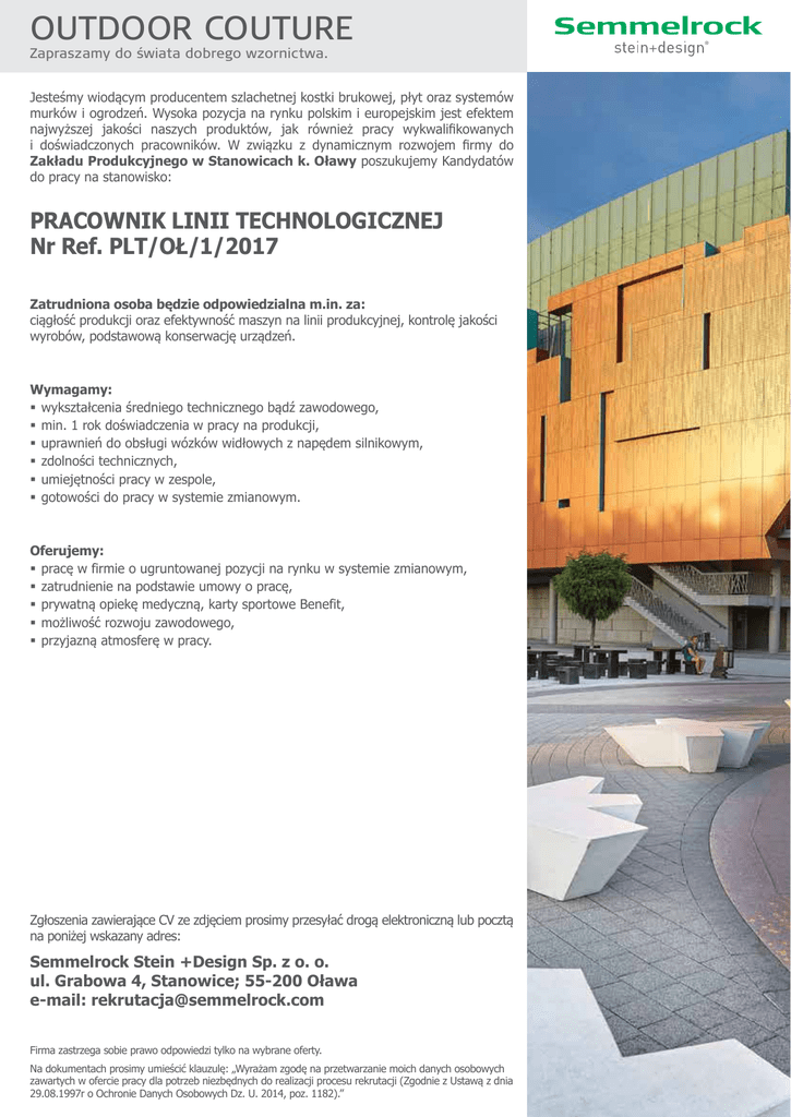 OUTDOOR COUTURE Zapraszamy do świata dobrego wzornictwa. Jesteśmy wiodącym producentem szlachetnej kostki brukowej, płyt oraz systemów murków i ogrodzeń. Wysoka pozycja na rynku polskim i europejskim jest efektem najwyższej jakości naszych produktów, jak również pracy wykwalifikowanych i doświadczonych pracowników. W związku z dynamicznym rozwojem firmy do Zakładu Produkcyjnego w Stanowicach k. Oławy poszukujemy Kandydatów do pracy na stanowisko: PRACOWNIK LINII TECHNOLOGICZNEJ Nr Ref. PLT/OŁ/1/2017 Zatrudniona osoba będzie odpowiedzialna m.in. za: ciągłość produkcji oraz efektywność maszyn na linii produkcyjnej, kontrolę jakości wyrobów, podstawową konserwację urządzeń. Wymagamy: wykształcenia średniego technicznego bądź zawodowego, min. 1 rok doświadczenia w pracy na produkcji, uprawnień do obsługi wózków widłowych z napędem silnikowym, zdolności technicznych, umiejętności pracy w zespole, gotowości do pracy w systemie zmianowym. Oferujemy: pracę w firmie o ugruntowanej pozycji na rynku w systemie zmianowym, zatrudnienie na podstawie umowy o pracę, prywatną opiekę medyczną, karty sportowe Benefit, możliwość rozwoju zawodowego, przyjazną atmosferę w pracy. Zgłoszenia zawierające CV ze zdjęciem prosimy przesyłać drogą elektroniczną lub pocztą na poniżej wskazany adres: Semmelrock Stein +Design Sp. z o. o. ul. Grabowa 4, Stanowice; 55-200 Oława e-mail: [email protected] Firma zastrzega sobie prawo odpowiedzi tylko na wybrane oferty. Na dokumentach prosimy umieścić klauzulę: „Wyrażam zgodę na przetwarzanie moich danych osobowych zawartych w ofercie pracy dla potrzeb niezbędnych do realizacji procesu rekrutacji (Zgodnie z Ustawą z dnia 29.08.1997r o Ochronie Danych Osobowych Dz. U. 2014, poz. 1182).”