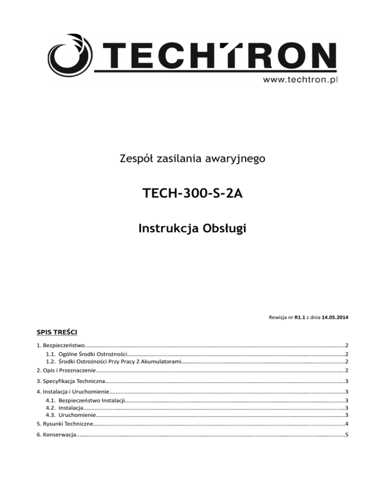 Zespół zasilania awaryjnego TECH-300-S-2A Instrukcja Obsługi Rewizja nr R1.1 z dnia 14.05.2014 SPIS TREŚCI 1. Bezpieczeństwo.................................................................................................................................................................2 1.1. Ogólne Środki Ostrożności......................................................................................................................................2 1.2. Środki Ostrożności Przy Pracy Z Akumulatorami.....................................................................................................2 2. Opis i Przeznaczenie..........................................................................................................................................................2 3. Specyfikacja Techniczna....................................................................................................................................................3 4. Instalacja i Uruchomienie.................................................................................................................................................3 4.1. Bezpieczeństwo Instalacji........................................................................................................................................3 4.2. Instalacja.................................................................................................................................................................3 4.3. Uruchomienie..........................................................................................................................................................3 5. Rysunki Techniczne...........................................................................................................................................................4 6. Konserwacja......................................................................................................................................................................5 Zespół zasilania awaryjnego Model: TECH-300-S-2A 1. BEZPIECZEŃSTWO 1.1. OGÓLNE ŚRODKI OSTROŻNOŚCI • Przed rozpoczęciem eksploatacji należy dokładnie zapoznać się z niniejszą Instrukcją Obsługi. • Urządzenie przeznaczone jest do pracy wewnątrz pomieszczeń. Niedozwolone jest narażanie urządzenia na bezpośrednie działanie promieni słonecznych. • Nie dopuścić do przedostania się do wnętrza urządzenia jakichkolwiek przedmiotów lub płynów. • Nie zasłaniać otworów wentylacyjnych, w celu poprawnej wentylacji należy nie umieszczać innych przedmiotów/urządzeń w odległości mniejszej niż 10cm od każdego boku. 1.2. ŚRODKI OSTROŻNOŚCI PRZY PRACY Z AKUMULATORAMI • Nie palić oraz nie dopuszczać do upadku iskry w pobliżu akumulatorów. • Nie kłaść metalowych narzędzi na akumulatorach, może to doprowadzić do zwarcia i powstania iskry, która z kolei może rozproszyć ogień. • Podczas pracy z akumulatorami należy zdjąć metalowe rzeczy osobiste takie jak pierścionki, bransoletki, naszyjniki czy zegarki. • Gdy dojdzie do kontaktu kwasu pochodzącego z akumulatora ze skórą lub ubraniem, należy natychmiast go zmyć używając mydła i wody. Jeżeli kwas ten dostanie się do oczu należy natychmiast przepłukiwać oko bieżącą zimną wodą przez przynajmniej 20 minut oraz wezwać lekarza. 2. OPIS I PRZEZNACZENIE Urządzenie TECH-300-S-2A jest urządzeniem typu zasilacza awaryjnego stanowiącego źródło przemiennego napięcia awaryjnego. Podczas obecności na wejściu przemiennego napięcia sieciowego jest ono przekazywane bezpośrednio na wyjście urządzenia, a akumulator jest ładowany za pomocą wbudowanej ładowarki. Ten tryb pracy nazywany jest sieciowym. W przypadku zaniku przemiennego napięcia sieciowego na wejściu urządzenie przechodzi w tryb pracy bateryjnej ze zwłoką do 5 sekund. Wówczas napięcie stałe dostarczane przez akumulator jest przetwarzane przez inwertor na napięcie przemienne o kształcie czysto sinusoidalnym i parametrach U SK = 230 VAC, f = 50 Hz. Podczas pracy w trybie bateryjnym następuje rozładowywanie akumulatora, gdy napięcie akumulatora osiągnie wartość ok. 11V urządzenie sygnalizuje za pomocą dźwięku ten stan ostrzegając użytkownika o zbliżającym się rozładowaniu akumulatora i wyłączeniu urządzenia. Gdy natomiast wartość napięcia akumulatora osiągnie wartość ok. 10.5V następuje wyłączenie urządzenia zabezpieczając w ten sposób akumulator przed głębokim rozładowaniem. Należy jednak pamiętać iż w tym stanie pobierany jest minimalny prąd z akumulatora w związku z czym w przypadku długotrwałej awarii należy dokonać fizycznego odłączenia przewodów bateryjnych od akumulatora. Gdy nastąpi powrót wejściowego napięcia przemiennego urządzenie automatycznie przełączy się w tryb pracy sieciowej ze zwłoką czasową wynoszącą 1 sekundę. Rys. 2.1.1.1. Rys. 2.1.1.2. Schemat blokowy TECH-300-S-2A 2/4 TECH-300-S-2A-manual_ R1.1, 14.05.2014 Zespół zasilania awaryjnego Model: TECH-300-S-2A 3. SPECYFIKACJA TECHNICZNA MODEL TECH-300-S-2A WYJŚCIE BATERIA WEJŚCIE AC ZABEZPIECZENIA WEJŚCIA AC ZABEZPIECZENIA BATERII Moc znamionowa Częstotliwość napięcia wyjściowego Kształt napięcia wyjściowego Nominalne napięcia akumulatora Zakres napięć akumulatora Prąd pobierany z akumulatora (max.) - tryb bateryjny Sprawność (typ.) - tryb bateryjny Typ akumulatora Parametry ładowania akumulatora Zakres napięcia wejściowego Prąd pobierany z sieci AC(typ.) Prąd rozruchowy Bezpiecznik wejściowy AC Przed odwrotnym podłączeniem Sygnalizacja niskiego napięcia akumulatora [1] RGR(rozłączenie głębokiego rozładowania) [2] Zwarciowe/przeciążeniowe – tryb sieciowy Przeciążeniowe – tryb bateryjny ZABEZPIECZENIA WYJŚCIA ŚRODOWISKO PRACY INNE 300W 50Hz ± 1% Przebieg sinusoidalny THD < 4% 12V 10.5 ÷ 15V 32A 81% Bezobsługowe, kwasowo-ołowiowe VRLA AGM 13.