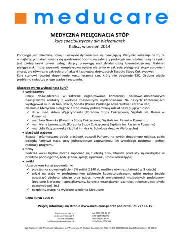 MEDYCZNA PIELĘGNACJA STÓP kurs specjalistyczny dla pielęgniarek Kalisz, wrzesień 2014 Podologia jest dziedziną nową i niezwykle dynamicznie się rozwijającą. Wszystko wskazuje na to, że w najbliższych latach można się spodziewać boomu na gabinety podologiczne. Istotną niszą na rynku jest pielęgniarski zakres usług, dający przewagę nad działalnością kosmetologiczną. Gabinet pielęgniarski może zapewnić kompleksową opiekę nie tylko w zakresie pielęgnacji stopy zdrowiej i chorej, ale również w zakresie profilaktyki i zabiegów dotyczących Zespołu Stopy Cukrzycowej. Kurs stanowi również dopełnienie kursu leczenia ran, który nie obejmuje ZSC. Osobne ujęcie problemu świadczy o jego wadze i znaczeniu. Dlaczego warto wybrać nasz kurs? wykładowcy Dzięki doświadczeniu w zakresie organizowania konferencji naukowo-szkoleniowych nawiązaliśmy kontakty z wieloma znakomitymi wykładowcami. Na naszych konferencjach występował m.in. dr hab. Maciej Sopata (Prezes Polskiego Towarzystwa Leczenia Ran). Na kursie Medyczna pielęgnacja stóp mamy potwierdzony udział następujących osób: dr n. med. Adam Węgrzynowski (Poradnia Stopy Cukrzycowej Szpitala im. Raszei w Poznaniu) mgr Sara Nowicka (Poradnia Stopy Cukrzycowej Szpitala im. Raszei w Poznaniu) mgr Maria Jarmuszczak (Poradnia Stopy Cukrzycowej Szpitala im. Raszei w Poznaniu) mgr Lidia Krzyżanowska (Szpital im. dra A. Sokołowskiego w Wałbrzychu) placówki stażowe Bogaty i zróżnicowany dobór placówek pozwoli Państwu na wybór dogodnego miejsca, gdzie odbędą Państwo staże, przy jednoczesnym zapewnieniu ich wysokiego poziomu i pełnej realizacji programu. firmy Podczas kursu będzie można zapoznać się z ofertą firm, których produkty są niezbędne w praktyce podologicznej (odciążenia, sprzęt, opatrunki, środki odkażające). zniżki Uczestnikom kursu zapewniamy: przy jednorazowej wpłacie - 5% zniżki (1140 zł; możliwa również płatność w 3 ratach) zniżki na staże w profesjonalnym gabinecie kosmetologicznym, gdzie można będzie poszerzyć zdobytą wiedzę oraz nabyć nowych umiejętności niezbędnych podologowi (pedicure klasyczny i specjalistyczny, korekcja wrastających paznokci, rekonstrukcja płytki paznokciowej i in.) bezpłatny wstęp na wybrane szkolenia Meducare Cena kursu 1200 zł. Więcej informacji na stronie www.meducare.pl oraz pod nr tel. 71 727 16 15 Interrete sp. z o. o. ul. Leszczyńskiego 4 50-078 Wrocław [email protected] tel. (71) 727 16 15 KRS 0000448306 NIP 8952018419 REGON 022058554 Sąd Rejonowy dla Wrocławia-Fabrycznej we Wrocławiu, VI Wydział Gospodarczy KRS, nr KRS 0000448306; kapitał zakładowy: 20 000 zł MEDYCZNA PIELĘGNACJA STÓP kurs specjalistyczny dla pielęgniarek Kalisz, wrzesień 2014 Cel kursu: Nabycie umiejętności w zakresie pielęgnacji stóp zdrowych i zmienionych chorobowo. Tryb kształcenia: mieszany Czas trwania: zajęcia teoretyczne: 105 godzin Moduł 1: Pielęgnacja stopy zdrowej - 25 godzin Cel: Umiejętność wykonania zabiegów higieniczno – pielęgnacyjne stopy zdrowej. Moduł 2: Pielęgnacja stopy chorej - 40 godzin Cel: Umiejętność rozpoznawania zaburzenia w obrębie stopy oraz wykonywania zabiegi pielęgnacyjne i podiatryczne w zależności od rodzaju schorzenia. Moduł 3: Pielęgnacja pacjenta z ZSC - 40 godzin Cel: Pielęgnacja pacjenta z zespołem stopy cukrzycowej. zajęcia stażowe: 70 godzin dom pomocy społecznej albo zakład pielęgnacyjno – opiekuńczy - 35 godzin poradnia stopy cukrzycowej albo oddział/poradnia chirurgii naczyń - 35 godzin Możliwy jest również udział w pojedynczych modułach jako "wolny słuchacz" (część teoretyczna): Moduł 1: Pielęgnacja stopy zdrowej - 400 zł Moduł 2: Pielęgnacja stopy chorej - 500 zł Moduł 3: Pielęgnacja pacjenta z ZSC - 500 zł W tym wypadku zostanie wydane zaświadczenie Meducare o udziale w szkoleniu. Wg rozporządzenia Ministra Zdrowia z z dnia 7 listopada 2007 r. w sprawie rodzaju i zakresu świadczeń zapobiegawczych, diagnostycznych, leczniczych i rehabilitacyjnych udzielanych przez pielęgniarkę albo położną samodzielnie bez zlecenia lekarskiego (Dz. U. z dnia 14 listopada 2007 r.) pielęgniarka jest uprawniona do wykonywania samodzielnie bez zlecenia lekarskiego świadczeń diagnostycznych obejmujących w zakresie leczenia ran m.in.: dobór sposobów i opatrywanie oparzeń, ran, odleżyn (do III° włącznie) oraz przetok, pod warunkiem odbycia kursu specjalistycznego, zdejmowanie szwów, pod warunkiem odbycia kursu specjalistycznego Interrete sp. z o. o. ul. Leszczyńskiego 4 50-078 Wrocław [email protected] tel. (71) 727 16 15 KRS 0000448306 NIP 8952018419 REGON 022058554 Sąd Rejonowy dla Wrocławia-Fabrycznej we Wrocławiu, VI Wydział Gospodarczy KRS, nr KRS 0000448306; kapitał zakładowy: 20 000 zł