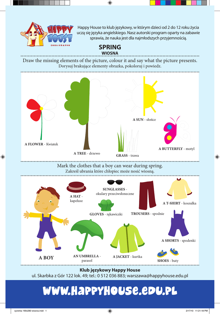 Happy House to klub językowy, w którym dzieci od 2 do 12 roku życia uczą się języka angielskiego. Nasz autorski program oparty na zabawie sprawia, że nauka jest dla najmłodszych przyjemnością. SPRING WIOSNA Draw the missing elements of the picture, colour it and say what the picture presents. Dorysuj brakujące elementy obrazka, pokoloruj i powiedz. A SUN - słońce A FLOWER - Kwiatek A TREE - drzewo A BUTTERFLY - motyl GRASS - trawa Mark the clothes that a boy can wear during spring. Zakreśl ubrania które chłopiec może nosić wiosną. A HAT kapelusz SUNGLASSES okulary przeciwsłoneczne A T-SHIRT - koszulka GLOVES - rękawiczki TROUSERS - spodnie A SHORTS - spodenki A BOY AN UMBRELLA parasol A JACKET - kurtka SHOES - buty Klub językowy Happy House ul. Skarbka z Gór 122 lok. 49; tel.: 0 512 036 883; [email protected] syrenka 190x280 wiosna.indd 1 2/17/10 11:21:18 PM