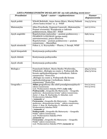LISTA PODRĘCZNIKÓW DO KLASY III na rok szkolny 2016/2017 Przedmiot Tytuł – autor – wydawnictwo Numer dopuszczenia Język polski Witold Bobiński, Anna Janus-Sitarz, Maciej Pabisek „Nowe lustra świata” cz. 5 - WSiP 704/5/2014 Matematyka 540/3/2014 Język niemiecki Alina Przychoda, Zygmunt Łaszczyk „Matematyka. Poznać zrozumieć. Kształcenie w zakresie podstawowym. Klasa III”- WSiP Repetytorium maturalne – poziom podstawowy – PEARSON LONGMAN (grupa mniej zaawansowana), praca zbiorowa Repetytorium – poziom podstawowy + poziom rozszerzony – Macmillan Fokus 2, A. Kryczyńska – Pharm, J. Szczęk, WSiP Język hiszpański Kontynuacja podręcznika Język chiński Kontynuacja podręcznika Język włoski Kontynuacja podręcznika Biologia r Franciszek Dubert, Maria Marko-Worłowska, Władysław „Biologia na czasie 2. Podręcznik dla liceum ogólnokształcącego i technikum. Zakres rozszerzony” Nowa Era „Biologia na czasie 3. Podręcznik dla liceum ogólnokształcącego i technikum. Zakres rozszerzony” Nowa Era Atlas geograficzny dla szkół ponadgimnazjalnych – Język angielski Geografia r zakres rozszerzony wyd. Wydawnictwo Szkolne PWN /cały rok/ Podręcznik: „Geografia dla Maturzysty – Geografia społeczno- ekonomiczna świata” zakres rozszerzony, Autor: J. Kop, M. Kucharska, E. Szkurłat, wyd. Wydawnictwo Szkolne PWN / semestr 1/ Ćwiczenia: „Geografia dla Maturzysty – Geografia społeczno- ekonomiczna świata ” zakres rozszerzony, Autor: J. Kop, M. Kucharska, E. Szkurłat, wyd. Wydawnictwo Szkolne PWN / semestr 1/ Podręcznik: „Geografia dla Maturzysty – Geografia Polski” zakres rozszerzony, wyd. Wydawnictwo Szkolne PWN /semestr 2/ Ćwiczenia: „Geografia dla Maturzysty – Geografia Polski” zakres rozszerzony, wyd. Wydawnictwo Szkolne PWN /semestr 2/ 696/2014 710/2014 564/2/2013 564/3/2014 610/2/2013 610/3/2014 Historia r WOS r Historia i społeczeństwo „Zrozumieć przeszłość. Podręcznik do historii dla liceum ogólnokształcącego i technikum. Część 3 i 4. Zakres rozszerzony” – Nowa Era Piotr Galik Maciej Batorski, „Ciekawi świata. Część 2 i 3.Wiedza o społeczeństwie. Zakres rozszerzony.” - OPERON 642/3/2014 Marcin Markowicz, Olga Pytlinska, Agata Wyroda „Historia i społeczeństwo. Europa i świat. Podręcznik. Liceum i technikum” WSiP „Historia i społeczeństwo. Wojna i wojskowość. Liceum i technikum” WSiP 667/3/2013 667/4/2013 577/2/2013 577/3/2014