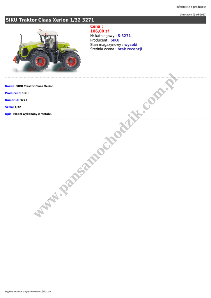 Informacje o produkcie Utworzono 03-03-2017 SIKU Traktor Claas Xerion 1/32 3271 Cena : 106,00 zł .p l Nr katalogowy : S-3271 Producent : SIKU Stan magazynowy : wysoki Średnia ocena : brak recenzji om Nazwa: SIKU Traktor Claas Xerion Producent: SIKU Numer id: 3271 .c Skala: 1/32 w w w .p an sa m oc ho dz ik Opis: Model wykonany z metalu, Wygenerowano w programie www.oscGold.com