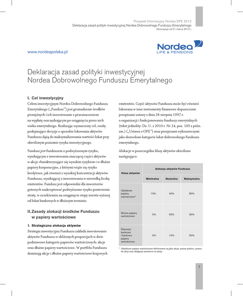 Prospekt Informacyjny Nordea DFE 2012 Deklaracja zasad polityki inwestycyjnej Nordea Dobrowolnego Funduszu Emerytalnego Obowiązuje od 21 marca 2013 r. www.nordeapolska.pl Deklaracja zasad polityki inwestycyjnej Nordea Dobrowolnego Funduszu Emerytalnego I. Cel inwestycyjny Celem inwestycyjnym Nordea Dobrowolnego Funduszu Emerytalnego („Fundusz”) jest gromadzenie środków pieniężnych i ich inwestowanie z przeznaczeniem na wypłatę oszczędzającym po osiągnięciu przez nich wieku emerytalnego. Realizując wyznaczony cel, osoby podejmujące decyzje o sposobie lokowania aktywów Funduszu dążą do maksymalizowania wartości lokat przy określonym poziomie ryzyka inwestycyjnego. Fundusz jest funduszem o podwyższonym ryzyku, wynikającym z inwestowania znaczącej części aktywów w akcje charakteryzujące się wysokim ryzykiem i w dłużne papiery korporacyjne, z którymi wiąże się ryzyko kredytowe, jak również z wysokiej koncentracji aktywów Funduszu, wynikającej z inwestowania w niewielką liczbę emitentów. Fundusz jest odpowiedni dla inwestorów gotowych zaakceptować podwyższone ryzyko poniesienia straty, w oczekiwaniu na osiągnięcie stopy zwrotu wyższej od lokat bankowych w dłuższym terminie. II.Zasady alokacji środków Funduszu w papiery wartościowe emitentów. Część aktywów Funduszu może być również lokowana w inne instrumenty finansowe dopuszczone przepisami ustawy z dnia 28 sierpnia 1997 r. o organizacji i funkcjonowaniu funduszy emerytalnych (tekst jednolity: Dz. U. z 2010 r. Nr 34, poz. 189 z późn. zm.) („Ustawa o OFE”) oraz przepisami wykonawczymi jako dozwolone kategorie lokat dobrowolnego funduszu emerytalnego. Alokacje w poszczególne klasy aktywów określono następująco: Alokacja aktywów Funduszu Klasa aktywów Minimalna Neutralna Maksymalna Udziałowe papiery wartościowe* 10% 40% 80% Dłużne papiery wartościowe 0% 50% 90% Depozyty bankowe i bankowe papiery wartościowe 0% 10% 50% 1. Strategiczna alokacja aktywów Strategia inwestycyjna Funduszu zakłada inwestowanie aktywów Funduszu w zbliżonych proporcjach w dwie podstawowe kategorie papierów wartościowych: akcje oraz dłużne papiery wartościowe. W portfelu Funduszu dominują akcje i dłużne papiery wartościowe krajowych *Udziałowe papiery wartościowe definiowane są jako akcje, prawa poboru, prawa do akcji oraz obligacje zamienne na akcje. 1 Prospekt Informacyjny Nordea DFE 2012 Deklaracja zasad polityki inwestycyjnej Nordea Dobrowolnego Funduszu Emerytalnego Obowiązuje od 21 marca 2013 r. Udział wartości poszczególnych klas aktywów w łącznej wartości Aktywów Funduszu uzależniony jest od oceny bieżącej i prognozowanej sytuacji na rynkach finansowych. 2. Benchmark Funduszu Wyniki inwestycyjne Funduszu będą odnoszone do stóp zwrotu ze wzorca odzwierciedlającego zachowanie się zmiennych rynkowych najlepiej oddających cel i politykę inwestycyjną Funduszu, zwanego dalej Benchmarkiem. Stopa zwrotu z Benchmarku kalkulowana jest według poniższego wzoru: Stopa zwrotu z Benchmarku = 40% x Stopa zwrotu z indeksu WIG20 + 50% x Stopa zwrotu z indeksu Citigroup Poland Government Bond Index All Maturities + 10% x Stopa WIBID O/N Stopa zwrotu z Benchmarku wyliczana jest za każdy okres pomiędzy dniami wyceny. Szczegółowa metodologia wyliczania stopy zwrotu z Benchmarku przedstawiona została w Statucie Funduszu. Celem Funduszu jest osiąganie w długim terminie stóp zwrotu przekraczających stopy zwrotu z Benchmarku. 3.Zasady podejmowania decyzji inwestycyjnych w udziałowe papiery wartościowe Decyzje o doborze udziałowych papierów wartościowych są podejmowane przede wszystkim w oparciu o analizę fundamentalną. Głównym kryterium wyboru akcji spółek do portfela Funduszu jest zdolność spółki do generowania wartości dla akcjonariuszy. Strategia Funduszu opiera się na przeważaniu w portfelu akcji spółek, które, w ocenie zarządzających portfelami, poprzez generowanie gotówki, bądź poprzez wzrost zysków i rozwój będą budować wartość dodaną dla akcjonariuszy. Bardzo ważnym kryterium inwestycyjnym jest cena nabywanych akcji, w szczególności to jak cena rynkowa kształtuje się w odniesieniu do wartości wewnętrznej akcji. Fundusz inwestuje w akcje spółek, które zdaniem zarządzających portfelami mają ponadprzeciętny potencjał wzrostu ceny akcji przy danym poziomie ryzyka. Fundusz będzie prowadził politykę dywersyfikacji portfela mającą na celu ograniczenie ryzyka inwestycyjnego. 2 4.Zasady podejmowania decyzji inwestycyjnych w dłużne papiery wartościowe W skład portfela wchodzą zarówno skarbowe, jak i nieskarbowe papiery wartościowe. Dobór papierów skarbowych do portfela oparty jest o analizę makroekonomiczną, jak również oczekiwania co do zmian w poszczególnych segmentach krzywej dochodowości. Inwestycje w nieskarbowe papiery dłużne realizowane są w zależności od oceny ogólnej sytuacji gospodarczej, oceny ryzyka poszczególnych emitentów oraz relacji oczekiwanej stopy zwrotu w stosunku do stopy zwrotu z porównywalnych skarbowych papierów wartościowych. Preferowane są inwestycje w papiery notowane na rynku regulowanym bądź w alternatywnym systemie obrotu Catalyst. III.Limity i ograniczenia inwestycyjne obowiązujące Fundusz Lokaty aktywów Funduszu w poszczególne kategorie instrumentów finansowych powinny spełniać następujące limity: −udział instrumentów udziałowych w aktywach Funduszu powinien zawierać się w przedziale od 10% do 80%; −udział instrumentów dłużnych w aktywach Funduszu powinien zawierać się w przedziale od 0% do 90%; −udział depozytów i bankowych papierów wartościowych w aktywach Funduszu powinien zawierać się w przedziale od 0% do 50%; −udział instrumentów dłużnych nie posiadających ratingu na poziomie inwestycyjnym w aktywach Funduszu nie powinien przekraczać 45%. Papiery wartościowe posiadające rating na poziomie inwestycyjnym de