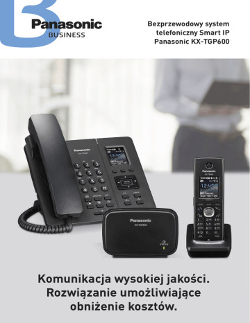 Bezprzewodowy system telefoniczny Smart IP Panasonic KX-TGP600 Komunikacja wysokiej jakości. Rozwiązanie umożliwiające obniżenie kosztów. KX-TGP600, system dla wielu branż Wszechstronny system KX-TGP600 stanowi idealne rozwiązanie komunikacyjne dla wielu różnych branż i sektorów. Oto tylko niektóre z możliwych zastosowań. Handel detaliczny •P onieważ większość pracowników w środowisku sprzedaży detalicznej pracuje poza biurem centralnym, idealnym rozwiązaniem są telefony bezprzewodowe powiązane ze stacją bazową na biurku kierownika. •N akładające się przypisania dzwonków pozwalają niezwłocznie odbierać połączenia przy jednoczesnym obsługiwaniu klientów przez wielu pracowników. •R óżnym działom można przypisać osobne numery, a połączenia z tymi numerami będą kierowane konkretne telefony. •N a głównym stanowisku informacji w sklepie można zainstalować bezprzewodowy telefon biurkowy TX-TPA65 jako aparat stacjonarny. Magazyn •P rzenośne telefony bezprzewodowe powiązane z bezprzewodowym telefonem biurkowym w z biurze centralnym zapewniają nieprzerwaną komunikację. •S ystem KX-TGP600 eliminuje konieczność ciągnięcia skomplikowanego okablowania po dużych powierzchniach magazynów. •Z asięg telefonów z technologią DECT można też rozszerzyć poza budynki, na przykład na stanowiska załadowcze, a nawet zwiększyć jeszcze bardziej poprzez dodanie regeneratora sygnału KX-A406. •D zięki wytrzymałej i pyłoszczelnej konstrukcji telefon KX-UDT131 nadaje się idealnie do pracy w trudnych warunkach na hali magazynowej. Małe biura •P ojedynczy system KX-TGP600 może obsłużyć wszystkie potrzeby komunikacyjne małych biur i osób pracujących w domu. •R óżnym funkcjom można przypisać oddzielne numery telefonów i dzwonki — można na przykład wydzielić linię tylko do obsługi sprzedaży. •P ołączenia przychodzące są kierowane do konkretnych aparatów telefonicznych przez usługę DDI. Restauracje •W restauracji mobilność ma kluczowe znaczenie, więc telefony bezprzewodowe z centralną stacją bazową stanowią idealne rozwiązanie. • Różnym telefonom w różnych działach można przypisać oddzielne numery i dzwonki. •W ytrzymała i pyłoszczelna konstrukcja telefonu KX-UDT131 pozwala bez trudu sprostać licznym wyzwaniom pracy w kuchni. Kompletne rozwiązanie komunikacji bezprzewodowej KX-TGP600 Gdy trzeba bezwzględnie zapewnić wysoką jakość przy jednoczesnym ograniczaniu kosztów, idealnym narzędziem do komunikacji biznesowej będzie nowy, bezprzewodowy system telefoniczny Smart IP KX-TGP600 firmy Panasonic. Jest to kompletne rozwiązanie mobilnej komunikacji, oferujące w bardzo przystępnej cenie łatwą instalację, elastyczność i niezawodność, z których słynie technologia SIP firmy Panasonic. Rozwiązanie łatwe do zarządzania W pełni rozszerzalne rozwiązanie System telefoniczny KX-TGP600 jest niezwykle łatwy do skonfigurowania i zarządzania. Funkcja udostępniania umożliwia zdalne określanie ustawień konfiguracji oraz zarządzanie telefonami. Użytkownicy mogą wybrać jedną z dwóch metod administrowania: zarządzanie lokalne z poziomu jednostki bazowej lub zarządzanie za pośrednictwem dostawcy usług. Użytkownicy mogą podłączyć do systemu nawet osiem bezprzewodowych telefonów przenośnych lub biurkowych obsługujących technologię DECT. Możliwość używania do ośmiu linii zewnętrznych równocześnie sprawia, że obsługa klienta przebiega sprawniej, a koszt i nakład pracy związany z instalowaniem oddzielnych linii wychodzących i zarządzaniem nimi jest całkowicie eliminowany. System umożliwia użytkownikom także posiadanie do ośmiu różnych numerów telefonu. Rozwiązanie wysokiej jakości Funkcja redukcji szumów eliminuje szum otoczenia i poprawia jakość połączenia za naciśnięciem przycisku. System telefoniczny KX-TGP600 automatycznie ustawia optymalny poziom głośności odbiornika, gdy użytkownik przemieszcza się między obszarami o różnym natężeniu dźwięku otoczenia. Rozwiązanie umożliwiające obniżenie kosztów Połączenie jakości, niezawodności, łatwości użycia i elastyczności pozwala znacznie obniżyć całkowity koszt użytkowania systemu telefonicznego KX-TGP600. Ponadto niski koszt początkowy sprawia, że system oferuje znacznie wyższy zwrot z inwestycji w okresie użytkowania technologii. Stylowe rozwiązanie specjalistyczne Dostępnych jest wiele telefonów zgodnych z systemem telefonicznym KX-TGP600. Należy do nich telefon bezprzewodowy DECT KX-TPA60 wyposażony w kolorowy wyświetlacz LCD o przekątnej 1,8 cala z podświetleniem. Telefon zapewnia wysoką jakość dźwięku w szerokopasmowej technologii HD (G.722) oraz posiada książkę telefoniczną o pojemności 500 numerów i pamięć 20 ostatnio wybieranych numerów. Dostępny jest również bezprzewodowy telefon biurkowy KX-TPA65, który ma ważną zaletę w porównaniu do „tradycyjnych” telefonów biurkowych: obsługa komunikacji DECT eliminuje konieczność stosowania dodatkowych kabli podczas instalowania systemu. System obejmuje stację bazową KX-TGP600 i jedna słuchawka KX-TPA60 (w tym ładowarki). Inne telefony podane są opcjonalne. Główne funkcje obsługiwanych bezprzewodowych telefonów przenośnych i biurkowych Wyświetlacz LCD KX-TPA60 KX-TPA65 KX-UDT121 KX-UDT131 Kolorowy o przekątnej 1,8 cala 65 K (128 x 160 pikseli) Kolorowy o przekątnej 1,8 cala 65 K (128 x 160 pikseli) Kolorowy o przekątnej 1,8 cala 65 K (128 x 160 pikseli) Kolorowy o przekątnej 1,8 cala 65 K (128 x 160 pikseli) 200 godzin 200 godzin 13 godzin 13 godzin Czas pracy akumulatora Czuwanie 200 godzin Rozmowa 11 godzin Czas ładowania akumulatora 6 godzin Nie dotyczy 3 godzin 3 godzin Książka telefoniczna ps 500 numerów 500 numerów 500 numerów 500 numerów System głośnomówiący Tryb pełnego dupleksu Tryb pełnego dupleksu Tryb pełnego dupleksu T