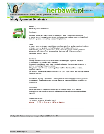 Utworzono : 03 marzec 2017 Odchudzanie,przemiana materii > Młody Jęczmień 60 tabletek Młody Jęczmień 60 tabletek Model : Młody Jęczmień 60 tabletek Producent : Preparat Młody Jęczmień to złożony suplement diety, zawierający połączenie wysokiej jakości wyciągów naturalnego pochodzenia z młodego jęczmienia, zielonej herbaty i gorzkiej pomarańczy oraz spirulinę i chrom. Skład wyciąg z jęczmienia, sub. wypełniająca: celuloza; spirulina, wyciąg z zielonej herbaty, wyciąg z owoców gorzkiej pomarańczy, sub. wypełniająca: sól sodowa karboksymetylocelulozy usieciowiona, sub. przeciwzbrylająca: sole magnezowe kwasów tłuszczowych, sub. wypełniająca: sorbitole, sub. przeciwzbrylająca: dwutlenek krzemu; chrom. Działanie Wyciąg z jęczmienia wykazuje właściwości wzmacniające organizm, wspiera zdrowie wątroby i pęcherzyka żółciowego. Uzyskanie prawidłowej masy ciała, metabolizm lipidów i kontrolę apetytu wspiera zielona herbata i gorzka pomarańcza. Utrzymanie prawidłowego poziomu glukozy we krwi ułatwia: zielona herbata, spirulina i chrom. Do ochrony antyoksydacyjnej organizmu przyczynia się spirulina, wyciąg z jęczmienia i zielonej herbaty. Dodatkowo, wyciągi z jęczmienia i zielonej herbaty wspomagają prawidłowy poziom cholesterolu, a spirulina ułatwia kontrolę wagi oraz korzystnie wpływa na witalność organizmu. Wskazania Młody Jęczmień to suplement diety przeznaczony dla kobiet, który stanowi specjalistyczne wsparcie w procesie odchudzania i dążenia do osiągnięcia pięknej sylwetki. Zalecane spożycie 1-2 tabletki, jeden raz dziennie.j porcji. Cena : 17,00 zł Brutto ( 15,74 zł Netto) Dostępność: Produkt dostępny w naszym sklepie od 29 kwiecień 2015 kontakt : - [email protected] Strona 1