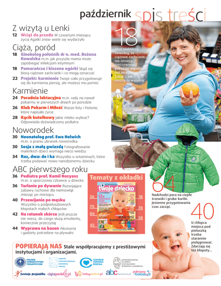 październik Z wizytą u Lenki spis treści 18 12 Wciąż do przodu W czwartym miesiącu życia Agatki znów wiele się wydarzyło Ciąża, poród 18 Ginekolog położnik dr n. med. Bożena Kowalska m.in. jak przyszła mama może zapobiegać infekcjom intymnym 18 Pomarańcze i kiszone ogórki Skąd się biorą ciążowe zachcianki i co mogą oznaczać 22 Projekt: karmienie Twoje ciało przygotowuje się do karmienia piersią, ale możesz mu pomóc Choć niektórzy twierdzą, że ciążowe zachcianki nie istnieją, rzeczywistość pokazuje zupełnie coś innego. Zobacz, jak można to wyjaśnić. Karmienie 24 Poradnia laktacyjna m.in. rady na nawał pokarmu w pierwszych dniach po porodzie 26 Klub Pokarm i Miłość Wasze listy i historie, które napisało życie 28 Kącik butelkowy Jakie mleko wybrać? Odpowiada doświadczony pediatra Noworodek 30 Neonatolog prof. Ewa Helwich m.in. o praniu ubranek noworodka 30 Sesja z małą gwiazdą Fotografowanie maleńkich dzieci wymaga nieco wiedzy 34 Raz, dwa: de i ka Wszystko o witaminach, które trzeba podawać nowo narodzonemu dziecku ABC pierwszego roku 36 Pediatra prof. Kamil Hozyasz m.in. o uporczywej czkawce u dziecka Tematy z okładki 36 Turlanie po dywanie Rozwijające zabawy ruchowe dla niemowląt miesiąc po miesiącu 36 18 Wszystko o podpieluszkowych kłopotach małych chłopców 70 78 42 Na ratunek skórze Jeśli jeszcze 86 40 Przewijanie po męsku nie wiesz, do czego służą emolienty, koniecznie przeczytaj 44 Wyprawa na basen Akcesoria 58 45 i gadżety potrzebne na pływalni POPIERAJĄ NAS Stale współpracujemy z prestiżowymi instytucjami i organizacjami. POLSKIE TOWARZYSTWO PEDIATRYCZNE CENTRUM ZDROWIA DZIECKA STOWARZYSZENIE NA RZECZ NATURALNEGO RODZENIA I KARMIENIA 64 Nadchodzi pora na ciepłe trzewiki i grube kurtki. Jesienne przygotowania czas zacząć. 40 U chłopca miejsca pod pieluszką trzeba starannie pielęgnować. Zdarzają się też kłopoty... W tym numerze znajdziecie rady naszych specjalistów: dr Aleksandra Jasielska, psycholog, tłumaczy, dlaczego ruch jest niezbędny, by niemowlę rozwijało się prawidłowo. Okazuje się, że możesz wiele zrobić, by mu pomóc – zabawy ruchowe będą przyjemne także dla mamy i taty. STR. 36 Dr n. med. Lidia Ruszkowska, pediatra dermatolog, wyjaśnia, czym są emolienty i dlaczego warto stosować je do pielęgnacji malutkiego dziecka. Takie preparaty są też bezpieczne dla wrażliwej skóry alergików. STR. 42 Dr inż. Anna Harton, dietetyk, wie, jak wiele wątpliwości ma młoda mama podczas podawania nowych produktów dziecku w pierwszym roku życia. Z jej pomocą porządkujemy wiedzę o żywieniu i rozszerzaniu diety niemowląt. STR. 47 Po 1. urodzinach 72 58 Alergolog prof. Mieczysława Czerwionka-Szaflarska m.in. o sterydach dla małego alergika 58 Poskromienie złośnika Jak poradzić sobie Jesienne infekcje także w tym roku z pewnością nas nie ominą. Podpowiadamy, jak sobie z nimi radzić. z dwuletnim buntownikiem 62 AZS = stres To choroba, które często wywołuje napięcia w całej rodzinie 64 Idzie jesień Czas na zmianę garderoby Zdrowy maluch 66 Pediatra onkolog prof. Maria Korzon m.in. o tym czy trzeba szczepić dziecko na gruźlicę 66 ABC brzuszka Alfabetyczny spis kłopotów 70 Niezłe ziółka Sprawdź swoją wiedzę o ich leczniczym działaniu 72 Sezon na chorowanie Odpowiedzi na najczęstsze pytania młodych rodziców 74 5 faktów o antybiotykach Trzeba się z nimi umiejętnie obchodzić, żeby nie zaszkodziły 76 Zakażenia pneumokokowe Sprawdź, czy są groźne i jak się przed nimi ustrzec Wychowanie bez porażek Dr n. med. Alicja Karney, pediatra, ostrzega, że nieprawidłowe podawanie dziecku antybiotyków może przynieść więcej szkody niż pożytku. Wylicza pięć ważnych spraw, o których nie wolno zapomnieć podczas leczenia. STR. 74 45EWKNUSMTERRZAE STR. LEKSYKON ŻYWIENIA DZIECKA NASI EKSPERCI WYJAŚNIAJĄ Co wprowadzić do diety niemowlaka w jedenastym miesiącu l Które produkty powinny codziennie gościć na talerzu dziecka l Jak odzwywczaić malucha do jedzenia papek i nauczyć go gryzienia l 78 Pedagog Agnieszka Galica m.in. o dobrym tempie rozwoju dziecka z ekspertem, jak bezpiecznie żyć ze zwierzętami 82 Między mamą a babcią Prof. Anna Brzezińska i dr Joanna Urbańska rozwiązują problemy rodziców Kraina wyobraźni 84 Menażeria rządzi! Lektury dla dzieci recenzują Michał Rusinek i Joanna Rusinek Jesteś mamą 86 Psycholog dr Julita Wojciechowska o tym, jak sobie radzić ze strachliwym dzieckiem 86 Zostań mistrzynią gospodarności Dowiedz się, jak skutecznie wziąć w garść domowy budżet 4 TWOJE DZIECKO 90 Pomaganie daje moc Magdalena Różczka, Amabasador Dobrej Woli UNICEF, opowiada o tym, dlaczego warto pomagać 92 Wózkowe nowinki Nowe patenty producentów Jak co miesiąc 8 PYTACIE – ODPOWIADAMY Rady ekspertów 10 WASZE LISTY I MEJLE Piszcie do nas 81, 95 PRODUCENCI POLECAJĄ Nowości rynkowe 94 WITAJ Zdjęcia waszych pociech 96 PRENUMERATA Złap okazję, wygraj nagrody! 97 KONKURS NA FELIETON Po prostu... 98 FELIETON AGATY PASSENT Niejadek FOT.: SHUTTERSTOCK, GETTY IMAGES/ FPM 78 Jak pies i kot z dzieckiem Rozmawiamy