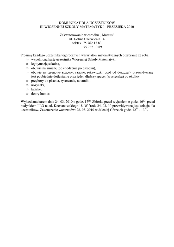 KOMUNIKAT DLA UCZESTNIKÓW III WIOSENNEJ SZKOŁY MATEMATYKI – PRZESIEKA 2010 Zakwaterowanie w ośrodku „ Marcus” ul. Dolina Czerwienia 14 tel/fax 75 762 15 83 75 762 10 89 Prosimy kaŜdego uczestnika tegorocznych warsztatów matematycznych o zabranie ze sobą: • wypełnioną kartę uczestnika Wiosennej Szkoły Matematyki, • legitymację szkolną, • obuwie na zmianę (do chodzenia po ośrodku), • obuwie na terenowe spacery, czapkę, rękawiczki, „coś od deszczu”- przewidywane jest poobiednie dotlenianie oraz jeden dłuŜszy spacer (wycieczka) po okolicy, • przybory do pisania, rysowania, notatniki, • noŜyczki, • latarkę, • dobry humor. Wyjazd autokarem dnia 24. 03. 2010 o godz. 1700. Zbiórka przed wyjazdem o godz. 1645 przed budynkiem I LO na ul. Kochanowskiego 18. W środę 24. 03. 10 przewidywana jest kolacja dla uczestników. Zakończenie warsztatów: 28. 03. 2010 w Jeleniej Górze ok godz. 1230 - 1300.