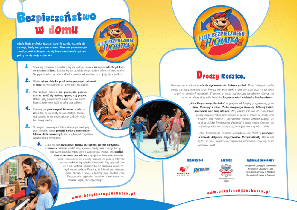 BezPie czeństw o w dOmu Kiedy Twoja pociecha dorasta i idzie do szkoły, zdarzają się sytuacje, kiedy zostaje sama w domu. Poznanie podstawowych zasad pozwoli jej bezpiecznie się bawić nawet wtedy, gdy nie patrzy na nią Twoje czujne oko. 1. 2. 3. 4. 5. Staraj się rozmawiać z dzieckiem, by pod żadnym pozorem nie wpuszczało obcych ludzi do mieszkania/domu. Zaznacz, by nie udzielało obcym osobom informacji przez telefon. Na pytanie, gdzie są rodzice, dziecko powinno odpowiadać, że znajdują się w pobliżu. Warto ostrzec dziecko przed niebezpiecznymi zabawami w domu, np. wychylaniem się przez okno, czy balkon. Pierwszy rok w szkole to wielkie wydarzenie dla Państwa pociech. Przed Waszymi dziećmi otwiera się nowy, nieznany świat. Poznają nie tylko literki i cyfry, ale także uczą się, jak sobie radzić w rozmaitych sytuacjach. Z pewnością muszą być bardziej samodzielne, dlatego ten okres jest dobrą okazją dla Rodziców, by porozmawiać z dziećmi o bezpieczeństwie. Pod żadnym pozorem nie powinieneś pozwolić dziecku bawić się ogniem, gazem, czy prądem. Dobrze, gdy porozmawiasz z nim na temat konsekwencji, jakie może nieść ze sobą taka zabawa. „Klub Bezpiecznego Puchatka” to program edukacyjny, przygotowany przez Biuro Prewencji i Biuro Ruchu Drogowego Komendy Głównej Policji, nauczycieli oraz firmę Maspex, który pomoże Państwa dzieciom poznać zasady bezpieczeństwa obowiązujące w domu, w drodze do szkoły oraz w szkole. Jako Rodzice i Opiekunowie możecie również włączyć się w akcję „Klubu Bezpiecznego Puchatka” i pomóc swoim dzieciom, jak najlepiej przeżyć ten ważny czas, jakim jest pierwszy rok w szkole. Postaraj się przechowywać lekarstwa z dala od dzieci tak, by nie miały do nich dostępu. Poinformuj dziecko, że nie może zażywać żadnych leków bez Twojej wiedzy. W miejscu widocznym i łatwo dostępnym (najlepiej przy telefonie) warto powiesić kartkę z numerami telefonów służb ratowniczych, aby w sytuacjach zagrożenia dziecko mogło zareagować. 6. Staraj się nie pozostawiać dziecka bez kontroli podczas korzystania z Internetu. Możecie ustalić ramy czasowe, kiedy może z niego korzystać, razem poszukać stron, które je zainteresują. Dobrze, jeśli uczulisz dziecko na niebezpieczeństwa czyhające w Internecie, ostrzeżesz przed umawianiem się z osobą poznaną za pomocą Internetu (możesz wskazać, by dziecko informowało Cię, gdy ktoś chce się z nim spotkać), nauczysz, by nie podawało swoich danych obcym osobom. Pamiętaj, że Internet jest miejscem, gdzie dziecko ciekawie i twórczo może spędzać czas. Pozytywnych aspektów kontaktu z Internetem jest znacznie więcej, niż negatywnych. bezpie www. Drodzy Rodzice, cznypuchatek.pl „Klub Bezpiecznego Puchatka” przygotował dla Państwa praktyczne wskazówki dotyczące bezpieczeństwa Pierwszoklasisty. Dzięki nim będzie on umiał rozpoznawać zagrożenia, bezpiecznie uczyć się, bawić i poznawać świat. ORGANIZATOR PARTNER K G P PATRONAT HONOROWY Kuratorium Oświaty w Białymstoku Kuratorium Oświaty w Łodzi Kuratorium Oświaty w Krakowie Kuratorium Oświaty w Poznaniu Komenda Główna Policji www.be zpiecznypuchatek.pl BezPie czeństw o BezPie czeństw o w drOdZ e do S Zko ły Twoje dziecko codziennie porusza się po drodze. Idzie do szkoły lub na spotkania z przyjaciółmi. Nie zawsze możesz mu towarzyszyć. Aby unikało zagrożeń dobrze nauczyć je najważniejszych zasad bezpieczeństwa. 1. 2. 3. 4. Należy przestrzec dziecko, by pod żadnym pozorem nie korzystało z propozycji nieznanych osób, które oferują podwiezienie, poczęstunek itp. Możesz wytyczyć dziecku stałą i bezpieczną trasę do szkoły, z której nie powinno zbaczać. Powiedz mu, że poruszając się po drodze z przyjaciółmi jako grupa, powinni iść „gęsiego”. Warto zapoznać dziecko z zasadami ruchu drogowego: poruszania się chodnikiem lub lewą stroną drogi, przechodzenia na pasach tylko na zielonym świetle itp. Staraj się, aby Twoje dziecko było zawsze dobrze widoczne. Zaopatrz je w elementy odblaskowe na wierzchnim ubraniu (z przodu i z tyłu) tak, aby odbijały światła reflektorów nadjeżdżających pojazdów. 5. Pamiętaj, że dziecko w wieku do 7 lat może poruszać się po drodze tylko pod opieką osoby, która osiągnęła wiek co najmniej 10 lat. 6. 7. 8. 9. 10. 11. 12. www.b w SZ ko le Szkoła jest miejscem przyjaznym dziecku i służy jego rozwojowi. Warto jednak zwrócić uwagę dziecka na pewne kwestie, by zawsze wracało z niej radosne i uśmiechnięte. Jeśli Twoje dziecko dojeżdża do szkoły autobusem, naucz je, aby nie wchodziło na jezdnię zza pojazdu. Niech poczeka z przechodzeniem przez jezdnię aż autobus odjedzie. 1. Gdy dowozisz swoje dziecko do szkoły samochodem, zadbaj, by wysiadało w bezpiecznym miejscu. 2. Wspólne wycieczki rowerowe mogą być okazją do przekazania dziecku informacji na temat zasad jazdy na rowerze. Rodzic zawsze jest przykładem. Dobrze, gdy uświadomisz dziecku jak niebezpieczne jest bawienie się z napotkanymi przypadkowo zwierzętami, czy nieznanymi przedmiotami. Dzieci nie powinny nosić kluczy do mieszkania/domu na szyi. Staraj się upewniać, w jaki sposób dziecko je przechowuje. Staraj się uświadamiać dziecko, aby nigdy nie wahało się głośno wzywać pomocy w sytuacji zagrożenia. Dziecko warto wyposażyć w numery telefonów do służb ratowniczych. Powinno wiedzieć, w jakich sytuacjach wzywa się daną służbę. Warto, by znało także numer telefonu rodziców. ezpiecznypuchatek.pl 3. Postaraj się nauczyć dziecko zasad bezpiecznej zabawy. Warto wskazać zabawy, które niosą ze sobą zagrożenie: skakanie po murkach, bieganie po schodach, zjeżdżanie po poręczach, itp. Niech Twoje dziecko będzie świadome, że podczas zabawy musi uważać na inne dzieci. Poprzez nieuważne zachowania może zrobić krzywdę swoim koleżankom i kolegom. Dobrze, jeśli porozmawiasz z dzi