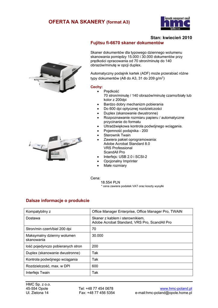 OFERTA NA SKANERY (format A3) Stan: kwiecień 2010 Fujitsu fi-6670 skaner dokumentów Skaner dokumentów dla typowego dziennego wolumenu skanowania pomiędzy 15.000 i 30.000 dokumentów przy prędkości opracowania od 70 stron/minutę do 140 obrazów/minutę w opcji duplex. Automatyczny podajnik kartek (ADF) może przerabiać różne typy dokumentów (A8 do A3, 31 do 209 g/m²) Cechy: • Prędkość 70 stron/minutę / 140 obrazów/minutę czarno/biały lub kolor z 200dpi • Bardzo dobry mechanizm pobierania • Do 600 dpi optycznej rozdzielczości • Duplex (skanowanie dwustronne) • Rozpoznawanie rozmiaru papieru / automatyczne przycinanie do formatu • Ultradźwiękowa kontrola podwójnego wciągania. • Pojemność podajnika - 200 • Sterownik Twain • Zawiera pakiet oprogramowania: Adobe Acrobat Standard 8.0 VRS Professional ScandAll Pro • Interfejs: USB 2.0 i SCSI-2 • Opcjonalny Imprinter • Małe rozmiary Cena: 18.554 PLN * cena zawiera podatek VAT oraz koszty wysyłki Dalsze informacje o produkcie Kompatybilny z Office Manager Enterprise, Office Manager Pro, TWAIN Dostawa Skaner z kablem i sterownikiem, Adobe Acrobat Standard, VRS Pro, ScandAll Pro Stron/min czerń/biel 200 dpi 70 Maksymalny dzienny wolumen skanowania 30.000 lość pojedynczo pobieranych stron 200 Duplex (skanowanie dwustronne) Tak Kontrola podwójnego wciągania Tak Rozdzielczość, max. w DPI 600 Interfejs Twain Tak HMC Sp. z o.o. 45-554 Opole Ul. Zielona 14 Tel: +48 77 454 0678 Fax: +48 77 456 5354 www.hmc-poland.pl e-mail:[email protected] OFERTA NA SKANERY (format A3) Fujitsu fi-6770 skaner dokumentów Skaner dokumentów dla typowego dziennego wolumenu skanowania pomiędzy 15.000 i 45.000 dokumentów przy prędkości opracowania od 70 stron/minutę do 140 obrazów/minutę w opcji duplex. Automatyczny podajnik kartek (ADF) może przetwarzać różne typy dokumentów (A8 do A3, 31 do 209 g/m²) Cechy: • Prędkość 70 stron/minutę / 140 obrazów/minutę czarno/biały lub kolor z 200dpi • Bardzo dobry mechanizm pobierania • Do 600 dpi optycznej rozdzielczości • Duplex (skanowanie dwustronne) • Rozpoznawanie rozmiaru papieru / automatyczne przycinanie do formatu • Ultradźwiękowa kontrola podwójnego wciągania. • Pojemność podajnika - 200 • Sterownik Twain • Zawiera pakiet oprogramowania: Adobe Acrobat Standard, VRS 4 Professional, ScanAll 21 Capture Software • Interfejs: USB 2.0 i SCSI • Opcjonalny Imprinter Cena: 30.988 PLN * cena zawiera podatek VAT oraz koszty wysyłki Dalsze informacje o produkcie Kompatybilny z Office Manager Enterprise, Office Manager Pro, TWAIN Dostawa Skaner z kablem i sterownikiem, ADF i Flatbed (płaski), Adobe Acrobat Standard, VRS Pro, ScandAll Capture Software Stron/min czerń/biel 200 dpi 70 Maksymalny dzienny wolumen skanowania 45.000 lość pojedynczo pobieranych stron 200 Duplex (skanowanie dwustronne) Tak Kontrola podwójnego wciągania Tak Rozdzielczość, max. w DPI 600 Interfejs Twain Tak HMC Sp. z o.o. 45-554 Opole Ul. Zielona 14 Tel: +48 77 454 0678 Fax: +48 77 456 5354 www.hmc-poland.pl e-mail:[email protected] OFERTA NA SKANERY (format A3) Fujitsu fi-5530C2 skaner dokumentów Skaner dokumentów dla typowego dziennego wolumenu skanowania do 4.000 dokumentów przy prędkości opracowania od 50 stron/minutę do 100 obrazów/minutę w opcji duplex. Automatyczny podajnik kartek (ADF) może przetwarzać różne typy dokumentów (od A8 do A3). Cechy: • Prędkość 50 stron/minutę / 100 obrazów/minutę czarno/biały lub kolor z 200dpi • Bardzo dobry mechanizm pobierania • Do 600 dpi optycznej rozdzielczości • Duplex (skanowanie dwustronne) • Rozpoznawanie rozmiaru papieru / automatyczne przycinanie do formatu • Ultradźwiękowa kontrola podwójnego wciągania • Pojemność podajnika - 100 • Sterownik Twain • Zawiera pakiet oprogramowania: Adobe Acrobat Standard, ScandAll Pro, VRS Basic • Interfejs: USB 2.0 i SCSI-2 • Opcjonalny Imprinter Cena: 11.773 PLN * cena zawiera podatek VAT oraz koszty wysyłki Dalsze informacje o produkcie Kompatybilny z Office Manager Enterprise, Office Manager Pro, TWAIN Dostawa Skaner z kablem i sterownikiem, ADF i Flatbed (płaski), Adobe Acrobat Standard, VRS Basic Stron/min czerń/biel 200 dpi 50 Maksymalny dzienny wolumen skanowania 4.000 lość pojedynczo pobieranych stron 100 Duplex (skanowanie dwustronne) Tak Kontrola podwójnego wciągania Tak Rozdzielczość, max. w DPI 600 Interfejs Twain Tak HMC Sp. z o.o. 45-554 Opole Ul. Zielona 14 Tel: +48 77 454 0678 Fax: +48 77 456 5354 www.hmc-poland.pl e-mail:[email protected]