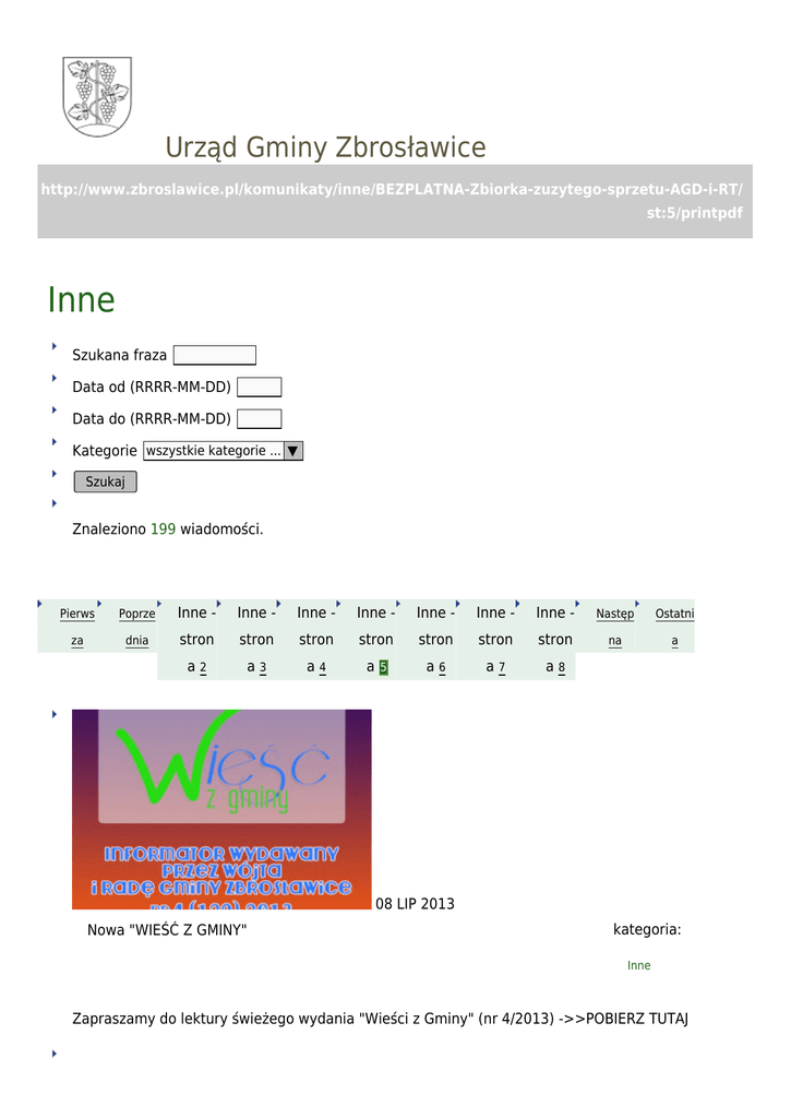 Urząd Gminy Zbrosławice http://www.zbroslawice.pl/komunikaty/inne/BEZPLATNA-Zbiorka-zuzytego-sprzetu-AGD-i-RT/ st:5/printpdf Inne Szukana fraza Data od (RRRR-MM-DD) Data do (RRRR-MM-DD) Kategorie wszystkie kategorie ... ▼ Szukaj Znaleziono 199 wiadomości. Pierws Poprze Inne - Inne - Inne - Inne - Inne - Inne - Inne - Następ Ostatni za dnia stron stron stron stron stron stron stron na a a2 a3 a4 a6 a7 a8 a 5 08 LIP 2013 Nowa "WIEŚĆ Z GMINY" kategoria: Inne Zapraszamy do lektury świeżego wydania "Wieści z Gminy" (nr 4/2013) ->>POBIERZ TUTAJ 04 LIP 2013 Jadwigafest 2013 03 LIP 2013 kategoria: Otwarcie sali gimnastycznej w Kopienicy Inne Wójt Gminy Zbrosławice zaprasza wszystkich sołtysów na spotkanie w sprawie gospodarki odpadami. Odbędzie się ono we wtorek, 2 lipca br., o godz. 15:30 w Centrum Usług Publicznych w Zbrosławicach 01 LIP 2013 Panczkraut i karminadle, czyli "Tarnogórski od kuchni" kategoria: Inne W ramach realizowanego przez Starostwo Powiatowe w Tarnowskich Górach projektu „Tarnogórski od kuchni" powstał kolejny, trzeci już, materiał filmowy. Tym razem zobaczyć można jak przygotować karminadle z panczkrautem. Przepis przedstawia Koło Gospodyń Wiejskich "Wesołe Kumoszki" ze Świętoszowic. „Tarnogórski od kuchni" to tytuł cyklu filmików promujących kuchnię regionalną. Potrawy przygotowywać będą między innymi 26 CZE 2013 GOPS w Zbrosławicach oraz Rada Sołecka Ptakowice zapraszają na piknik 25 CZE 2013 kategoria: Powiatowy Lekarz Weterynarii informuje Inne Powiatowy Lekarz w Tarnowskich Górach informuje, iż na terytorium Białorusi w rejonie wiejskim obwód grodzieński wykryto ognisko afrykańskiego pomoru świń.Śląski Wojewódzki Lekarz Weterynarii przypomina o surowych procedurach dotyczących wprowadzenia niektórych produktów pochodzenia zwierzęcego do UE.Szczegóły w załączonej ulotce ->>> TUTAJ <<<- 24 CZE 2013 Industriada w Karchowicach kategoria: Inne INDUSTRIADA w Karchowickich Wodociągach już po raz czwarty8 czerwca o godz. 10.00 wystrzałem z armaty powitani zostali pierwsi goście. W Zabytkowej Stacji Wodociągowej „Zawada" swoją premierę miała instalacja H20 prezentująca trzy stany skupienia wody, która na stałe wzbogaci tutejszą ekspozycję. Mnóstwo osób przyjechało pochodzić po chmurze, zajrzeć do kostki lodu albo zanurzyć się w wodnych dźwiękach.W ten piękny, 24 CZE 2013 kategoria: Industriada w Karchowicach Inne 8 czerwca o godz. 10.00 wystrzałem z armaty powitani zostali pierwsi goście. W Zabytkowej Stacji Wodociągowej „Zawada" swoją premierę miała instalacja H20 prezentująca trzy stany skupienia wody, która na stałe wzbogaci tutejszą ekspozycję. Mnóstwo osób przyjechało pochodzić po chmurze, zajrzeć do kostki lodu albo zanurzyć się w wodnych dźwiękach.W ten piękny, słoneczny dzień można było napić się wyśmienitej, zimnej 24 CZE 2013 Zespół Śląsk zaprasza 20 CZE 2013 kategoria: MZKP informuje Inne Informujemy, że 16 sierpnia 2013r (piątek po Święcie Wniebowzięcia NMP) autobusy linii obsługiwanych na zlecenie MZKP Tarnowskie Góry oraz KZK GOP Katowice kursować będą według rozkładów obowiązujących w soboty (do obsługi linii nr 129 PKM Świerklaniec skieruje w tym dniu autobusy przegubowe). Odstępstwem od tej reguły będą linie nr 80, 135, 288, 735 i 738 , dla których obowiązywać będą rozkłady jazdy obowiązujące w Pierws Poprze Inne - Inne - Inne - Inne - Inne - Inne - Inne - Następ Ostatni za dnia stron stron stron stron stron stron stron na a a2 a3 a4 a6 a7 a8 a 5