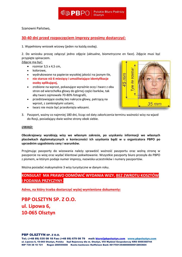 Szanowni Państwo, 30-40 dni przed rozpoczęciem imprezy prosimy dostarczyć: 1. Wypełniony wniosek wizowy (jeden na każdą osobę). 2. Do wniosku proszę załączyć jedno zdjęcie (aktualne, biometryczne en face). Zdjęcie musi być przypięte spinaczem. Zdjęcie ma być: rozmiar 3,5 x 4,5 cm, kolorowe, wydrukowane na papierze wysokiej jakości na jasnym tle, nie starsze niż 6 miesięcy i umożliwiające identyfikacje osoby aplikującej, zrobione na wprost, pokazujące wyraźnie oczy i twarz z obu stron od wierzchołka głowy do górnej części barków, tak aby twarz zajmowała 70-80% fotografii, przedstawiające osobę bez nakrycia głowy, patrzącą na wprost, z zamkniętymi ustami, twarz nie może być przesłonięta włosami. 3. Paszport, ważny co najmniej 180 dni, licząc od daty zakończenia terminu ważności wizy na wjazd do Rosji, posiadający dwie wolne strony obok siebie. UWAGI: Obcokrajowcy wyrabiają wizy we własnym zakresie, po uzyskaniu informacji we własnych placówkach dyplomatycznych o konieczności ich uzyskania bądź w u organizatora PBPO po uprzednim uzgodnieniu ceny i warunków. Przyjmując paszporty do wizowania należy sprawdzić ważność paszportu oraz wolną stronę w paszporcie na wizę oraz wydać klientowi pokwitowanie. Wszystkie paszporty biuro przesyła do PBPO z pismem, w którym podaje numer imprezy, nazwiska uczestników i numery paszportów. Można posiadać maksymalnie 3 wizy turystyczne w danym roku. KONSULAT MA PRAWO ODMÓWIĆ WYDANIA WIZY, BEZ ZWROTU KOSZTÓW I PODANIA PRZYCZYNY. Adres, na który trzeba dostarczyć wyżej wymienione dokumenty: PBP OLSZTYN SP. Z O.O. ul. Lipowa 6, 10-065 Olsztyn PBP OLSZTYN SP. Z O.O. Tel.: (+48 89) 535 08 18 Fax: (+48 89) 679 08 79 mail: [email protected] www.pbpolsztyn.com ul. Lipowa 6, 10-065 Olsztyn, Polska Sąd Rejonowy dla m. Olsztyn, VIII Wydział Gospodarczy KRS 0000368744 NIP 739 38 10 721 Regon 280555608 Konto bankowe: Raiffeisen Bank 46175013540000000012893604 Zasady wypełnienia formularza PBPO przyjmuje wyłącznie elektronicznie wypełnione wnioski wizowe dostępne na stronie Departamentu Konsularnego MSZ Rosji: http://visa.kdmid.ru STRONA I Na tej stronie można wypełnić i wydrukować formularz wizowy w celu uzyskania wizy do Federacji Rosyjskiej. Należy wskazać kraj siedziby placówki dyplomatycznej, urzędu konsularnego, w którym otrzyma Pan/i wizę: POLAND [۷] rozwijana lista Wskazać język, w którym wyświetlać się będą podpowiedzi do wypełnienia formularza POLISH [۷] rozwijana lista Czytamy zamieszczoną niżej informację oraz zaznaczamy [۷] w polu, że się zapoznaliśmy z tą informacją. Następnie wybieramy: Zaznaczyć tę opcję w celu wypełnienia nowego wniosku WYPEŁNIJ NOWY WNIOSEK Wybrać tę opcję w celu wypełnienia wniosku, edycji uprzednio wypełnionego formularza, przeglądu i wydruku wcześniej wypełnionego formularza, utworzenia nowego wniosku na bazie poprzednio wprowadzonych danych OTWÓRZ UPRZEDNIO WYPEŁNIONY FORMULARZ WNIOSKU STRONA II Na tej stronie zostaje nadany numer wypełnianego wniosku wizowego. Wypełniając wniosek wizowy należy pisać DUŻYMI LITERAMI (przy użyciu CAPS LOCK). Nie używamy polskich znaków. Wprowadź hasło PBPO2014 Wprowadź potwierdzenie hasła PBPO2014 Wprowadzić napis z obrazka i kliknąć przycisk „Wyślij”. Jeśli znaki są nieczytelne, ponownie załadować stronę. STRONA III Numer identyfikacyjny Pana/i wniosku …………. Proszę zapisać i zachować numer Pana/i w pewnym i bezpiecznym miejscu. Należy wydrukować numer wniosku, a następnie kontynuować wypełnianie wniosku. WYDRUK WNIOSKU KONTYNUUJ PBP OLSZTYN SP. Z O.O. Tel.: (+48 89) 535 08 18 Fax: (+48 89) 679 08 79 mail: [email protected] www.pbpolsztyn.com ul. Lipowa 6, 10-065 Olsztyn, Polska Sąd Rejonowy dla m. Olsztyn, VIII Wydział Gospodarczy KRS 0000368744 NIP 739 38 10 721 Regon 280555608 Konto bankowe: Raiffeisen Bank 46175013540000000012893604 STRONA IV ZAKŁADKA INFORMACJE DOTYCZĄCE WNIOSKOWANEJ WIZY (do wypełnienia tej części wniosku będziemy potrzebować paszportu). Wybieramy kolejno: obywatelstwo (nationality) POLAND [۷] rozwijana lista zaznaczamy czy mieliśmy wcześniej obywatelstwo ZSRR lub Rosji NO [۷] rozwijana lista wybieramy cel podróży (purpose of visit section) TOURISM [۷] rozwijana lista wybieramy cel podróży (purpose of visit) TOURISM [۷] rozwijana lista automatycznie aplikacja wybiera nam wariant wizy zwykłej turystycznej COMMON TOURIST [۷] rozwijana lista wybieramy liczbę wjazdów SINGLE [۷] rozwijana lista data wjazdu do Rosji Należy podać dokładną datę (z programu wycieczki) data wyjazdu z Rosji Ostatni dzień wycieczki Wybrać przycisk KONTYNUJ STRONA V ZAKŁADKA DANE OSOBOWE Wpisujemy nazwisko z paszportu oraz imię (imiona) Have you ever had other names? Panie, które zawarły związek małżeński proszone są o kliknięcie YES/NO [۷] rozwijana lista w polu, które się ukaże poniżej należy wpisać nazwisko panieńskie. Wypełniamy pola: płeć, data urodzenia, miejsce urodzenia Jeśli Pani urodził/a się w Rosji, wpisać „yes” i podać kiedy i do jakiego kraju Pan/i wyemigrował/a Jeśli nie, wybrać z listy opadającej YES/NO [۷] rozwijana lista Aby zapisać dane, które uzupełniliśmy do tej pory wpisaliśmy klikamy >ZACHOWAJ KOPIĘ ROBOCZĄ, a następnie wybieramy >KONTYNUUJ. PBP OLSZTYN SP. Z O.O. Tel.: (+48 89) 535 08 18 Fax: (+48 89) 679 08 79 mail: [email protected] www.pbpolsztyn.com ul. Lipowa 6, 10-065 Olsztyn, Polska Sąd Rejonowy dla m. Olsztyn, VIII Wydział Gospodarczy KRS 0000368744 NIP 739 38 10 721 Regon 280555608 Konto bankowe: Raiffeisen Bank 46175013540000000012893604 STRONA VI ZAKŁADKA DANE PASZORTOWE numer paszportu (wpisujemy bez spacji, np. AA1234567), data wydania, data upływu ważności (wg dat w paszporcie) Aby zapisać dane, które uzupełniliśmy do tej pory wpisaliśmy klikamy >ZACHOWAJ KOPIĘ ROBOCZĄ, a następnie wybieramy >KONTYNUUJ. STRONA VII Z