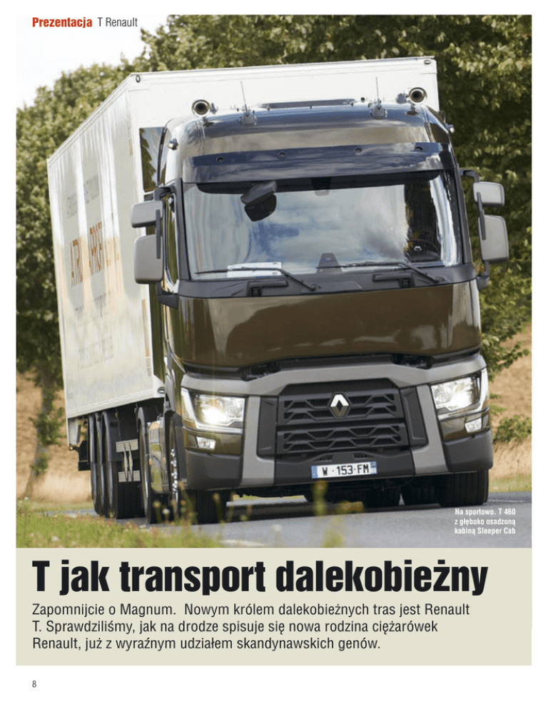 Prezentacja T Renault Na sportowo. T 460 z głęboko osadzoną kabiną Sleeper Cab T jak transport dalekobieżny Zapomnijcie o Magnum. Nowym królem dalekobieżnych tras jest Renault T. Sprawdziliśmy, jak na drodze spisuje się nowa rodzina ciężarówek Renault, już z wyraźnym udziałem skandynawskich genów. N owe ciężarówki Renault są produkowane w Bourg-en-Bresse. Podczas Long Haul Days producent podstawił najbogatsze wersje flagowej serii T. Punktem startowym była fabryka kabin w Blainville-sur-Orne w Normandii. Jazdy odbywały się na wymagającym odcinku wiodącym ku wybrzeżu Atlantyku. Szpaler ponad 20 pojazdów testowych serii T o zawadiackim obliczu był imponujący. Poprzez ten bardzo agresywny wyraz „twarzy” Renault Trucks dokonało wyraźnego odcięcia od poprzedników – Magnum i Premium Route. Poprzez ten zabieg zadbano również o jasne rozgraniczenie między całą konkurencją, a przede wszystkim Volvo Trucks. Volvo Trucks i Renault Trucks jako marka są już pod jednym sztandarem Volvo Group. Nawet jeśli cele na pozór są zbieżne, to jednak konkurencja między rodzeństwem jest często wyjątkowo ostra, wręcz na pograniczu kanibalizmu. Zatem nie bez kozery, w tej sytuacji, jest strategia dwóch marek, także w odniesieniu do silników Euro 6. Mocne typy Ciągniki z serii T Renault Trucks wyglądają trochę jak „źli chłopcy”. Wyraźny i oryginalny design z grillem w formie trapezu, zdecydowanie podkreślony przez światła, wymaga czasu i opatrzenia. Nowa „twarz” serii T zdecydowanie wyraża siłę i pewność siebie. Wyraźnie męski typ. W pierwszej rundzie jazd testowych Renault Trucks wskazało na flagowy pojazd T 520 z kabiną Top „High Sleeper Cab”. Duża kabina z płaską podłogą wzmacnia wrażenie zuchwałości, ale daje także poczucie elegancji. Prosta obsługa – to jedna z pozytywnych cech nowego Renault Podczas Long Haul Days flagowy następca Magnum, T 520, był dostępny z kabiną Top o wysokości wnętrza 2,10 m. Pod płaską podłogą kabiny zamontowany był silnik DTI 13 o pojemności 12,8 l. Sześciocylindrowy rzędowy Diesel z wysokociśnieniowym wtryskiem bezpośrednim osiąga moc 520 KM, w zakresie od 1450 do 1900 obr./min i maksymalny moment obrotowy 2550 Nm, który jest dostępny w zakresie od 1050 do 1400 obr./min. Dzięki temu T 520 nawet, gdy pracuje jako koń pociągowy zestawu o masie 40 t, przyspiesza z łatwością od 0 do prędkości 80 km/h. Wysoka pozycja w kabinie Top budzi wręcz królewskie odczucia. A płaska podłoga przy wysokości 2,10 m daje komfort, tak niezbędny przy pokonywaniu międzynarodowych tras. Do tego dochodzi niski poziom hałasu w kabinie i bardzo komfortowe podwozie. T 460 z „Sleeper Cab” jest pomyślany raczej jako następca Premium Route. Kabina jest osadzona niżej, o około 20 cm, czyli wysokość tunelu silnika. Ten model z kolei ma sportowy wygląd. W transporcie dalekobieżnym oferuje także wysoki poziom komfortu. W T 460 pracuje silnik o pojemności 10,8 l Common-Rail DTI 11. 6-cylindrowy silnik rzędowy ma moc 460 KM przy 1800 obr./min i posiada maksymalny moment obrotowy 2200 Nm w zakresie od 950 do 1400 obr./min. Silnik imponuje dużą elastycznością i ma mocny dół, co czuć gdy wskazówka ledwie przekroczy barierę obrotów biegu jałowego. Przy jeździe po płaskim terenie DTI 11 w T 460 oraz DTI 13 w T 520 pracują bez najmniejszej zadyszki. Nieco niższa pozycja siedzenia w Sleeper Cab, w porównaniu z High Sleeper Cab, pozwala kierowcy T 460 być bliżej asfaltu. A to przekłada się na większe czucie drogi. O ile da to się ocenić podczas krótkiego choć całkiem wymagającego odcinka testowego (jeździliśmy po wąskich drogach, włącznie Komfortowa kabina dla długodystansowców Prezentacja T Renault z ciasnymi przejazdami przez normandzkie miejscowości), to można stwierdzić, że Renault Trucks udało się po mistrzowsku dostroić układ jezdny, co umożliwia harmonijną i płynną jazdę. Dotyczy to zarówno T 520, jak i T 460. tegię przełączania biegów, w celu dalszej redukcji zużycia paliwa. Za zachowanie podczas kierowania modelom T należy się szczególna pochwała: kierowanie okazuje się proste i dokładne. Perfekcyjne kierowanie Renault Trucks poprzez modele T pracuje także na dobrą opinię wśród kierowców. Na nowo zaprojektowano miejsce pracy kierowcy, które przekonuje ergonomią i prostotą obsługi dzięki intuicyjnemu i przejrzystemu układowi oprzyrządowania z 7-calowym wyświetlaczem na czele. Dzięki tym rozwiązaniom kierowca ma wszystko w zasięgu wzroku. Nowe fotele, zaprojektowane przez Recaro specjalnie dla Renault Trucks, z trzypunktowymi, czerwonymi pasami bezpieczeństwa, ergonomiczna deska rozdzielcza z 7-calowym wyświetlaczem głównym (największym na rynku) i zmieniony układ przełączników umożliwiają przyjęcie optymalnej pozycji za kierownicą. Pojazdy T są również wyposażone w schowek dostępny zarówno z zewnątrz, jak i wnętrza kabiny, do której prowadzą drzwi o kącie otwarcia 85°. Kierowcy mają do dyspozycji szereg elementów zwiększających bezpieczeństwo takich jak np. reflektory doświetlające zakręt i wielofunkcyjne koło kierownicy, regulowane w trzech płaszczyznach. Wyjątkowa jest obsługa funkcji tempomatu na kierownicy multifunkcjonalnej, do czego używane są także przyciski na dolnej stronie kierownicy. Wymaga to na początku przyzwyczajenia, funkcjonuje jednak bardzo Dziennikarzom przypadła do gustu także prosta obsługa Przykładem jest automatyczny system hamulca ręcznego. Przy wyłączeniu zapłonu hamulec postojowy aktywuje się automatycznie. A po starcie silnika kierowca musi tylko aktywować skrzynię i wcisnąć pedał gazu. Przy ruszaniu automatyczny system hamulca ręcznego zwolni koła i już można ruszać w trasę. Jest to proste, a kierowca szybko może się do tego przyzwyczaić. Już po ruszeniu w oczy rzucają się kolejne praktyczne rozwiązani