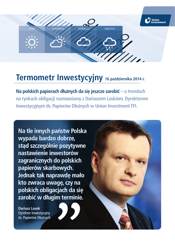 Termometr Inwestycyjny 16 października 2014 r. Na polskich papierach dłużnych da się jeszcze zarobić – o trendach na rynkach obligacji rozmawiamy z Dariuszem Laskiem, Dyrektorem Inwestycyjnym ds. Papierów Dłużnych w Union Investment TFI. Na tle innych państw Polska wypada bardzo dobrze, stąd szczególnie pozytywne nastawienie inwestorów zagranicznych do polskich papierów skarbowych. Jednak tak naprawdę mało kto zwraca uwagę, czy na polskich obligacjach da się zarobić w długim terminie. Dariusz Lasek Dyrektor Inwestycyjny ds. Papierów Dłużnych Analitycy mówią o powrocie hossy na rynek obligacji. Widać to także po wynikach funduszy. Czy to oznacza, że na obligacjach można zarabiać? Jeszcze do niedawna wydawało się, że znajdujemy się już na końcu obligacyjnej hossy. Ostatnia decyzja Rady Polityki Pieniężnej o obniżce stóp procentowych pobudziła jednak oczekiwania rynku i ceny polskich papierów dłużnych znów rosną. Nie nazwałbym jednak tego trendu klasyczną hossą, jako że rentowności oderwały się już od fundamentów. Niemniej chwilowo pojawiła się okazja, żeby na obligacjach zarobić. Jak długo potrwa ta okazja? Rajd wzrostowy na rynku obligacji może potrwać nawet do końca roku, bo oczekiwania rynku są spore. Nawet jeśli RPP nie będzie już kontynuowała obniżek stóp procentowych, i tak pojawią się spekulacje, że cięcia nastąpią. Również wyprzedaż polskich papierów przez zagranicznych inwestorów jak dotąd raczej nam nie grozi, jako że sentyment do naszego rynku jest bardzo dobry. W krótkim terminie możemy się więc spodziewać całkiem niezłej koniunktury na polskim rynku długu. Czy tymczasowe pozytywne nastawienie dotyczy również obligacji zagranicznych? Sytuacja na rynku obligacji europejskich kształtowana jest przez politykę Europejskiego Banku Centralnego, a ta jest bardzo łagodna. Czeka nas dwuletni okres niskich stóp procentowych, dlatego właściwie wszystkie obligacje w Europie dają dzisiaj zarobić, nawet węgierskie i tureckie. Na tle innych państw Polska wypada bardzo dobrze, stąd szczególnie pozytywne nastawienie inwestorów zagranicznych do polskich papierów skarbowych. Jednak tak naprawdę mało kto zwraca uwagę, czy na polskich obligacjach da się zarobić w długim terminie. Czy zatem warto jeszcze lokować swoje środki w polskich papierach? Dopóki pociąg jedzie, dopóty da się zarabiać. Warto zatem wykorzystać trwający trend, mając z tyłu głowy, że trzeba zachować wzmożoną ostrożność. Masz pytania? ☎ 800 567 662 (22) 449 03 33 (od poniedziałku do piątku, od 8.00 do 18.00) [email protected] @ www.doradcy.unionklub.pl