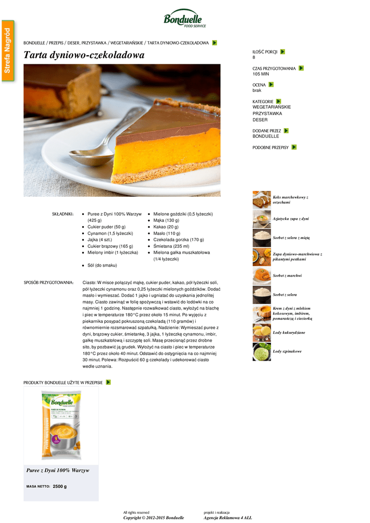 BONDUELLE / PRZEPIS / DESER, PRZYSTAWKA / WEGETARIAŃSKIE / TARTA DYNIOWO-CZEKOLADOWA Tarta dyniowo-czekoladowa ILOŚĆ PORCJI 8 CZAS PRZYGOTOWANIA 105 MIN OCENA brak KATEGORIE WEGETARIAŃSKIE PRZYSTAWKA DESER DODANE PRZEZ BONDUELLE PODOBNE PRZEPISY Keks marchewkowy z orzechami SKŁADNIKI: Puree z Dyni 100% Warzyw (425 g) Cukier puder (50 g) Cynamon (1,5 łyżeczki) Jajka (4 szt.) Cukier brązowy (165 g) Mielony imbir (1 łyżeczka) Mielone goździki (0,5 łyżeczki) Mąka (130 g) Kakao (20 g) Masło (110 g) Czekolada gorzka (170 g) Śmietana (235 ml) Mielona gałka muszkatołowa (1/4 łyżeczki) Azjatycka zupa z dyni Sorbet z selera z miętą Zupa dyniowo-marchwiowa z pikantymi pestkami Sól (do smaku) Sorbet z marchwi SPOSÓB PRZYGOTOWANIA: Ciasto: W misce połączyć mąkę, cukier puder, kakao, pół łyżeczki soli, pół łyżeczki cynamonu oraz 0,25 łyżeczki mielonych goździków. Dodać masło i wymieszać. Dodać 1 jajko i ugniatać do uzyskania jednolitej masy. Ciasto zawinąć w folię spożywczą i wstawić do lodówki na co najmniej 1 godzinę. Następnie rozwałkować ciasto, wyłożyć na blachę i piec w temperaturze 180°C przez około 15 minut. Po wyjęciu z piekarnika posypać pokruszoną czekoladą (110 gramów) i równomiernie rozsmarować szpatułką. Nadzienie: Wymieszać puree z dyni, brązowy cukier, śmietankę, 3 jajka, 1 łyżeczkę cynamonu, imbir, gałkę muszkatołową i szczyptę soli. Masę przecisnąć przez drobne sito, by pozbawić ją grudek. Wyłożyć na ciasto i piec w temperaturze 180°C przez około 40 minut. Odstawić do ostygnięcia na co najmniej 30 minut. Polewa: Rozpuścić 60 g czekolady i udekorować ciasto wedle uznania. PRODUKTY BONDUELLE UŻYTE W PRZEPISIE Puree z Dyni 100% Warzyw MASA NETTO: 2500 g All rights reserved projekt i realizacja Copyright © 2012-2015 Bonduelle Agencja Reklamowa 4 ALL Sorbet z selera Krem z dyni z mlekiem kokosowym, imbirem, pomarańczą i cieciorką Lody kukurydziane Lody szpinakowe