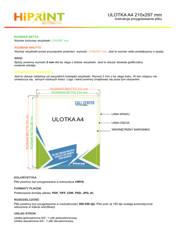 ULOTKA A4 210x297 mm Instrukcja przygotowania pliku ROZMIAR NETTO Wymiar końcowy wizytówki- 210x297 mm ROZMIAR BRUTTO Wymiar wizytówki przed przycięciem powinien wynosić - 214x301 mm. Jest to wymiar netto powiększony o spady. SPAD Spady powinny wynosić 2 mm dla każdego z boków wizytówki. Jest to obszar dookoła grafiki,który zostanie odcięty. WEWNĘTRZNY MARGINES Jest to obszar oddalony od wszystkich krawędzi wizytówki. Wynosi 3 mm z każdego boku. W tym miejscu nie umieszcza się żadnych istotnych treści. Logo i tekst powinny znajdować się poza tym obszarem. LINIA SPADU ROZMIAR NETTO 297 mm ROZMIAR BRUTTO 301 mm ROZMIAR BRUTTO 214 mm ROZMIAR NETTO 210 mm ULOTKA A4 LINIA CIĘCIA WEWNĘTRZNY MARGINES KOLORYSTYKA Pliki powinny być przygotowane w kolorystyce CMYK. FORMATY PLIKÓW Preferowane formaty plików: PDF, TIFF, CDR, PSD, JPG, AI. ROZDZIELCZOŚĆ Pliki powinny być przygotowane w rozdzielczości 300-350 dpi. Pliki poniżej 150 dpi zostają automatycznie odrzucone w trakcie weryfikacji. UKŁAD STRON Ulotka jednostronna 4/0 - 1 plik jednostronicowy Ulotka dwustronna 4/4 - 1 plik dwustronicowy