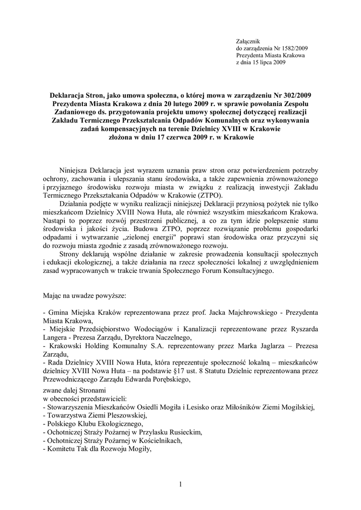 Załącznik do zarządzenia Nr 1582/2009 Prezydenta Miasta Krakowa z dnia 15 lipca 2009 Deklaracja Stron, jako umowa społeczna, o której mowa w zarządzeniu Nr 302/2009 Prezydenta Miasta Krakowa z dnia 20 lutego 2009 r. w sprawie powołania Zespołu Zadaniowego ds. przygotowania projektu umowy społecznej dotyczącej realizacji Zakładu Termicznego Przekształcania Odpadów Komunalnych oraz wykonywania zadań kompensacyjnych na terenie Dzielnicy XVIII w Krakowie złożona w dniu 17 czerwca 2009 r. w Krakowie Niniejsza Deklaracja jest wyrazem uznania praw stron oraz potwierdzeniem potrzeby ochrony, zachowania i ulepszania stanu środowiska, a także zapewnienia zrównoważonego i przyjaznego środowisku rozwoju miasta w związku z realizacją inwestycji Zakładu Termicznego Przekształcania Odpadów w Krakowie (ZTPO). Działania podjęte w wyniku realizacji niniejszej Deklaracji przyniosą pożytek nie tylko mieszkańcom Dzielnicy XVIII Nowa Huta, ale również wszystkim mieszkańcom Krakowa. Nastąpi to poprzez rozwój przestrzeni publicznej, a co za tym idzie polepszenie stanu środowiska i jakości życia. Budowa ZTPO, poprzez rozwiązanie problemu gospodarki odpadami i wytwarzanie „zielonej energii" poprawi stan środowiska oraz przyczyni się do rozwoju miasta zgodnie z zasadą zrównoważonego rozwoju. Strony deklarują wspólne działanie w zakresie prowadzenia konsultacji społecznych i edukacji ekologicznej, a także działania na rzecz społeczności lokalnej z uwzględnieniem zasad wypracowanych w trakcie trwania Społecznego Forum Konsultacyjnego. Mając na uwadze powyższe: - Gmina Miejska Kraków reprezentowana przez prof. Jacka Majchrowskiego - Prezydenta Miasta Krakowa, - Miejskie Przedsiębiorstwo Wodociągów i Kanalizacji reprezentowane przez Ryszarda Langera - Prezesa Zarządu, Dyrektora Naczelnego, - Krakowski Holding Komunalny S.A. reprezentowany przez Marka Jaglarza – Prezesa Zarządu, - Rada Dzielnicy XVIII Nowa Huta, która reprezentuje społeczność lokalną – mieszkańców dzielnicy XVIII Nowa Huta – na podstawie §17 ust. 8 Statutu Dzielnic reprezentowana przez Przewodniczącego Zarządu Edwarda Porębskiego, zwane dalej Stronami w obecności przedstawicieli: - Stowarzyszenia Mieszkańców Osiedli Mogiła i Lesisko oraz Miłośników Ziemi Mogilskiej, - Towarzystwa Ziemi Pleszowskiej, - Polskiego Klubu Ekologicznego, - Ochotniczej Straży Pożarnej w Przylasku Rusieckim, - Ochotniczej Straży Pożarnej w Kościelnikach, - Komitetu Tak dla Rozwoju Mogiły, 1 deklarują, co następuje: §1 1. Realizacja zadań kompensacyjnych nastąpi zgodnie z harmonogramem wynikającym z Uchwały Nr XXVIII/269/09 Rady Dzielnicy XVIII Nowa Huta z dnia 29 stycznia 2009 r. oraz Uchwały Nr XXXII/306/09 Rady Dzielnicy XVIII Nowa Huta z dnia 23 kwietnia 2009 r. a także prac Zespołu Zadaniowego ds. przygotowania zakresu i harmonogramu realizacji przedsięwzięć na terenie Dzielnicy XVIII Nowa Huta, powołanego Zarządzeniem Nr 302/2009 Prezydenta Miasta Krakowa z dnia 20 lutego 2009 r. 2. Harmonogram realizacji zadań kompensacyjnych stanowi załącznik nr 1 do niniejszej Deklaracji. §2 1. Strony deklarują kontynuację konsultacji społecznych i edukacji ekologicznej, a także działań na rzecz społeczności lokalnej z uwzględnieniem zasad wypracowanych w trakcie trwania Społecznego Forum Konsultacyjnego. Konsultacje będą trwałym elementem powstawania i realizacji inwestycji oraz późniejszego jej funkcjonowania. 2. Strona miejska realizować będzie inwestycję budowy, a później eksploatację ZTPO poprzez Krakowski Holding Komunalny SA., spółkę będąca własnością miasta, zgodnie z uchwałą nr LVI/710/08 Rady Miasta Krakowa z dnia 5.11.2008 r. §3 1. Strona miejska będzie traktować inwestycje z listy kompensacyjnej na terenie Dzielnicy XVIII Nowa Huta jako priorytetowe, poprzez: a) zapewnienie środków finansowych na realizację zadań zgodnie z przyjętym Harmonogramem realizacji zadań, b) terminową realizację zadań oraz procedowanie wniosków w postępowaniu administracyjnym związanym z realizacją zadań zgodnie z przyjętym Harmonogramem realizacji zadań, c) udzielanie wyjaśnień oraz przedstawianie stanowiska członkom Zespołu, o którym mowa w § 5 niniejszej Deklaracji lub Radzie Dzielnicy XVIII Nowa Huta, d) zapraszanie przedstawicieli Zespołu, o którym mowa w § 5 niniejszej Deklaracji oraz Rady Dzielnicy XVIII Nowa Huta na spotkania, na których będzie omawiany stan realizacji oraz zakres rzeczowy poszczególnych zadań. 2. Do publicznej wiadomości będą podawane informacje o kolejnych etapach realizacji zarówno inwestycji budowy ZTPO jak i poszczególnych zadań kompensacyjnych by umożliwić mieszkańcom zgłaszanie skarg, uwag i wniosków, które będą wnoszone pod obrady Zespołu, o którym mowa w § 5 niniejszej Deklaracji. §4 1. Środki na realizację zadań będą pochodzić z budżetu miasta Krakowa, środków własnych spółek miejskich oraz innych źródeł. 2 2. Prezydent Miasta Krakowa deklaruje, iż niezwłocznie złoży Radzie Miasta Krakowa informację dotyczącą zadań kompensacyjnych związanych z budową ZTPO oraz w tzw. trybie prezydenckim przedłoży projekt uchwały zawierającej propozycje wynikających z nich zmian w uchwale budżetowej. 3. Zabezpieczenie środków na sfinansowanie zadań będących w kompetencji Miasta w latach 2010-2013 nastąpi w drodze przedstawienia Radzie Miasta Krakowa przez Prezydenta Miasta Krakowa projektu uchwał budżetowych odpowiednio na lata 2010, 2011, 2012 i 2013 wprowadzających wskazane zadania inwestycyjne do realizacji w latach 2010-2013. 4. Zadania pozostające w kompetencjach spółek miejskich realizowane będą na podstawie zobowiązań organów statutowych Spółek w oparciu o środki własne i inne źródła, co znajdzie odzwierciedlenie w planach działalności spółek opracowanych przez ich organy. §5 1. W uzgodnieniu ze stronami niniejszej Deklaracj