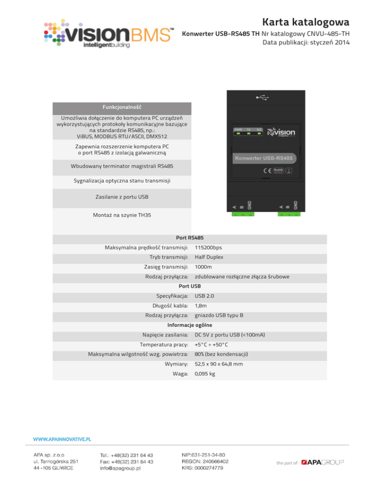 Karta katalogowa Konwerter USB-RS485 TH Nr katalogowy CNVU-485-TH Data publikacji: styczeń 2014 Funkcjonalność Umożliwia dołączenie do komputera PC urządzeń wykorzystujących protokoły komunikacyjne bazujące na standardzie RS485, np.: ViBUS, MODBUS RTU/ASCII, DMX512 Zapewnia rozszerzenie komputera PC o port RS485 z izolacją galwaniczną Wbudowany terminator magistrali RS485 Sygnalizacja optyczna stanu transmisji Zasilanie z portu USB Montaż na szynie TH35 Port RS485 Maksymalna prędkość transmisji: 115200bps Tryb transmisji: Half Duplex Zasięg transmisji: 1000m Rodzaj przyłącza: zdublowane rozłączne złącza śrubowe Port USB Specyfikacja: Długość kabla: Rodzaj przyłącza: USB 2.0 1,8m gniazdo USB typu B Informacje ogólne Napięcie zasilania: Temperatura pracy: Maksymalna wilgotność wzg. powietrza: Wymiary: Waga: DC 5V z portu USB (<100mA) +5°C ÷ +50°C 80% (bez kondensacji) 52,5 x 90 x 64,8 mm 0,095 kg