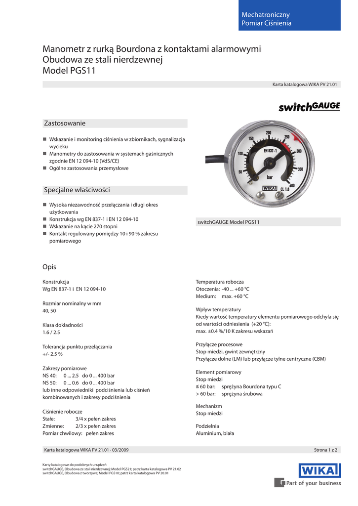 Mechatroniczny Pomiar Ciśnienia Manometr z rurką Bourdona z kontaktami alarmowymi Obudowa ze stali nierdzewnej Model PGS11 Karta katalogowa WIKA PV 21.01 Zastosowanie Wskazanie i monitoring ciśnienia w zbiornikach, sygnalizacja wycieku Manometry do zastosowania w systemach gaśnicznych zgodnie EN 12 094-10 (VdS/CE) Ogólne zastosowania przemysłowe Specjalne właściwości Wysoka niezawodność przełączania i długi okres użytkowania Konstrukcja wg EN 837-1 i EN 12 094-10 Wskazanie na kącie 270 stopni Kontakt regulowany pomiędzy 10 i 90 % zakresu pomiarowego switchGAUGE Model PGS11 Opis Konstrukcja Wg EN 837-1 i EN 12 094-10 Rozmiar nominalny w mm 40, 50 Klasa dokładności 1.6 / 2.5 Temperatura robocza Otoczenia: -40 ... +60 °C Medium: max. +60 °C Wpływ temperatury Kiedy wartość temperatury elementu pomiarowego odchyla się od wartości odniesienia (+20 °C): max. ±0.4 %/10 K zakresu wskazań Tolerancja punktu przełączania +/- 2.5 % Przyłącze procesowe Stop miedzi, gwint zewnętrzny Przyłącze dolne (LM) lub przyłącze tylne centryczne (CBM) Zakresy pomiarowe NS 40: 0 ... 2.5 do 0 ... 400 bar NS 50: 0 ... 0.6 do 0 ... 400 bar lub inne odpowiedniki podciśnienia lub ciśnień kombinowanych i zakresy podciśnienia Element pomiarowy Stop miedzi ≤ 60 bar: sprężyna Bourdona typu C > 60 bar: sprężyna śrubowa Ciśnienie robocze Stałe: 3/4 x pełen zakres Zmienne: 2/3 x pełen zakres Pomiar chwilowy: pełen zakres Karta katalogowa WIKA PV 21.01 ∙ 03/2009 Karty katalogowe do podobnych urządzeń: switchGAUGE, Obudowa ze stali nierdzewnej; Model PGS21; patrz karta katalogowa PV 21.02 switchGAUGE, Obudowa z tworzywa; Model PGS10; patrz karta katalogowa PV 20.01 Mechanizm Stop miedzi Podzielnia Aluminium, biała Strona 1 z 2 Opcje Wskazówka Tworzywo, czarna Inne przyłącze procesowe Stopień ochrony IP 65 (Model PGS21) Podwójny kontakt Obudowa Stal nierdzewna Szyba Poliwęglan Stopień ochrony IP 54 wg EN 60 529 / lEC 529 Wymiary w mm Test szczelności helem Szybkość ucieczki 10-5 mbar*l/s Wersja standardowa Przyłącze dolne (LM) 11400943.01 Elektronika Napięcie przełączania: 4.5 ... 24 VDC/VAC Prąd przełączania: 5 ... 100 mA Obciążenie kontaktu: max. 2.4 W Kontakt przełączający: otwiera (NC - normalnie zamknięty) lub zamyka (NO - normalnie otwarty) (regulowany pomiędzy10 i 90 % zakresu pomiarowego) Bezpotencjałowy Przyłącze elektryczne Luźne przewody lub wtyczka Przyłącze tylne centryczne (CBM) 11321474.01 Aprobaty Aprobata dla VdS i CE wg EN 12 094-10 NS 40 50 Wymiary w mm Waga w kg D b1 ± 0.5 b2 ± 1 b3 ± 0.5 G SW 40 50 34.5 35.5 51 53.5 30.5 35.5 G 1/8 B G 1/4 B 14 14 0.10 0.12 Przyłącze procesowe wg EN 837-1 / 7.3 Informacje potrzebne do zamówienia Model / Rozmiar nominalny / Zakres pomiarowy / Rozmiar przyłącza / Położenie przyłącza / Punkt przełączania i funkcja / Opcje Strona 2 z 2 Karta katalogowa WIKA PV 21.01 ∙ 03/2009 WIKA Polska S.A. Ul. Łęgska 29/35, 87-800 Włocławek Tel.: (+48) 54 23 01 100 Fax: (+48) 54 23 01 101 E-mail: [email protected] www.wikapolska.pl 12918777 03/2009 PL Specyfikacje i wymiary podane w nieniejszej karcie przedstawiają stan konstrukcyjny aktualny w momencie wydruku. Istnieje możliwość wprowadzenia modyfikacji i zmian w specyfikacji materiałowej.