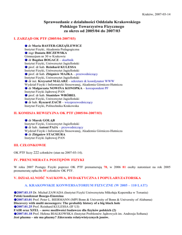 Kraków, 2007-03-14 Sprawozdanie z działalności Oddziału Krakowskiego Polskiego Towarzystwa Fizycznego za okres od 2005/04 do 2007/03 I. ZARZĄD OK PTF (2005/04-2007/03) dr Maria BASTER-GRZĄŚLEWICZ Instytut Fizyki, Akademia Pedagogiczna mgr Danuta BICZEWSKA Gimnazjum nr 30 w Krakowie dr Bogdan BOGACZ – skarbnik Instytut Fizyki, Uniwersytet Jagielloński prof. dr hab. Reinhard KULESSA Instytut Fizyki, Uniwersytet Jagielloński prof. dr hab. Zbigniew MAJKA – przewodniczący Instytut Fizyki, Uniwersytet Jagielloński dr inż. Krzysztof MALARZ – sekretarz & koordynator WWW Wydział Fizyki i Informatyki Stosowanej, Akademia Górniczo-Hutnicza dr Małgorzata NOWINA KONOPKA – korespondent PF Instytut Fizyki Jądrowej PAN prof. dr hab. Stanisław WRÓBEL Instytut Fizyki, Uniwersytet Jagielloński dr hab. Ryszard ZACH – wiceprzewodniczący Instytut Fizyki, Politechnika Krakowska II. KOMISJA REWIZYJNA OK PTF (2005/04-2007/03) dr Marek GOŁĄB Instytut Fizyki, Uniwersytet Jagielloński dr hab. Antoni PAJA – przewodniczący Wydział Fizyki i Informatyki Stosowanej, Akademia Górniczo-Hutnicza dr Zbigniew STACHURA Instytut Fizyki Jądrowej PAN III. CZŁONKOWIE OK PTF liczy 222 członków (stan na 2007-03-14). IV. PRENUMERATA POSTĘPÓW FIZYKI W roku 2007 Postępy Fizyki poprzez OK PTF prenumerują 78, w 2006 81 osoby natomiast na rok 2005 prenumeratę opłaciło 85 członków OK PTF. V. DZIAŁALNOŚĆ NAUKOWA, DYDAKTYCZNA I POPULARYZATORSKA A. KRAKOWSKIE KONWERSATORIUM FIZYCZNE (W 2005 – 110 LAT!) 2007.03.15 Dr. Michał ZAWADA (Instytut Fizyki Uniwersytetu Mikołaja Kopernika w Toruniu) Polski kondensat Bosego-Einsteina 2007.03.01 Prof. Peter L. BIERMANN (MPI Bonn & University of Bonn & University of Alabama) Discovery with multi messengers: The probably history of a big black hole 2007.01.25 Prof. Reinhard KULESSA (IF UJ) FAIR oraz XFEL – nowe możliwości badawcze dla fizyków polskich (2) 2007.01.18 Prof. Helena BIAŁKOWSKA (Instytut Problemów Jądrowych im. Andrzeja Sołtana) Jest plazma – nie ma plazmy? Zderzenia relatywistycznych jonów. 2007.01.11 Prof. Reinhard KULESSA (IF UJ) FAIR oraz XFEL – nowe możliwości badawcze dla fizyków polskich (1) 2006.12.07 Prof. Ewa RONDIO (Instytut Problemów Jądrowych im. Andrzeja Sołtana, Warszawa) Bliskie i dalekie plany fizyki neutrin 2006.11.30 Prof. Marta DZIEDZICKA-WASYLEWSKA (Instytut Farmakologii PAN, Kraków) Fizyczne metody badania mózgu 2006.11.23 Dr. Daniel FRUCHART (Laboratoire de Cristallographie du CNRS, Grenoble) Hydrogen storage in hydrides for safe energy systems 2006.11.16 Prof. Marian GRYNBERG (IFD UW) Atom wodoru w zero-wymiarowej przestrzeni – donor w kropce kwantowej – doświadczenia i model 2006.10.19 Prof. Andrzej HRYNKIEWICZ (IFJ PAN) Perspektywy energetyki 2006.10.12 Prof. Roman JUSZKIEWICZ (Centrum Astronomiczne Mikołaja Kopernika, Warszawa) Nobel 2006 z fizyki – mikrofalowe promieniowanie tła 2006.10.05 Dr hab. Piotr BIZOŃ (IF UJ) Czarne dziury i fale grawitacyjne 2006.09.28 Finał VI Ogólnopolskiego Konkursu na Doświadczenie Pokazowe z Fizyki (drugie konwersatorium w całości transmitowane przez internet z WFiIS AGH) 2006.06.08 Prof. Krzysztof FIAŁKOWSKI (IF UJ) Setna rocznica urodzin Ettore Majorany 2006.06.01 Dr Andreas BUCHLEITNER (Max-Planck-Institut für Physik Komplexer Systeme, Drezno) The noise makes the signal – what a small fry should know about stochastic resonance 2006.05.18 Prof. Zbigniew MAJKA (IF UJ) Od czterech żywiołów do kwarków i gluonów 2006.05.11 Prof. Yuri OGANESSIAN (Flerov Laboratory of Nuclear Research, Joint Institute for Nuclear Research, Dubna) Synthesis and decay properties of superheavy elements 2006.04.20 Dr Maria BRZOZOWSKA (IF UJ) Jak badać atomy w temperaturach bliskich zera bezwzględnego 2006.04.06 Dr hab. Bogdan IDZIKOWSKI (Instytut Fizyki Molekularnej PAN, Poznań) Unoszenie w polu magnetycznym 2006.03.30 Dr. Kai ZUBER (Department of Physics, University of Oxford & Department of Physics and Astronomy, University of Sussex) Double beta decay 2006.03.23 Dr hab. Krzysztof GOLEC-BIERNAT (IFJ PAN) Kwarkowo-gluonowa struktura protonu 2006.03.16 Prof. Józef SPAŁEK (IF UJ) Nowa fizyka układów wielu cząstek – spinowo zależne masy kwazicząstek i kwantowe zjawiska krytyczne 2006.03.09 Dr hab. Ludwik PIEŃKOWSKI (Środowiskowe Laboratorium Ciężkich Jonów, UW) Energetyka jądrowa w Polsce. Istotne pytania 2006.03.02 Dr. M. SCHOLZ (GSI Darmstadt) Ion Beams in Radiobiology: From Basic Research to Applications in Tumor Therapy 2006.02.23 Prof. V.A. KARNAUKHOV (JINR, Dubna & FASA collaboration) Spinodal State of Nuclear Matter 2006.01.26 Dr Tolek TYLISZCZAK (Advanced Light Source, Lawrence Berkeley National Laboratory) Mikroskopy rentgenowskie 2006.01.12 Prof. Andrzej Kajetan WRóBLEWSKI (WF UW) Einstein i fizyka 100 lat temu 2006.01.06 Prof. Ryszard SOSNOWSKI (Instytut Problemów Jądrowych, Warszawa) Co wiemy o Bozonie Higgsa? 2005.12.15 Prof. Michał OSTROWSKI (OA UJ) Astrofizyka teraelektronowych fotonów γ: eksperyment HESS 2005.12.08 Dr Włodzimierz GURYN (Brookhaven National Laboratory, USA) Playing Billiards at the Colliders: Elastic Scattering at RHIC 2005.12.01 Prof. Andrzej KOWALCZYK (IF, UMK w Toruniu) Optyczna tomografia (OCT) w zastosowaniach okulistycznych 2005.11.17 Dr hab. Marcin WÓJCIK (IF UJ) Detekcja cząstek ciemnej, chłodnej materii w podziemnych laboratoriach 2005.11.03 Prof. Robert WILLIAMS (Space Telescope Science Institute, Baltimore, USA) Hubble Space Telescope: Its History & Discoveries 2005.10.27 Prof. A. N. SISAKIAN (ZIBJ, Dubna) Dziś i jutro Zjednoczonego Instytutu Badań Jądrowych w Dubnej 2005.10.20 Prof. T. M. BRZOZOWSKI, Prof. W. GAWLIK, Prof. J. ZAKRZEWSKI (IF UJ) Nobel z fizyki 2005 2005.10.13 Prof. Elżbieta ZIPPER (IF UŚ) Niezwykłe własności nanonorurek węglowych 2005.10.06 Prof. Jerzy JURKIEWICZ (IF UJ) Czterowymiarowy wszechświat w lorentzowskiej kwantowej grawitacji 2005.08.25 Sir Roger PENROSE