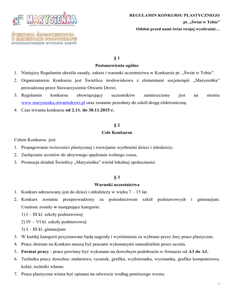 REGULAMIN KONKURSU PLASTYCZNEGO pt. „Świat w Tobie” Odsłoń przed nami świat swojej wyobraźni… §1 Postanowienia ogólne 1. Niniejszy Regulamin określa zasady, zakres i warunki uczestnictwa w Konkursie pt. ,,Świat w Tobie”. 2. Organizatorem Konkursu jest Świetlica środowiskowa z elementami socjoterapii ,,Marysieńka” prowadzona przez Stowarzyszenie Otwarte Drzwi. 3. Regulamin konkursu obowiązujący uczestników zamieszczony jest na stronie www.marysienka.otwartedrzwi.pl oraz zostanie przesłany do szkół drogą elektroniczną. 4. Czas trwania konkursu od 2.11. do 30.11.2015 r. §2 Cele Konkursu Celem Konkursu jest: 1. Propagowanie twórczości plastycznej i rozwijanie wyobraźni dzieci i młodzieży. 2. Zachęcanie uczniów do aktywnego spędzania wolnego czasu. 3. Promocja działań Świetlicy „Marysieńka” wśród lokalnej społeczności. §3 Warunki uczestnictwa 1. Konkurs adresowany jest do dzieci i młodzieży w wieku 7 – 15 lat. 2. Konkurs zostanie przeprowadzony za pośrednictwem szkół podstawowych i gimnazjum. Ustalone zostały w następujące kategorie: 1) I – III kl. szkoły podstawowej 2) IV – VI kl. szkoły podstawowej 3) I – III kl. gimnazjum 3. W każdej kategorii przyznawane będą nagrody i wyróżnienia za wybrane przez Jury prace plastyczne. 4. Prace złożone na Konkurs muszą być pracami wykonanymi samodzielnie przez ucznia. 5. Format pracy - prace powinny być wykonane na dowolnym podobraziu w formacie od A3 do A1. 6. Technika pracy dowolna: malarstwo, rysunek, grafika, wydzieranka, wycinanka, grafika komputerowa, kolaż, techniki własne. 7. Praca plastyczna winna być opisana na odwrocie według poniższego wzoru: 1 Imię, nazwisko Wiek, klasa Nazwa i adres szkoły 8. Do pracy należy dołączyć poprawnie wypełniony Formularz Zgłoszeniowy (Załącznik nr 1 Regulaminu) oraz wymagane oświadczenia (Załącznik nr 2 Regulaminu). Wzory wymaganych oświadczeń zostaną dołączone w formie załącznika do regulaminu i przesłane do szkół. Dokumenty będzie można również pobrać ze strony internetowej www.marysienka.otwartedrzwi.pl lub otrzymać bezpośrednio w Świetlicy „Marysieńka”. 9. Prace na Konkurs mogą składać: rodzice uczniów, nauczyciele szkół bądź sami uczestnicy Konkursu w Świetlicy „Marysieńka”, przy ul. Kolegiackiej 3 w Warszawie. 10. Ostateczny termin składania prac: 30.11.2015r., godz. 18.00. 11. Udział w Konkursie jest jednoznaczny z nieodpłatnym udzieleniem praw autorskich, na wykorzystanie prac w celach promocyjnych Konkursu. 12. Osoby składające prace konkursowe wyrażają zgodę na przetwarzanie przez Organizatora Konkursu swoich danych osobowych (Ustawą z dnia 29.08.1997 r. o Ochronie Danych Osobowych; tekst jednolity: Dz.U. z 2002 r. Nr 101, poz. 926 ze zm). 13. Prace zgłoszone do Konkursu mogą zostać zwrócone autorom po zakończonej wystawie pokonkursowej z zastrzeżeniem, że odbiór jest osobisty ze Świetlicy „Marysieńka”. 14. Prace nie spełniające zasad uczestnictwa, nie będą podlegały ocenie konkursowej. §4 Ocena prac konkursowych 1. Prace należy składać do 30.11.2015 r., bezpośrednio w Świetlicy „Marysieńka”, ul. Kolegiacka 3, Warszawa. Szczegółowych informacji dotyczących Konkursu udziela kierownik Świetlicy „Marysieńka” – pani Marta Włosek, kontakt: [email protected] lub nr tel. 533 221 588. 2. Organizator zastrzega sobie prawo do wydłużenia terminu składania prac w przypadku ich niewystarczającej ilości. W związku z tym przesunięciu ulegnie termin rozwiązania Konkursu. 3. O wyłonieniu laureatów Konkursu decyduje Jury powołane przez Organizatora. 4. W skład Jury wejdą: - p. Marta Włosek - kierownik Świetlicy „Marysieńka” - p. Halina Myszkowska - dyrektor Biblioteki Publicznej w Dzielnicy Wilanów - p. Katarzyna Wilczyńska - specjalista ds. promocji Stowarzyszenia Otwarte Drzwi - p. Teresa Radzimirska - dyrektor Ośrodka Wsparcia Najuboższych Fundacji Ecclesia Villanovensis - p. Małgorzata Mityk - architekt, instruktorka zajęć w Centrum Kultury Wilanów. 5. Jury pod uwagę weźmie: kreatywność (tematyka, kolorystyka); 2 oryginalność techniki; estetykę wykonania. 6. Decyzje jury konkursowego są ostateczne. §5 Ogłoszenie wyników Konkursu 1. Wyniki zostaną ogłoszone na początku grudnia 2015 r. 2. Lista laureatów zostanie opublikowana na stronie internetowej www.marysienka.otwartedrzwi.pl. 3. Szkoły, z których dzieci zgłosiły się do Konkursu, zostaną poinformowane (mailem lub telefonicznie) o rozstrzygnięciach podjętych przez jury. 4. Laureaci zostaną o wynikach poinformowani telefonicznie. 5. Uroczyste wręczenie nagród oraz otwarcie wystawy pokonkursowej odbędzie się w Bibliotece Publicznej w Dzielnicy Wilanów, ul. Kolegiacka 3. §6 Nagrody 1. Organizator przyzna nagrody za I, II i III miejsce w poszczególnych kategoriach oraz wyróżnienia. 2. Pozostali uczestnicy otrzymają dyplomy za udział w Konkursie. §7 Postanowienia ogólne 1. Niniejszy Regulamin jest jedynym i wyłącznym dokumentem określającym zasady i warunki prowadzenia konkursu. 2. Koszty przygotowania oraz złożenie pracy konkursowej ponosi wyłącznie uczestnik Konkursu. Koszty przejazdu do miejsca odebrania nagrody również nie obciążają Organizatora. 3 Załącznik nr 1 Regulaminu Konkursu pt. „Świat w Tobie” FORMULARZ ZGŁOSZENIOWY 1. Dane personalne: Imię i Nazwisko:………………………………………………………………………………………. Data urodzenia:……………………………………………………………………………………….. Adres:………………………………………………………………………………………………….. Telefon do rodzica/opiekuna:………………………………………………………………………….. 2. Nazwa i adres szkoły: ……………………………………………………………