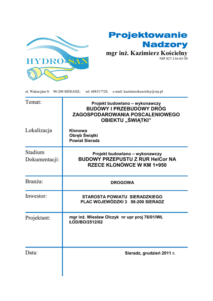 Projektowanie Nadzory mgr inŜ. Kazimierz Kościelny NIP 827-116-65-50 ul. Wakacyjna 9; 98-200 SIERADZ; Temat: tel. 608317728; e-mail: [email protected] Projekt budowlano – wykonawczy BUDOWY I PRZEBUDOWY DRÓG ZAGOSPODAROWANIA POSCALENIOWEGO OBIEKTU „ŚWIĄTKI” Lokalizacja Stadium Dokumentacji: BranŜa: Inwestor: Projektant: Data: Klonowa Obręb Świątki Powiat Sieradz Projekt budowlano – wykonawczy BUDOWY PRZEPUSTU Z RUR HelCor NA RZECE KLONÓWCE W KM 1+950 DROGOWA STAROSTA POWIATU SIERADZKIEGO PLAC WOJEWÓDZKI 3 98-200 SIERADZ mgr inŜ. Wiesław Olczyk nr upr proj 76/01/WŁ ŁOD/BO/2512/02 Sieradz, grudzień 2011 r. SPIS TREŚCI I część opisowa 1. Dane ogólne 3. Opis techniczny 3. Oświadczenie projektanta 4. Informacja BiOZ 5. część rysunkowa - nomogram z katalogu HelCor - zlewnia rzeki Klonówki - szkic sytuacyjny - projekt zagospodarowania terenu - przekrój poprzeczny - lokalizacja przepustu - przekrój poprzeczny drogi nad przepustem 5. kserokopia uprawnień 5. zaświadczenie z ŁOIIB str. 3 str. 3-8 str. 9 str. 10-11 str. 12 str. 13 str. 14 str. 15 str. 16 str. 17 str. 18 str. 19 str. 20 2 1. Dane ogólne: 1.1. Rodzaj opracowania: Opracowanie obejmuje projekt przepustu rurowego z rur stalowych karbowanych na rzece Klonówce w miejscowości Świątki 1.2. Podstawa opracowania: - zlecenie Inwestora. 1.3. Inwestor: Starosta Powiatu Sieradzkiego ul. Plac Wojewódzki 3 98-200 Sieradz 1.4. lokalizacja inwestycji: Projektowny przepust znajdować się będzie na ciągu drogi polnej transportu rolniczego o nawierzchni gruntowej oznaczonej nr 9 wg załoŜeń scaleniowych ( droga przebiega po dz nr ew 15-175, 15-211) w miejscowości Świątki gmina Klonowa pow. Sieradz. Oś przepustu wypada w hm 6+70 . wylot przepustu wypada w km 1+950 rzeki Klonówki 1.5. Dane ogólne W ramach zadania inwestycyjnego przewiduje wykonanie przepustu rurowego z rur prefabrykowanych Helcor typu HCPA z rur stalowych karbowanych. 2. Zlewnia rzeki Rzeka Klonówka Wielkość zlewni obliczono na podstawie pomiaru naniesionego zasiągu zlewni na mapie w skali 1:25 000. ( rys nr 1 ) Powierzchnia zlewni rzeki w przekroju wlotu przepustu jest dość duŜa, poniewaŜ jest to odcinek ujściowy rzeki, która ma długość 14,925 km. Wielkość zlewni rzeki obliczono w przekroju km 2+000 czyli ok. 50 m poniŜej projektowanego wlotu do przepustu. Zasięg zlewni wyznaczono w jej maksymalnym zasięgu. Wielkość przyjętej do obliczeń zlewni wyniesie A ≈ 35,7 km2. 2.1. Wielkości opadów atmosferycznych Za reprezentatywny przyjęto rozkład opadów na posterunku opadowym w Złoczewie w latach 1997- 2006. Wielkość opadów przedstawia poniŜsza tabela: MIESIĄCE I II III IV V VI VII VIII IX X XI XII Opad roczny Wysokość opadu 28 37 39 44 53 60 105 50 39 42 43 44 0,584 3 2.2. Przepływy o określonym prawdopodobieństwie występowania – rzeka Klonówka Qmax p = ƒ F1 φ H1 A λp δj 1 (m3/s) ƒ - bezwymiarowy współczynnik kształtu fali F1 - maksymalny moduł odpływu jednostkowego dla ts = 20 min Φr = 132 φ - współczynnik odpływu H1 - maksymalny opad dobowy o prawdopodobieństwie pojawienia się 1% A - powierzchnia zlewni w km2 λp - kwantyl rozkładu zmiennej dla Ŝądanego prawdopodobieństwa pojawienia się δj - współczynnik redukcji jeziornej w zaleŜności od wskaźnika jeziorności ƒ= 0,6 φ= 0,25 F1 = 0,018 H1 = 95 0,5% 1% A= δj = 35,7 1 Qmax p dla p= (prawdopodobieństwo kwantyli) 0,1% 0,2% 2% 3% 4% 5% 10% 20% 30% 50% 0,7875 Qmax 4% = 7,211 0,75 Qmax 5% = 6,868 0,637 Qmax 10% = 5,833 0,521 Qmax 20% = 4,771 0,368 Qmax 30% = 3,37 0,263 Qmax 50% = 2,408 λp% 1,57 Qmax 0,1% = 14,377 1,39 Qmax 0,2% = 12,728 1,17 Qmax 0,5% = 10,714 1 Qmax 1% = 9,157 0,893 Qmax 2% = 8,177 0,825 Qmax 3% = 7,555 2.2.1. Przepływy charakterystyczne – rzeka Klonówka 2.2.1.1. Przepływ średni roczny SQ = 0,03171 Cs P A gdzie: SQ - Przepływ średni roczny (m3/sek) Cs - Współczynnik odpływu, Cs = 0,25 P - wysokość opadu normalnego rocznego (m), P= 0,584 A - powierzchnia zlewni (km2), A= 35,7 SQ =0,165 (m3/sek) 2.2.1.2. Przepływ średni normalny – rzeka Klonówka SSQ = 0,03171 (P-E) A gdzie: SSQ - Przepływ średni normalny (m3/sek) P - wysokość opadu normalnego rocznego (m) 2 A - powierzchnia zlewni (km ) 1 P= 0,584 A= 35,7 metoda Stachý i Fal 4 E - parowanie terenowe średnie sumy roczne E= 0,52 SSQ = 0,072 (m3/sek) 2.2.1.3. Przepływ średni niski dobowy (minimalny) – rzeka Klonówka SNQ = 4,068*10-4*A1,045*SSqg0,96*ir0,11*(1+Jez)0,23 gdzie: SNQ - Przepływ średni niski dobowy (minimalny) (m3/sek) SSqg - średni z wielolecia odpływ jednostkowy z zasilania 3 SSqg = 1,75 ir = 2,3 Jez. = 1 A= 35,7 2 podziemnego [dm /s/km ] ir - Spadek cieku (m/km) Jez. -wskaźnik jeziorności A - powierzchnia zlewni w km 2 SNQ = 0,032 (m3/sek) 2.3. Obliczenie maksymalnego przepływu w przepuście – rzeka Klonówka Ilość wód jaka moŜe przepłynąć przez przepust ustalę przy uŜyciu wzoru na obliczenie natęŜenia przepływu dla przewodów kołowych: Q=Fv gdzie: Q – przepływ w kanale (m3/s) v – średnia prędkość przepływu w obliczeniowym przekroju kanału (m/s) F – pole powierzchni przekroju czynnego (m2), tu F = 0,942 m2/s k = 2,5 Prędkość przepływu w kanale o dowolnym przekroju moŜna wyznaczyć zgodnie z metodą Prandtla – 2 Colebrooka przy uŜyciu wzoru: 0,63υ k v = −2 lg + R 8 gR I 14,84 Rh h h 8 gRh I gdzie: v – średnia prędkość przepływu w obliczeniowym przekroju kanału (m/s) Rh – promień hydrauliczny (m) I – straty jednostkowe na pokonanie oporów tarcia, równe spadkowi dna kanału (-) g – przyspieszenie ziemskie (m/s2) k – współczynnik chropowatości zastępczej kanału (m) υ - współczynnik lepkości kinematycznej przepływających ścieków (m2/s) 2 R. Edel „Odwodnienie dróg” wzór 6.6 str. 127 5 PowyŜszy wzór po przekształceniu dla przekroju kołowego dla średnicy D i zastąpieniu wartości promienia hydraulicznego: Rh = D 4 oraz wstawieniu pola