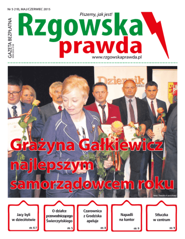 Nr 5 (19), MAJ/CZERWIEC 2015 GAZETA BEZPŁATNA ISSN 2353-2130 1 RZGOWSKA PRAWDA Piszemy, jak jest! www.rzgowskaprawda.pl Grażyna Gałkiewicz najlepszym samorządowcem roku foto: Tomasz Łuczyński Jacy byli w dzieciństwie str. 6-7 O działce przewodniczącego Świerczyńskiego str. 5 Czarownica z Grodziska apeluje str. 8 Napadli na kantor str. 9 Stłuczka w centrum str. 9 2 RZGOWSKA PRAWDA Nabór do Zawiszy Rzgów Serdecznie zapraszamy zawodników urodzonych w latach 2006 i młodszych na treningi nowo utworzonej drużyny. Trenerem zespołu jest Michał Osiński. Zapraszamy również dzieci urodzone w latach 2000-2002 oraz 2004-2005 na treningi drużyn występujących w ligach, odpowiednio C1 Trampkarz oraz E1 Orlik. Więcej informacji udzieli prezes Robert Świerczyński, nr tel. 505-128-168. Możliwy również kontakt poprzez e-mail: [email protected] Atrakcje na Dzień Dziecka Praca wre W sobotę, 30 maja, odbędzie się Rodzinny Dzień Dziecka w hali sportowej. Cały czas trwają roboty na Drodze Krajowej nr 1. Powodem jest budowa tunelu łączącego hale „Ptak Outlet” i „Ptak Expo” z obiektami, które znajdują się po drugiej stronie DK 1. Trzeba przyznać, że roboty nie spowodowały większego utrudnienia w ruchu. Korki tworzą się tylko na ul. Tuszyńskiej tuż po zamknięciu hal. Zatrzymany został pas prowadzący do Łodzi. Ruch odbywa się po drugiej stronie, wybudowano specjalne by-passy. Kierowcy mają do dyspozycji dwa pasy w obu kierunkach o szerokości 3 metrów. Wprowadzono tam zakaz wyprzedzania i ograniczenie prędkości do 50 km/h. Co zapobiegliwsze osoby wybierają objazd do hal przez Guzew - Babichy. Budowa tunelu ma za zadanie bezkolizyjne połączenie dwóch obiektów i szybszy do nich dojazd. Tunel ma mierzyć 200 m, szerokość jezdni wynosić będzie 3,5 m, a piesi do dyspozycji będą mieli chodnik o szerokości 2 m. Wjazd do tunelu będzie w okolicy KFC, a wyjazd w Ptak Outlet. Jego budowa ma zakończyć się pod koniec roku, utrudnienia na DK 1 mają ustać jesienią. Chmiel. Gmina wybrała Andrzeja Dudę Gmina Rzgów w II turze wyborów prezydenckich wybrała Andrzeja Dudę. Szacowana frekwencja wynosiła ponad 63%, czyli więcej niż ogólnopolska. Na Andrzeja Dudę oddano 2862 głosy. Jego konkurent Bronisław Komorowski otrzymał 2026 głosów poparcia. Mieszkańcy najliczniej odwiedzili lokal wyborczy w obwodzie nr II (Rzgów) i III (Stara Gadka), tam frekwencja wynosiła ponad 67%. W okręgu nr II Andrzeja Dudę wybrało 338 wyborców, Bronisław Komorowski otrzymał 309 głosów. Okręg nr III to 252 głosy oddane na Dudę i 149 na Komorowskiego. W innych obwodach głosy rozłożyły się następująco: obwód I (Rzgów) - Andrzej Duda 631 głosów, Bronisław Komorowski 438 głosów, obwód nr IV (Starowa Góra) - Duda 575 głosów, Komorowski 558 głosów, obwód nr V (Guzew, Gospodarz, Czyżeminek, Prawda) - Duda 417 głosów, Komorowski 244 głosy, obwód nr VI (Kalino, Kalinko, Bronisin Dworski, Huta Wiskicka, Tadzin) - Duda 454 głosy, Komorowski 232 głosy, obwód nr VII - Andrzej Duda 195 głosów, Bronisław Komorowski 96 głosów. Najniższa frekwencja była w obwodzie nr I (Rzgów) (60%). Impreza w ramach kampanii „Postaw na rodzinę” rozpocznie się o godz. 14.00. Na scenie pojawią się gimnazjaliści, którzy przedstawią program kabaretowy i zaprezentują swoje talenty wokalne. Przewidziany jest także występ grupy gitarowej, rozstrzygnięcie konkursu literackiego oraz układy taneczne SP Rzgów i DD Porszewice „Krasnale”. Od godz. 15.00 zorganizowane zostaną zawody sportowe, konkursy plastyczne, zabawy i konkursy harcerskie, stare i nowe zabawy podwórkowe. Przedstawione zostanie mobilne studio fotograficzne. Swoje prace prezentować będą „Zasupłane”. Po wyczerpujących zabawach dzieciaki będą mogły posilić się kiełbaskami i napojami. Dodatkowe atrakcje to zjeżdżalnia i trampolina. Organizatorami imprezy są: GKdsRPA, Gimnazjum w Rzgowie, GOSTiR, SP w Rzgowie, GOK, ZHP w Rzgowie, Stowarzyszenie „Otwarte Serca”. RZGOWSKA PRAWDA 3 Wszystkie nasze rzgowskie sprawy: 517-870-009, [email protected] l Jestem zaniepokojony posta- wą nowych radnych. Uważam, że protokoły z sesji i komisji są fałszowane. Zdarzyło mi się parę razy w nich uczestniczyć i to, co napisane jest w protokole, zupełnie różni się od tego, co było na spotkaniu. Nie podoba mi się to. Tak było za poprzedniej władzy i jest teraz… l Parę dni temu odwiedziłam znajomą, która mieszka w Rzgowie. Korzystając z pięknej pogody, poszłyśmy na spacer. Jestem zachwycona wyglądem parku miejskiego i jego okolic. Jest po prostu piękny. Czyściutki, zadbany, aż przyjemnie usiąść na ławeczce i pogawędzić. Chciałam serdecznie podziękować osobom odpowiedzialnym za wygląd parku. Widać, że wkładają dużo serca i pracy, aby osiągnąć tak wspaniały efekt. Gdyby Łódź była choć w połowie tak zadbana, byłabym zachwycona… l W mojej wczesnej młodości słyszałem, że mąż, pan domu, to tak zwana głowa domu. Żona to szyja, która głową kręci. Teraz słyszę ciągle o feminizmie. Dziwi mnie, że panie dotychczas nie zwróciły uwagi, iż połowa populacji znika z kart historii. Bywają cmentarze, na których nie znajdzie się nazwiska rodowego kobiety… l Dlaczego i na jakich zasadach została w urzędzie zatrudniona kuzynka naszego nowego radnego Radosława Pełki? Może to tylko przypadek, ale sporo pracy włożyliście w opisanie podobnego kumoterstwa naszej starej wierchuszki. Coś mi się zdaje, że nowa władza niczym się nie różni, bo po paru miesiącach urzędowania już takie kwiatki wychodzą. Chciałbym, żeby ta osoba odniosła się na łamach gazety do tego, co tutaj przekazałem… Odpowiada Radosław Pełka, wiceprzewodniczący Rady Miejskiej w Rzgowie: - Załatwienie mojej kuzynce pracy byłoby wbrew moim zasadom, nie miałem z tym nic wspólnego. Tym bardziej że prywatnie nie utrzy