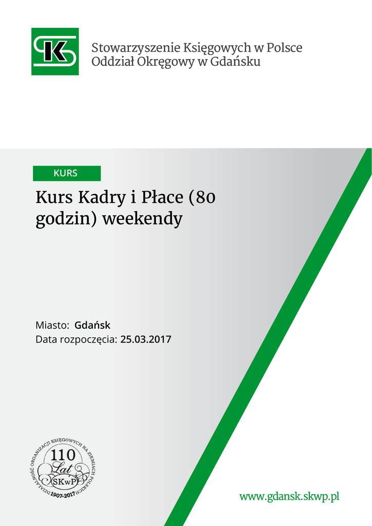 Stowarzyszenie Księgowych w Polsce Oddział Okręgowy w Gdańsku KURS Kurs Kadry i Płace (80 godzin) weekendy Miasto: Gdańsk Data rozpoczęcia: 25.03.2017 www.gdansk.skwp.pl Stowarzyszenie Księgowych w Polsce Oddział Okręgowy w Gdańsku Zapytaj o szkolenie tel. 58 341 25 30 fax. 58 344 17 87 [email protected] Kurs Kadry i Płace (80 godzin) weekendy od poniedziałku do piątku w godz. 8:00 -16:00 Nie znalazłeś oferty dla siebie? poinformuj nas jakiego szkolenia szukasz: [email protected] CEL: Celem szkolenia jest zapoznanie z obowiązującym aktualnie prawem pracy, z zasadami prowadzenia i sporządzania dokumentacji pracowniczej (w tym płacowej), z obowiązkami pracodawcy z tytułu rozliczeń publicznoprawnych (z tytułu ubezpieczenia społecznego i zdrowotnego oraz podatku dochodowego od osób fizycznych). Szkolenie obejmie też pracę przy komputerze: wykorzystanie programów Płatnik, RAKS do celów kadrowo-płacowych. PROGRAM: I. Prawo pracy (24 godziny) - Stosunek pracy oraz formy zatrudnienia. - Wynagrodzenie za prace i inne świadczenia. - Obowiązki pracodawcy i pracownika. - Odpowiedzialność materialna pracownika. - Czas pracy. - Urlopy pracownicze. - Ochrona pracy kobiet. - Zatrudnianie młodocianych. - BHP w zakładzie pracy. - Kontrola przestrzegania prawa pracy. II. Prowadzenie dokumentacji osobowej pracowników (12 godzin) - Prowadzenie akt osobowych. - Dokumentacja zarobkowa pracowników III. Obowiązki pracodawcy w zakresie rozliczeń publicznoprawnych (16 godzin) - Obowiązki pracodawcy względem ZUS - Podatek dochodowy od osób fizycznych IV. Lista płac jako podstawowy dokument w zakresie wynagrodzeń i jej ewidencja księgowa ( 8 godzin) V. Wykorzystanie komputera do tworzenia dokumentacji kadrowo - płacowej (20 godzin) - Obsługa programu PŁATNIK. - Program kadrowo-płacowy - RAKS. ORGANIZACJA: Kurs jest organizowany w soboty i niedziele, z reguły co 2 tydzień w godz. od 9.00 do godz. 15.00 (przez około 3 miesiące) Stowarzyszenie Księgowych w Polsce Oddział Okręgowy w Gdańsku ul. Jaśkowa Dolina 93 80-286 Gdańsk tel. 58 341 25 30 fax. 58 344 17 87 Nr konta 29 1020 1811 0000 0002 0014 2349 [email protected] www.gdansk.skwp.pl 2/3 Stowarzyszenie Księgowych w Polsce Oddział Okręgowy w Gdańsku Zapytaj o szkolenie DODATKOWE INFORMACJE: tel. 58 341 25 30 fax. 58 344 17 87 [email protected] Uczestnicy otrzymują materiały szkoleniowe. Absolwenci otrzymują zaświadczenie o ukończeniu kursu zgodnie ze wzorem MEN. od poniedziałku do piątku w godz. 8:00 -16:00 Nie znalazłeś oferty dla siebie? poinformuj nas jakiego szkolenia szukasz: [email protected] OPŁATA: - 1500 zł od osoby RATY: Istnieje możliwość zapłaty w dwóch ratach. 1) I rata - 800 zł płatna na dwa tygodnie przed rozpoczęciem kursu 2) II rata - 700 zł płatna w trakcie kursu. Stowarzyszenie Księgowych w Polsce Oddział Okręgowy w Gdańsku ul. Jaśkowa Dolina 93 80-286 Gdańsk tel. 58 341 25 30 fax. 58 344 17 87 Nr konta 29 1020 1811 0000 0002 0014 2349 [email protected] www.gdansk.skwp.pl 3/3
