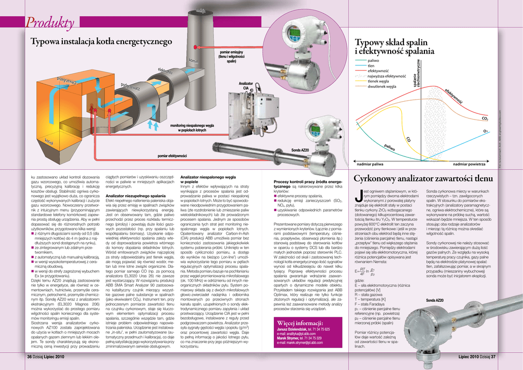 emisja Typowa instalacja kotła energetycznego pomiar emisyjny (tlenu i wilgotności spalin) –––– paliwo –––– tlen –––– efektywność elektro filtr przegrz ewacz najwyższa efektywność podgrz ewacz –––– tlenek węgla –––– dwutlenek węgla Analizator CIA ef ek ty wn oś ć CO2 monitoring niespalonego węgla w popiołach lotnych O2 oł CO koci pa liw o Sonda AZ20 pomiar efektywności nadmiar paliwa 36 Dzisiaj Lipiec 2010 –––– tlenek węgla –––– dwutlenek węgla spalanie stechiometryczne ciągłych pomiarów i uzyskiwaniu oszczędku zastosowano układ kontroli dozowania ności w paliwie w mniejszych aplikacjach gazu wzorcowego, co umożliwia automaenergetycznych. tyczną, precyzyjną kalibrację i redukcję kosztów obsługi. Stabilność ogniwa cyrkoAnalizator niezupełnego spalania nowego jest wyjątkowo duża, co ogranicza częstość wykonywanych kalibracji i zużycie Efekt niepełnego natlenienia paleniska objagazu wzorcowego. Nowoczesny przetworwia się przez emisję w spalinach związków nik z intuicyjnym menu (przypominającym zawierających niewykorzystaną energię. standardowe telefony komórkowe) zapewJest on obserwowany tam, gdzie paliwo nia prostą obsługę urządzenia. Aby w pełni przechodzi przez proces rozkładu termiczdopasować się do różnorodnych potrzeb nego (pirolizy) i powstają duże ilości gazoużytkowników, przygotowano kilka wersji: wych pozostałości (np. przy spalaniu lub współspalaniu biomasy). Uzyskanie odpon z różnymi długościami sondy od 0,5 (dla wiedniej efektywności spalania zależy wtemniejszych kotłów) do 4 m (jedna z najdy od doprowadzania powietrza wtórnego dłuższych sond dostępnych na rynku), do komory dopalania składników lotnych. n ze zintegrowanym lub zdalnym przeWśród emitowanych związków najczęściej twornikiem, za straty odpowiedzialny jest tlenek węgla, n z automatyczną lub manualną kalibracją, ale mogą pojawiać się również wodór, men w wersji wysokotemperaturowej z ceratan lub inne lotne związki organiczne. Dlamiczną obudową, tego pomiar samego CO (np. za pomocą n w wersji do strefy zagrożonej wybuchem analizatora EL3020 Uras 26) nie zawsze Ex (w przygotowaniu). jest wystarczający. W rozwiązaniu produkcji Dzięki temu AZ20 znajdują zastosowanie ABB SMA Smart Analyzer 90 zastosowanie tylko w energetyce, ale również w ceno katalityczny czujnik mierzący wszystmentowniach, hutnictwie, przemyśle cerakie gazowe palne substancje w spalinach micznym, petrochemii, przemyśle chemicz(jako ekwiwalent COe). Instrument ten, przy nym itp. Sondę AZ20 wraz z analizatorem ekstrakcyjnym (EL3020 Magnos 206) jednoczesnym pomiarze zawartości tlenu można wykorzystać do prostego pomiaru na czujniku cyrkonowym, staje się kluczowilgotności spalin koniecznego dla systewym elementem optymalizacji procesu mów monitoringu emisji spalin. spalania, szczególnie wszędzie tam, gdzie Siostrzana wersja analizatorów cyrkoistnieje problem odpowiedniego napowienowych AZ100 została zaprojektowana trzania paleniska. Urządzenie jest instalowado użycia w kotłach o mniejszych mocach ne „in-situ”, w pełni zautomatyzowane (auopalanych gazem ziemnym lub lekkim oletomatyczny przedmuch i kalibracja), co daje –––– paliwo –––– tlen jem. Te sondy charakteryzują się ekonopełną satysfakcję jego wykorzystywania przy –––– efektywnośćzminimalizowanym serwisie obsługowym. miczną ceną inwestycji przy prowadzeniu najwyższa efektywność Analizator niespalonego węgla w popiele Innym z efektów wpływających na straty wynikające z procesów spalania jest odprowadzanie paliwa w postaci nieopalonej w popiołach lotnych. Może to być spowodowane nieodpowiednim przygotowaniem paliwa (złe rozdrobnienie lub zmieszanie paliw wieloskładnikowych) lub źle prowadzonym procesem spalania. Jednym ze sposobów ograniczania tych strat jest monitoring niespalonego węgla w popiołach lotnych. Opatentowany analizator Carbon-In-Ash (CIA) produkcji ABB umożliwia pomiar bez konieczności zastosowania jakiegokolwiek systemu pobierania próbki. Uniknięto w ten sposób cykliczności pomiaru, a dostęp do wyników na bieżąco („on-line”) umożliwia wykorzystanie tego pomiaru w pętlach regulacyjnych optymalizacji procesu spalania. Metoda pomiaru bazuje na pochłanianiu przez węgiel promieniowania mikrofalowego (ok. 100 MHz) w odróżnieniu od innych nieorganicznych składników pyłu. System pomiarowy składa się z dwóch mikrofalowych głowic-zwierciadeł nadajnika i odbiornika montowanych po przeciwnych stronach kanału spalin, uzupełnionych o sondy elektrodynamicznego pomiaru zapylenia i układ przetwarzający. Urządzenie CIA jest w pełni bezobsługowe, instalowane z reguły przed podgrzewaczem powietrza. Analizator przesyła sygnały gęstości węgla i popiołu (g/m3) oraz procentowej zawartości węgla. Daje to pełną informację o jakości lotnego pyłu, co ma znaczenie przy jego późniejszym wykorzystaniu. Procesy kontroli pracy źródła energetycznego są nakierowywane przez kilka kryteriów: n efektywne procesy spalania, n redukcję emisji zanieczyszczeń (SO2, NOx, pyłu), n uzyskiwanie odpowiednich parametrów procesowych. Prezentowane pomiary dotyczą pierwszego z wymienionych kryteriów. Łącznie z pomiarami podstawowymi (temperatury, ciśnienia, przepływów, obserwacji płomienia itp.) stanowią podstawę do sterowania kotłów w oparciu o systemy DCS lub dla bardzo małych jednostek poprzez sterowniki PLC. W zależności od skali i zastosowanej technologii kotła energetycznego ilość sygnałów wynosi od kilkudziesięciu do nawet kilku tysięcy. Poprawę efektywności procesu spalania gwarantuje wdrażanie zaawansowanych układów regulacji predykcyjnej opartych o dynamiczne modele obiektu. Przykładem takiego rozwiązania jest ABB Optimax, który realizuje nie tylko funkcje złożonych regulacji i optymalizacji, ale zapewnia t